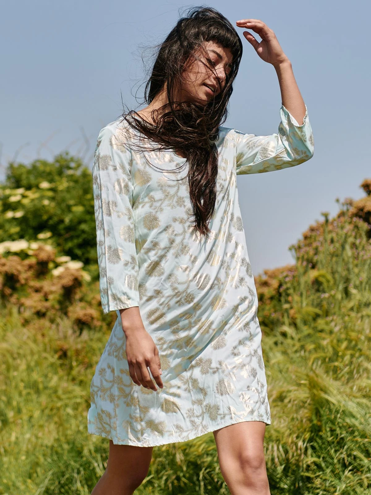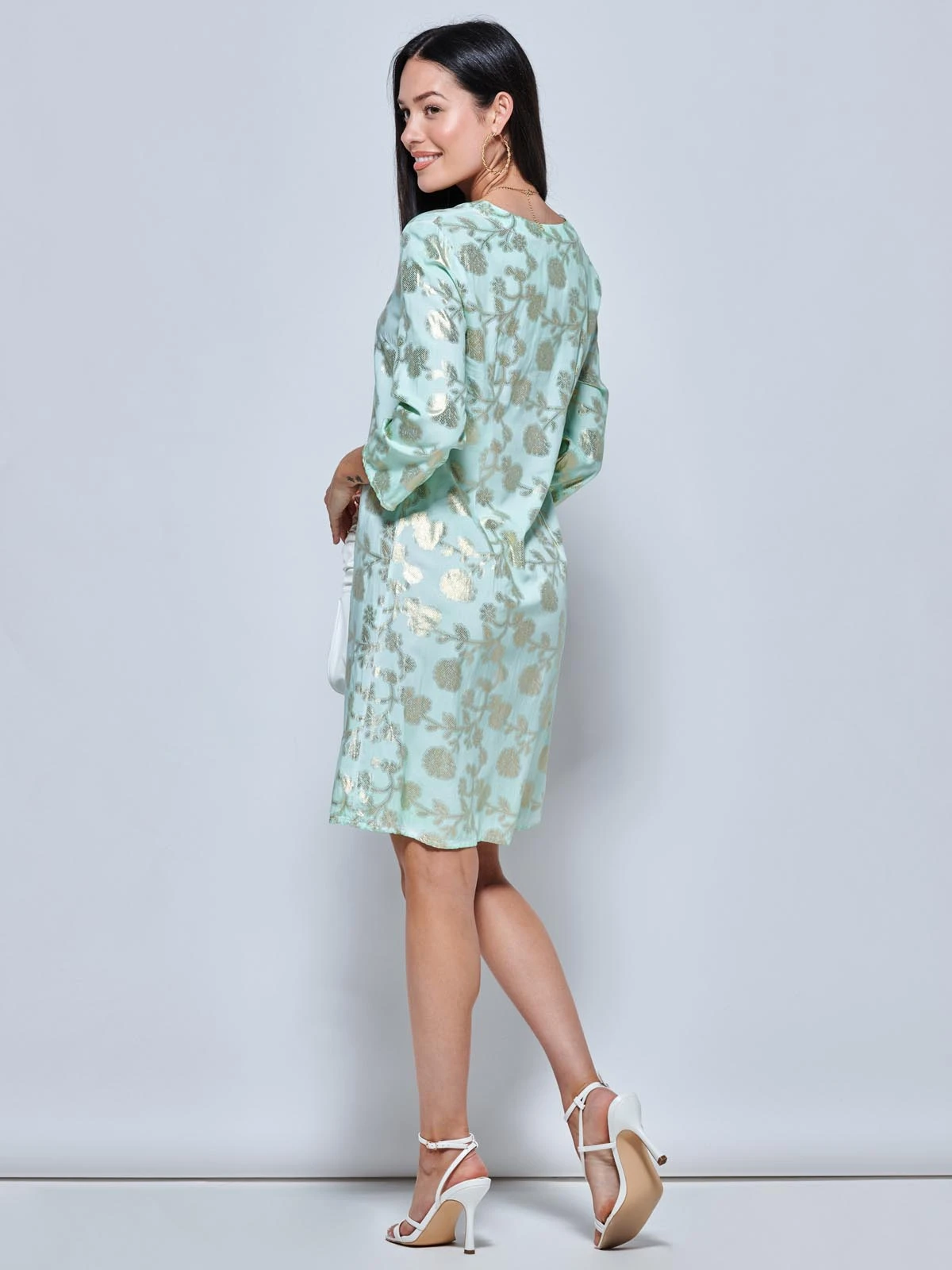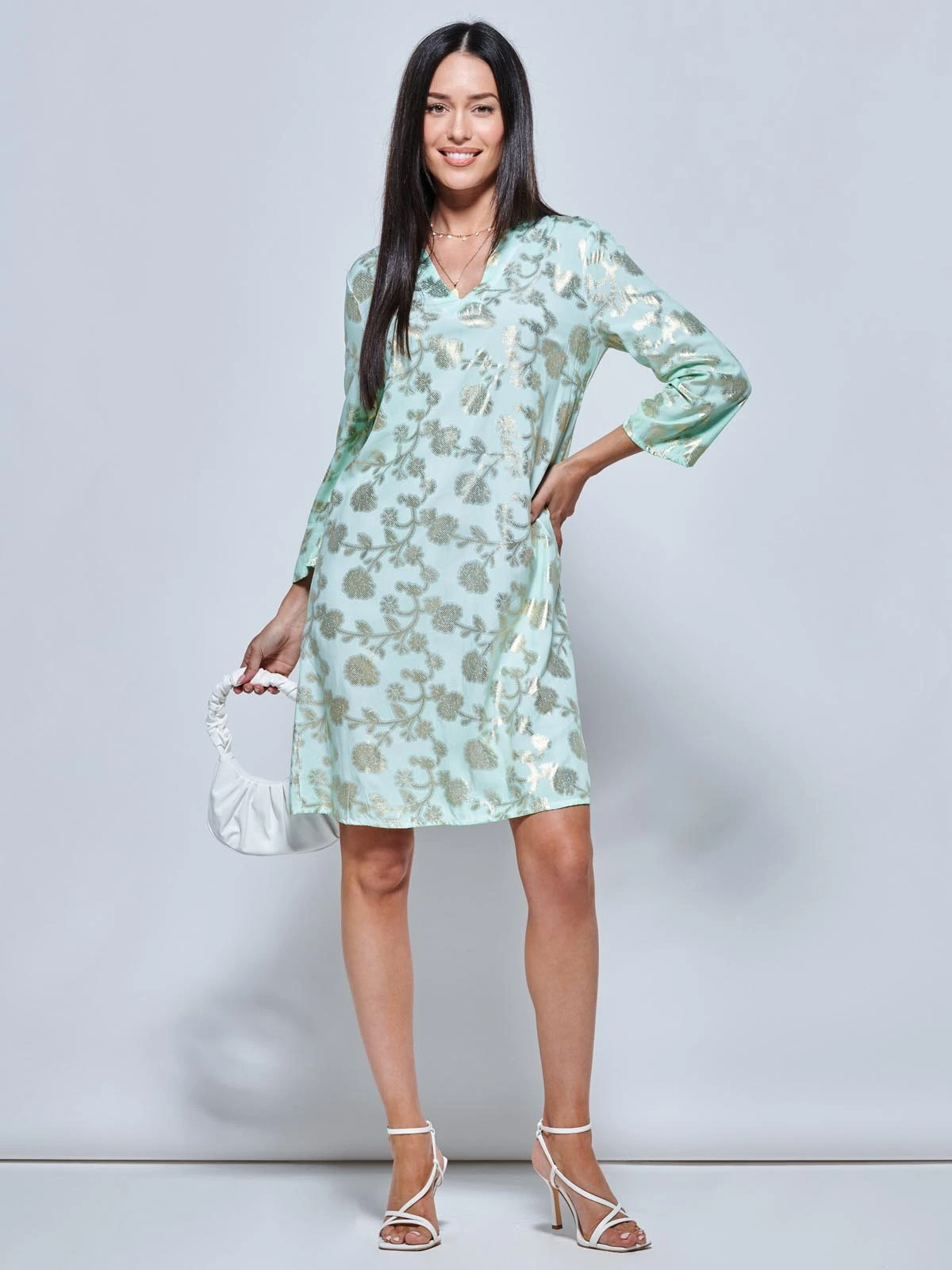 Get holiday ready with this gold effect floral abstract print midi tunic dress from Jolie Moi. The dress features 3/4 sleeves and a v-neckline that falls just just below the knee. Style it with a pair of strappy sandals to complete the look.