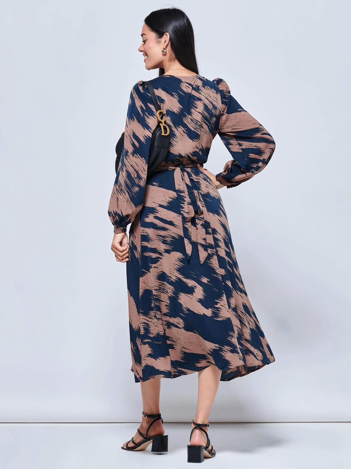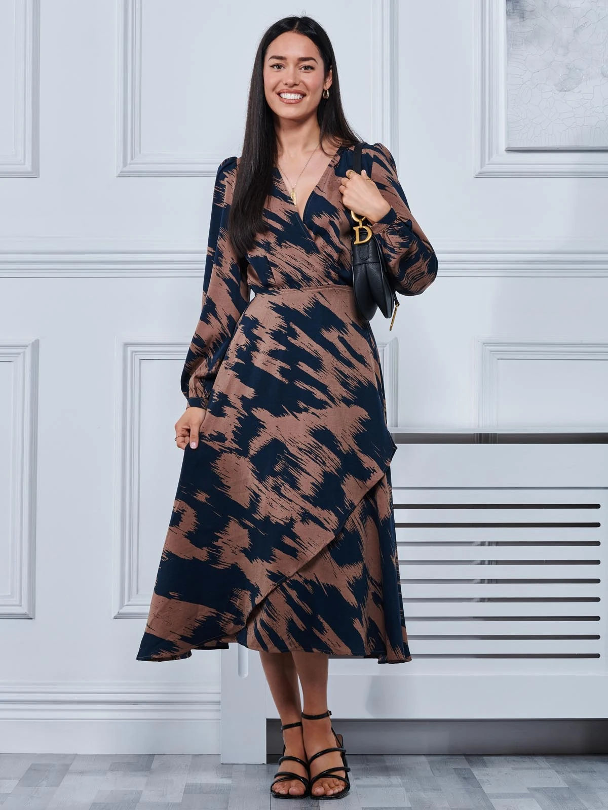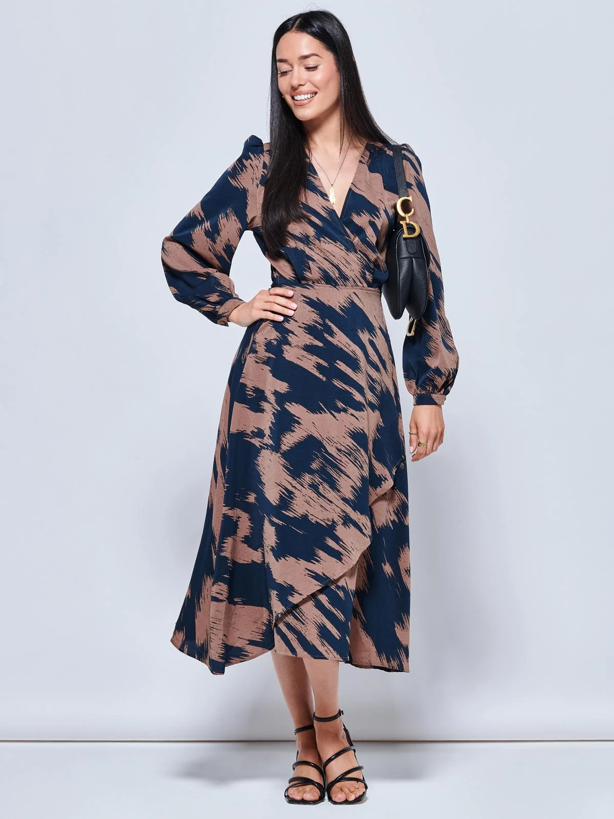 Add a touch of elegance to your wardrobe this season with this wrapped midi dress from Jolie Moi. Decorated with a bold abstract pattern print. Crafted from 100% polyester for comfort and movement. The dress features long sleeves, and a fully wrapped construction that makes a true to fit silhouette.