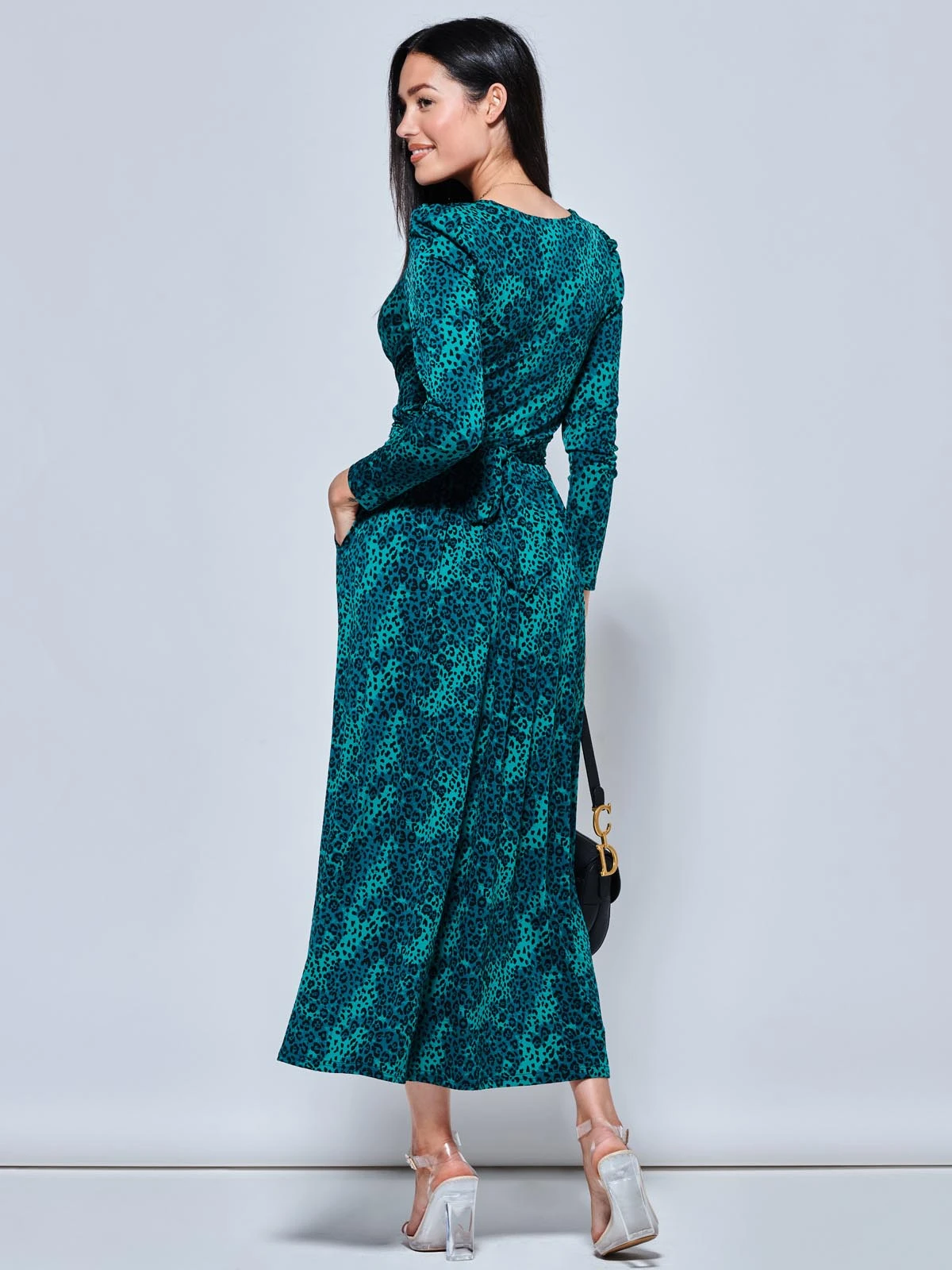 Style colour back into your wardrobe with this striking green animal printed maxi dress. Crafted from our signature non-static and crease-proof jersey material. The dress features a v-neckline with a self-tie ruched waist that gives you a custom fitted silhouette, designed with long sleeves and ideal side pockets.Â