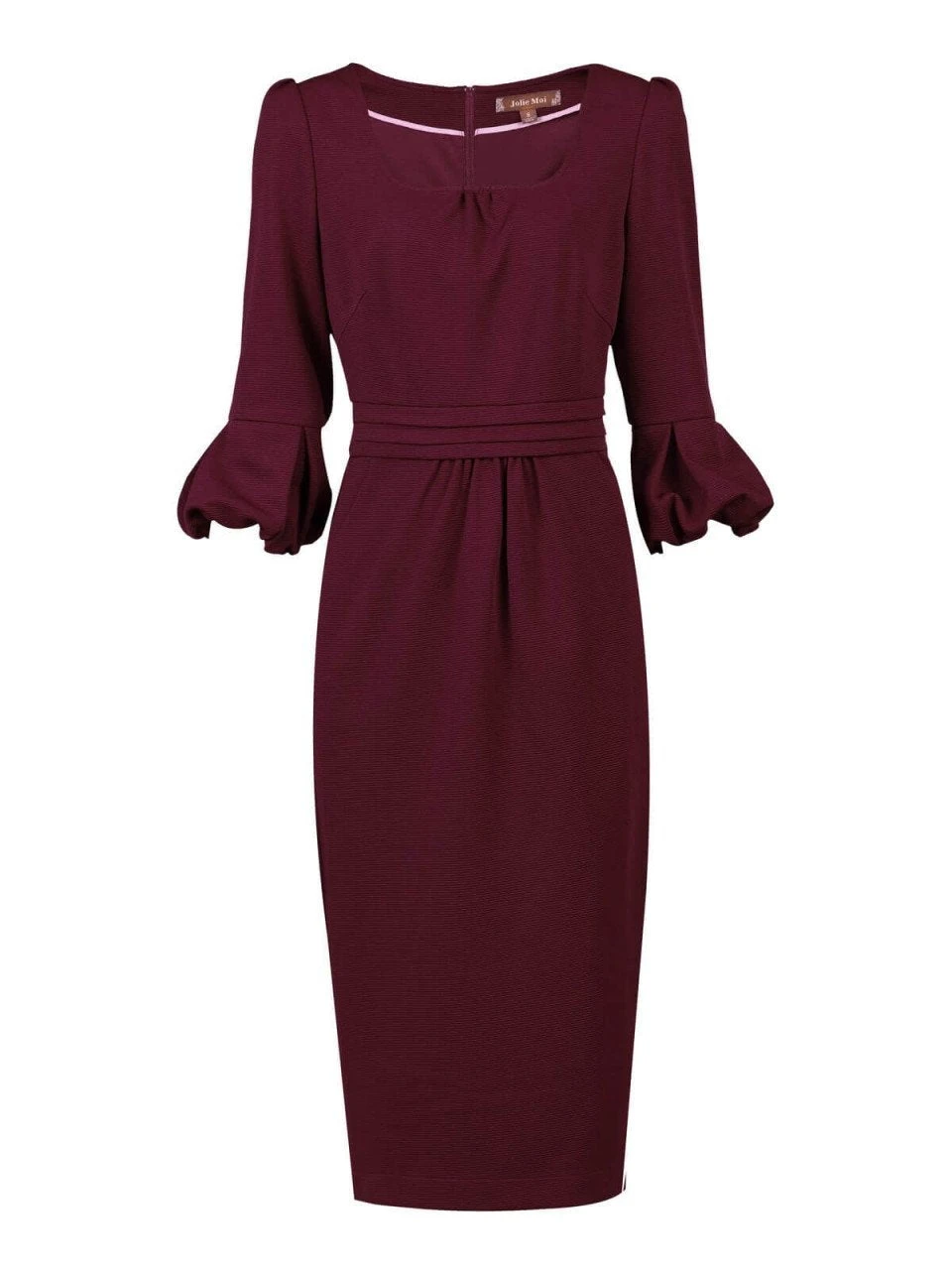 Crafted from stripe textured jersey fabric, this dress boasts a flattering boat neckline with contrast trim detailing, ruched waistline and practical side pockets. It is bound to win complements with its trendy 3/4 length balloon sleeve design and demure appeal making this dress suitable for work or weekend.