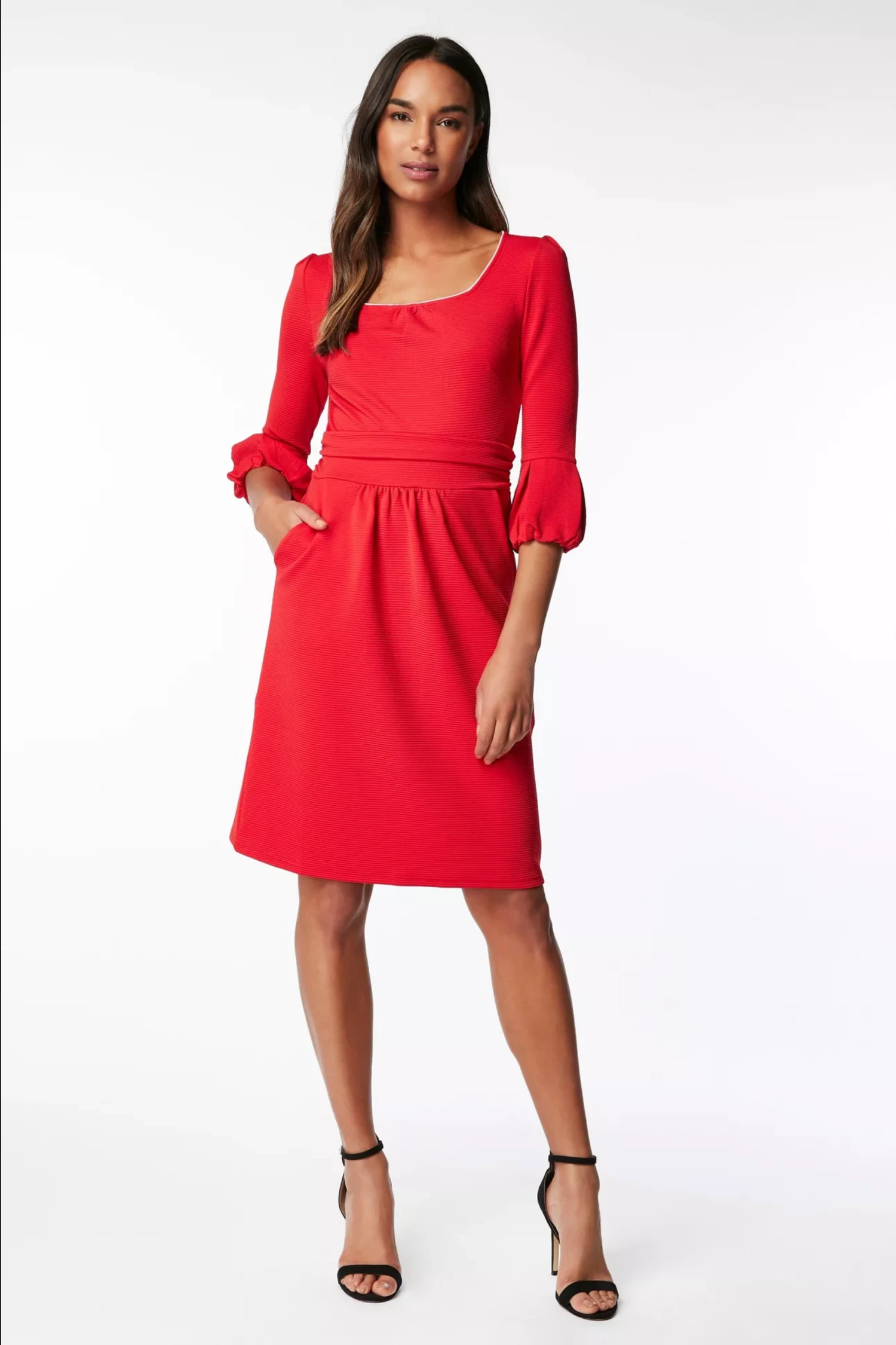 Crafted from stripe textured jersey fabric, this dress boasts a flattering boat neckline with contrast trim detailing, ruched waistline and practical side pockets. It is bound to win complements with its trendy 3/4 length balloon sleeve design and demure appeal making this dress suitable for work or weekend.