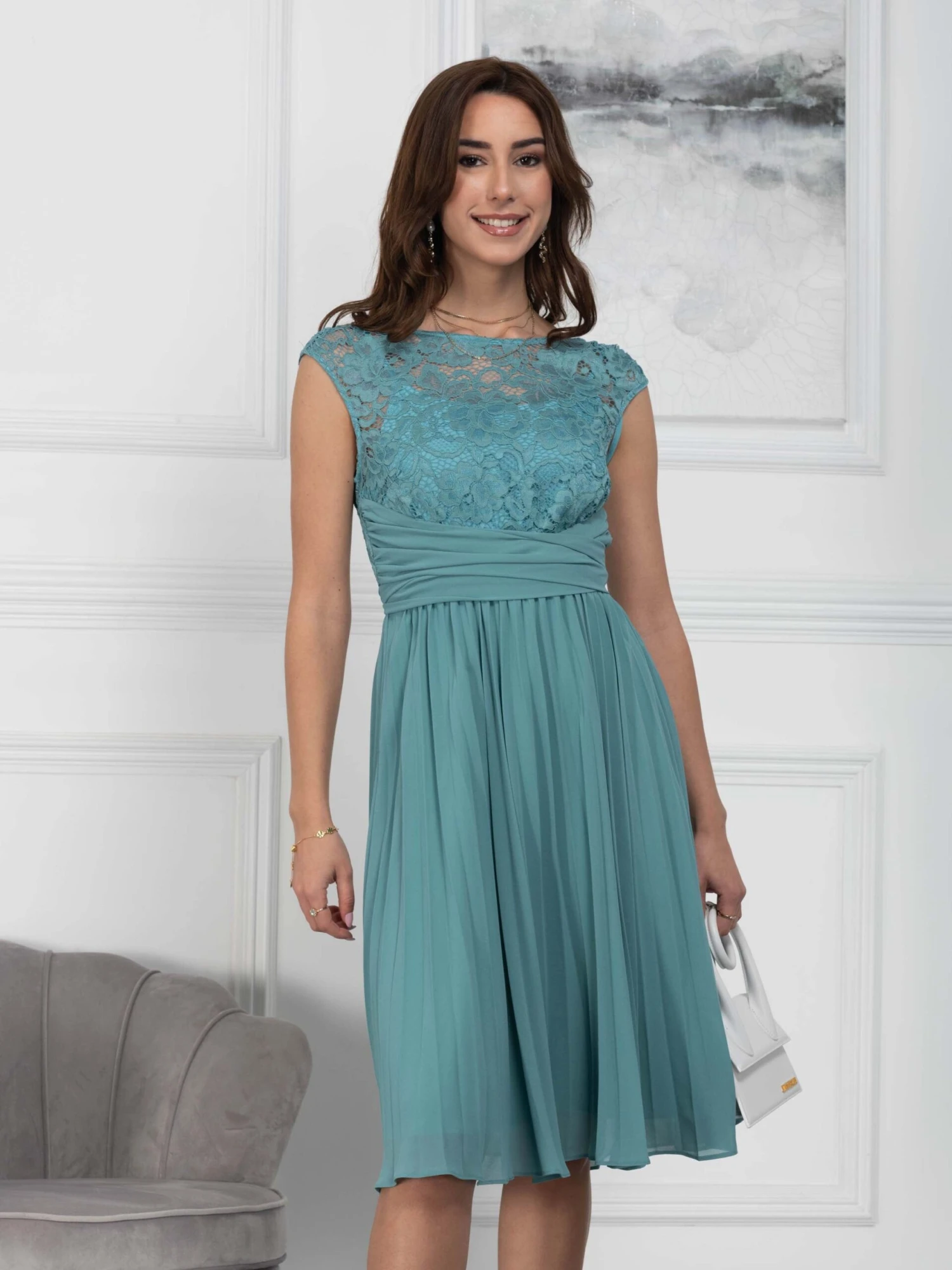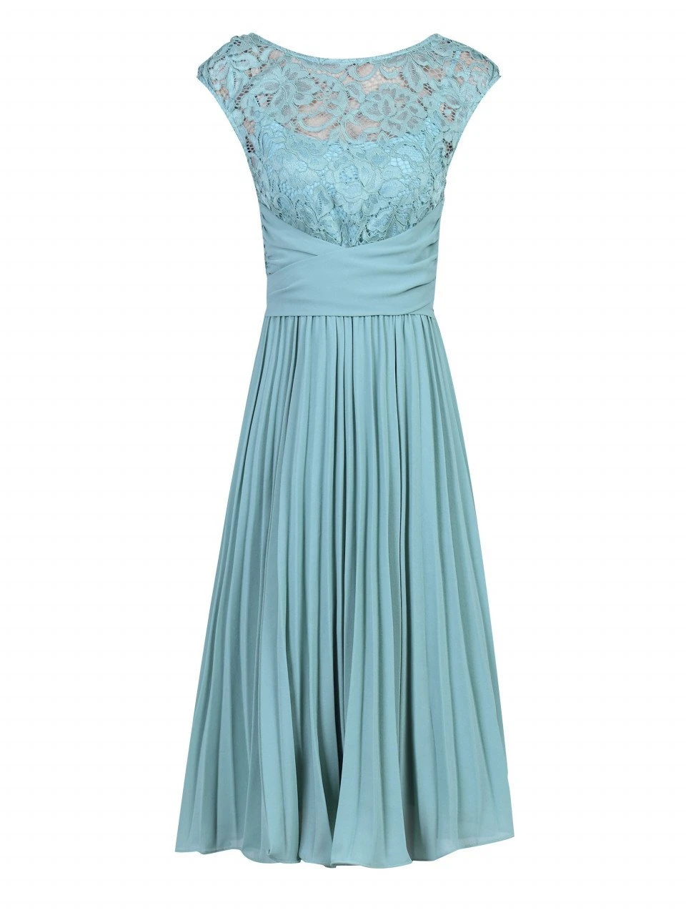 Crafted from soft stretchy lace and lightweight chiffon, lined for optimum comfort, this flared dress comes with a fitted cordon net lace bodice and a pleated midi length skirt. Completed with crossover twist self-fabric belt and elasticated waist.Â