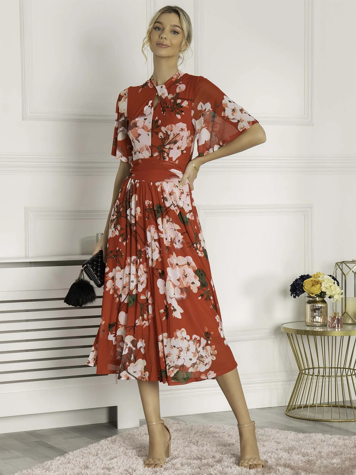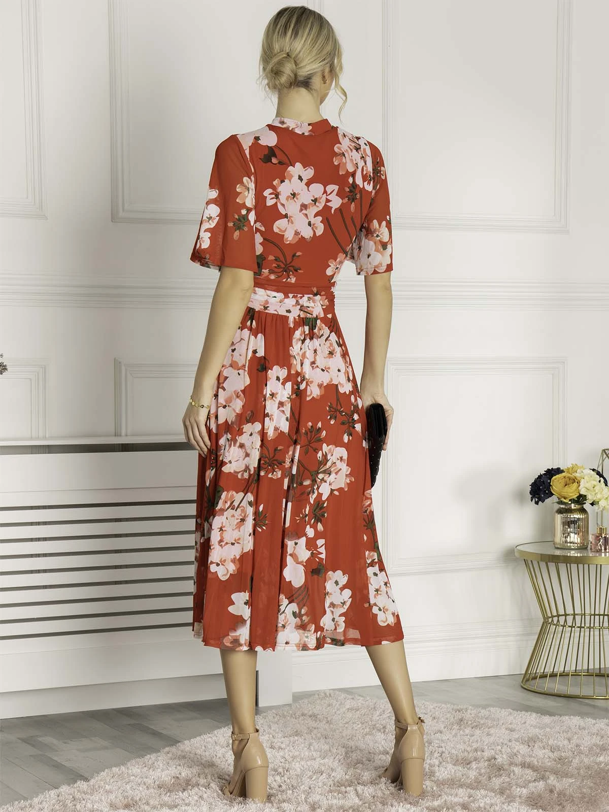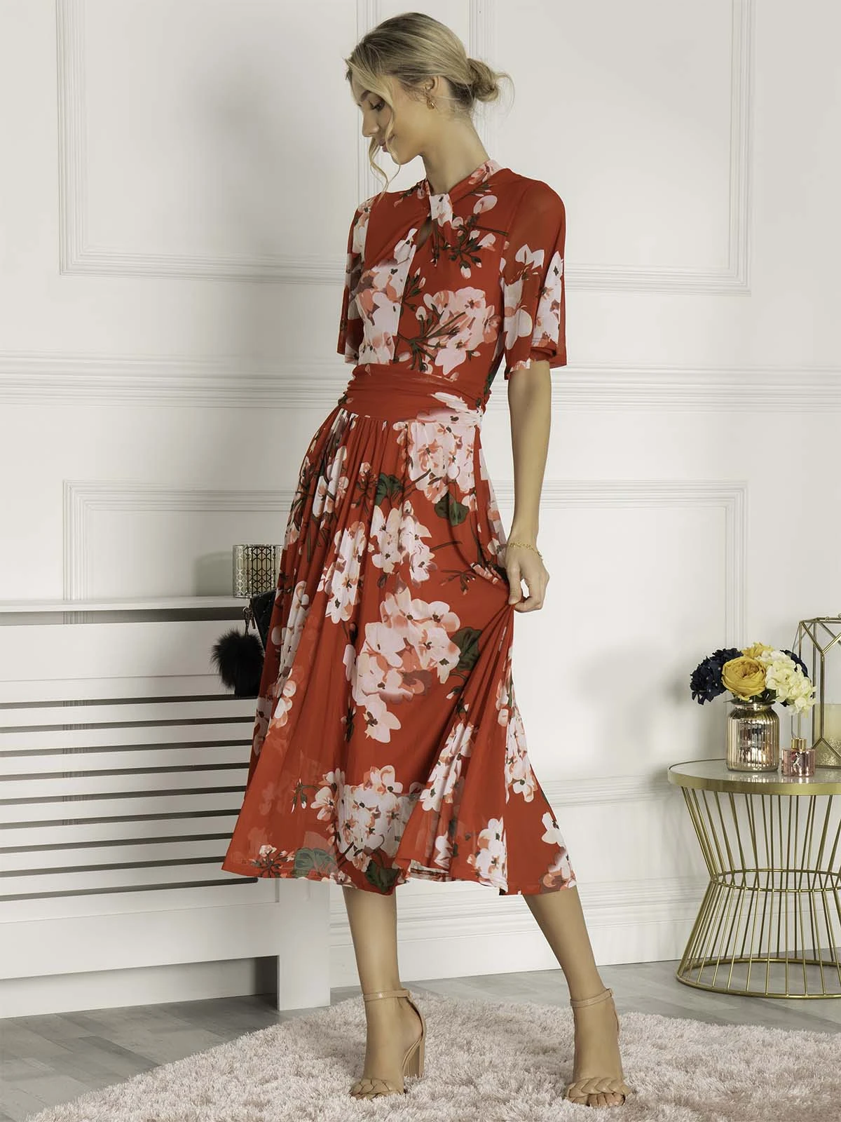 Flaring out at the hem for added movement, this midi dress by Jolie Moi boasts a floral flourish for added appeal. Accentuating the figure with a wrap over front and short sleeves, it is the epitome of summer chic.