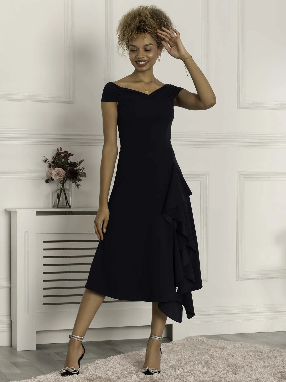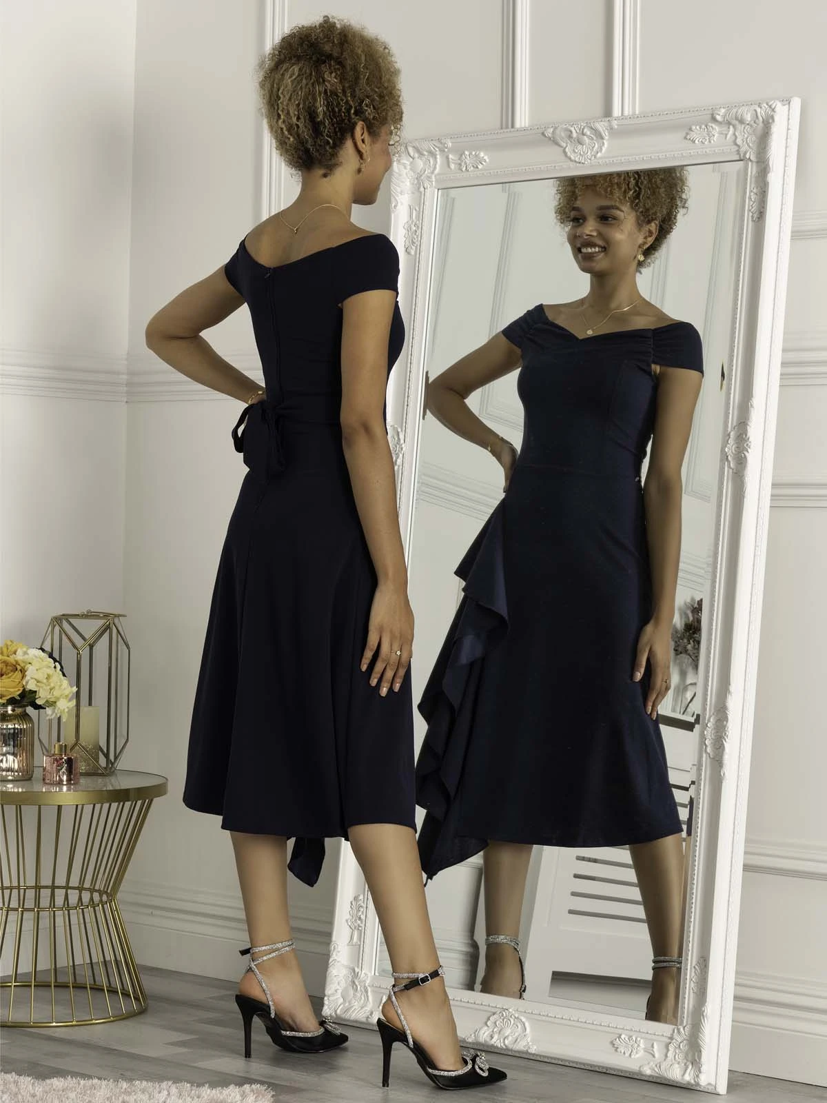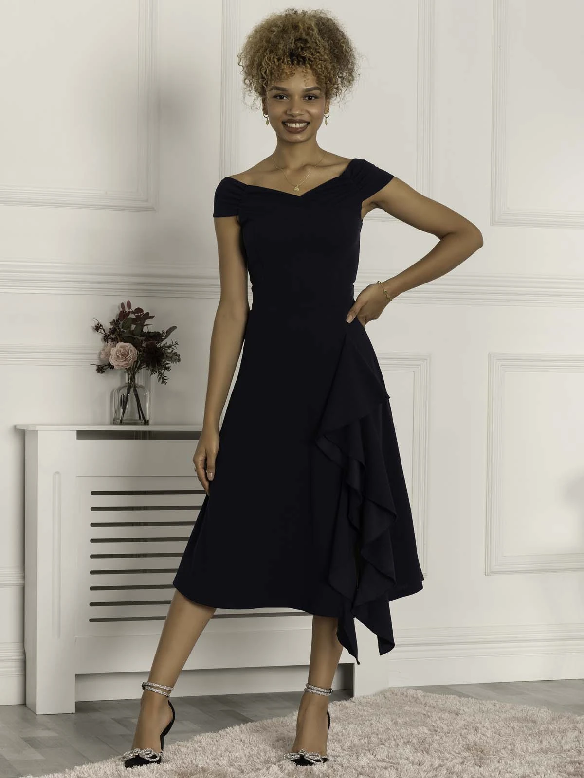Bringing you a sense of elegance and style combined into one beautiful dress. The Desiree flare dress is made from a stretchy knitted material for all day comfort. It features a self tie belt at the waist to cinch in your waist without being too tight. The sleeves drape just off the shoulder opening up the gorgeous subtle v-neckline. To add an extra touch of style there is a frilly accent on the front of the dress. Match with a pair of heels to be the centre of attention at your next event.
