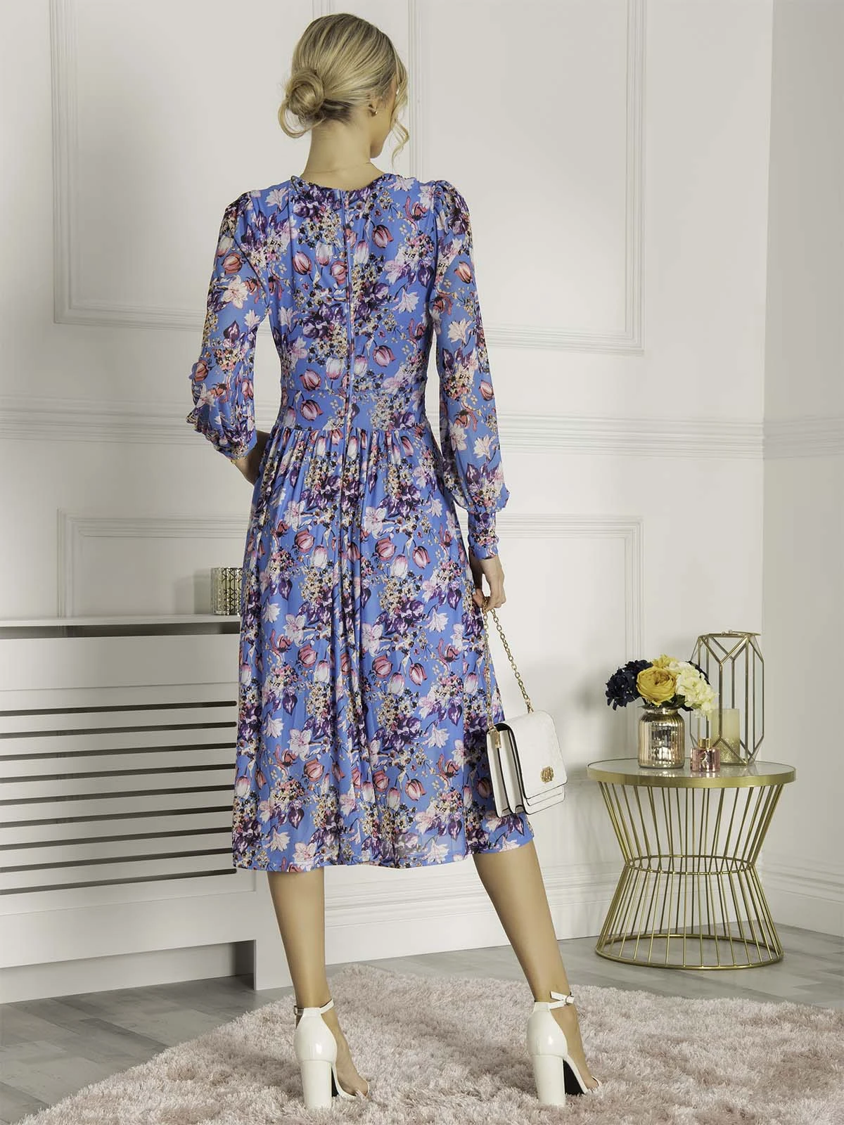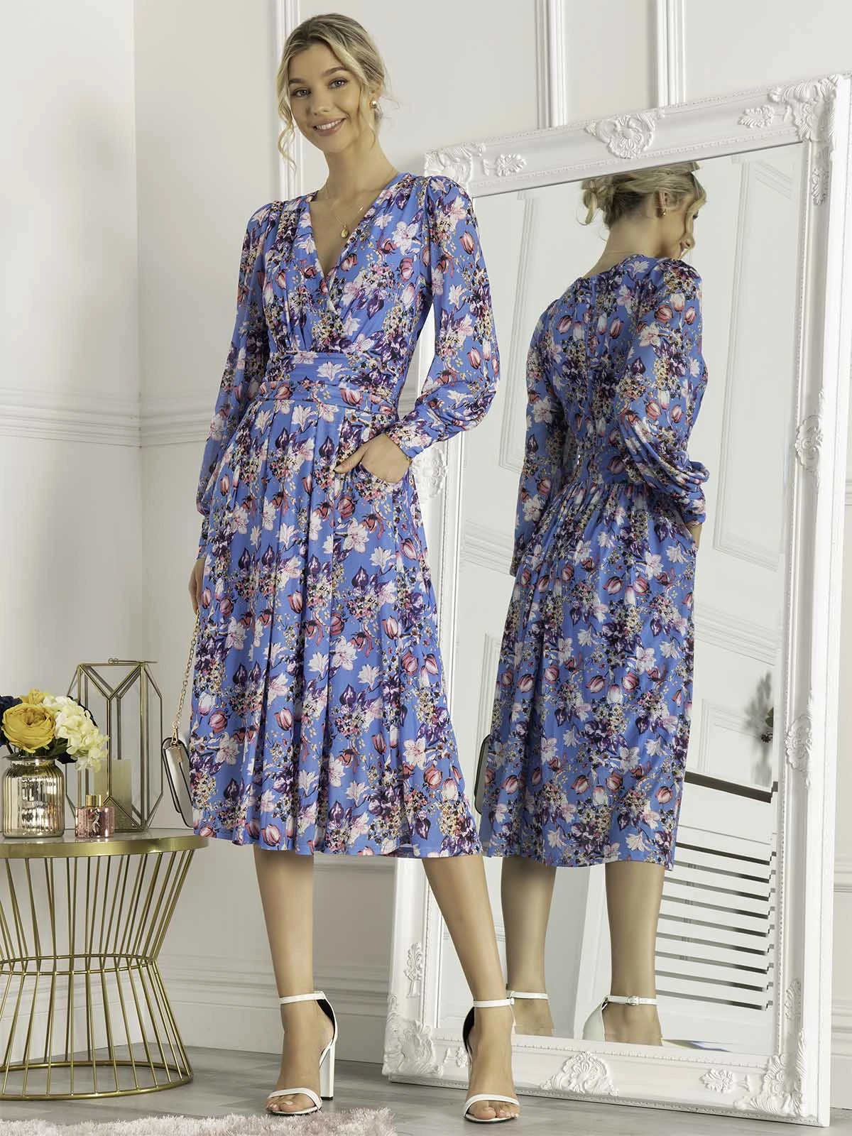 Bring a feminine edge to your occasion-wear with this stylish midi dress from Jolie Moi. Beautifully updated with a watercolour floral print, it is made from lightweight mesh fabric that is soft-to-touch and smooth. With an elegant v-neckline, short floaty long sleeves and a flared skirt that falls just below the knee, it can be paired with heels at your next special event.