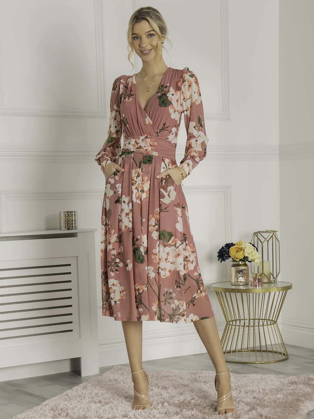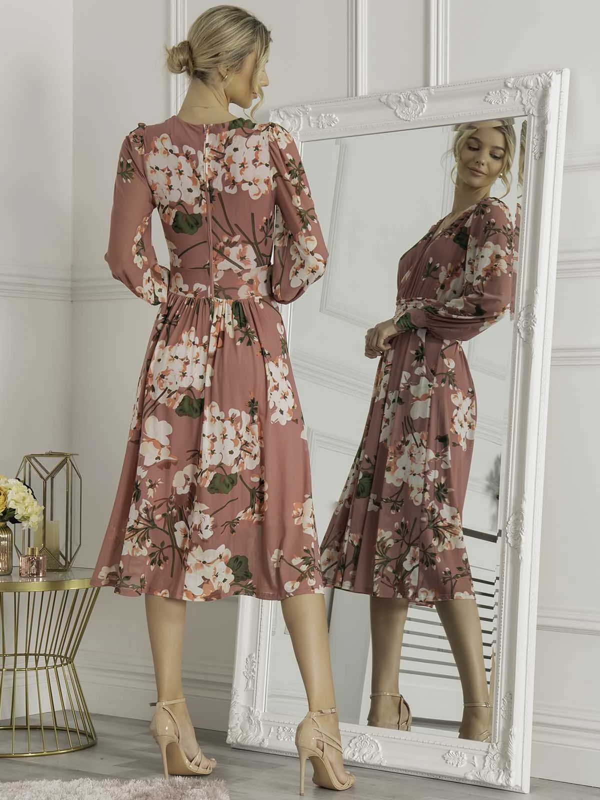 Bring a feminine edge to your occasion-wear with this stylish midi dress from Jolie Moi. Beautifully updated with a watercolour floral print, it is made from lightweight mesh fabric that is soft-to-touch and smooth. With an elegant v-neckline, short floaty long sleeves and a flared skirt that falls just below the knee, it can be paired with heels at your next special event.