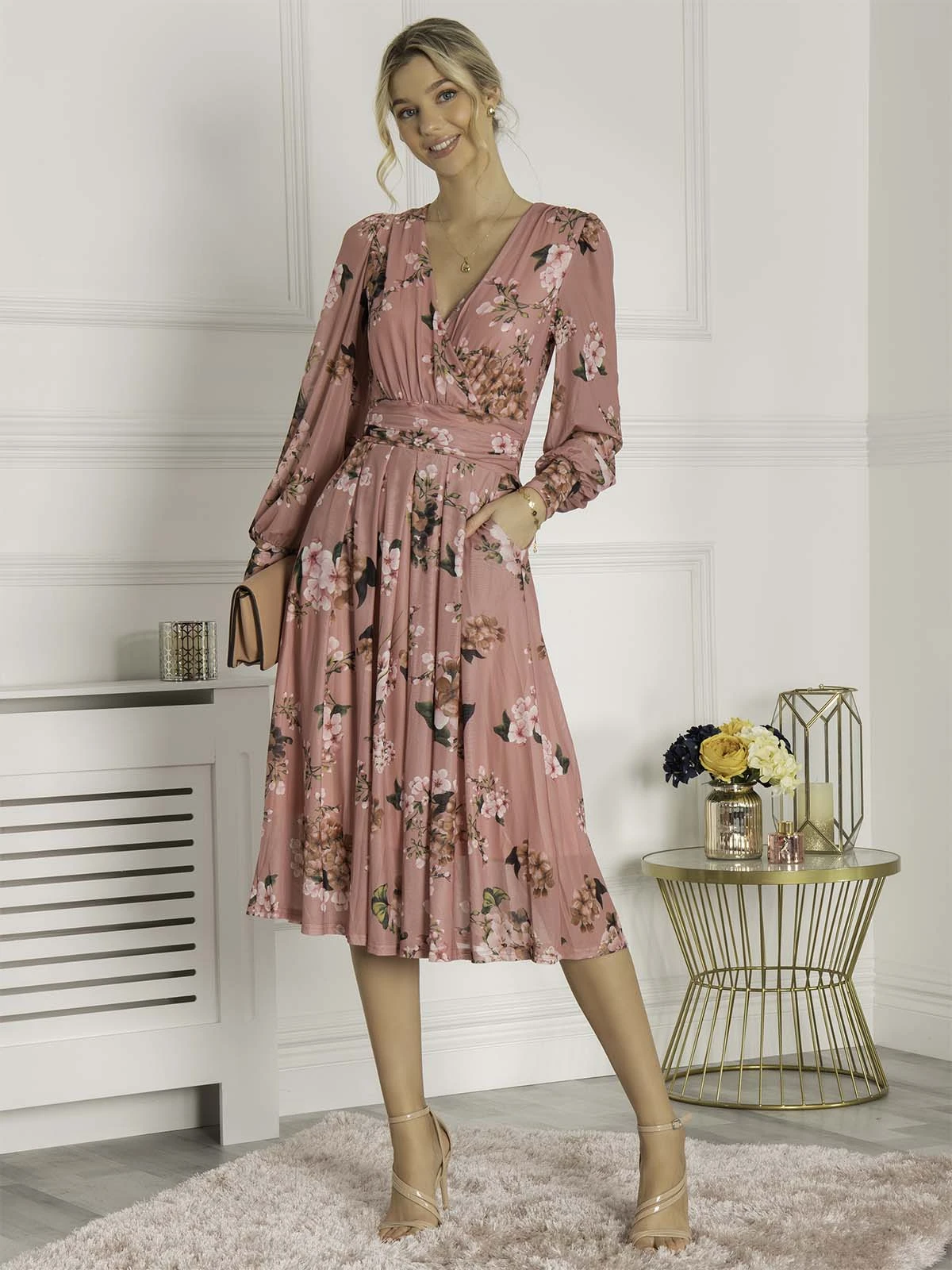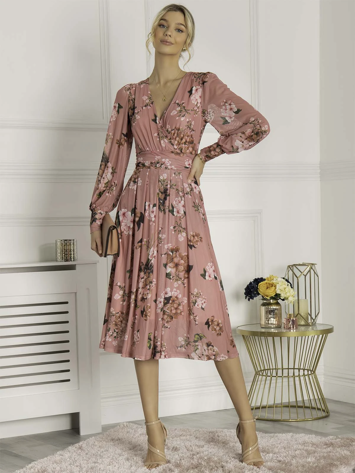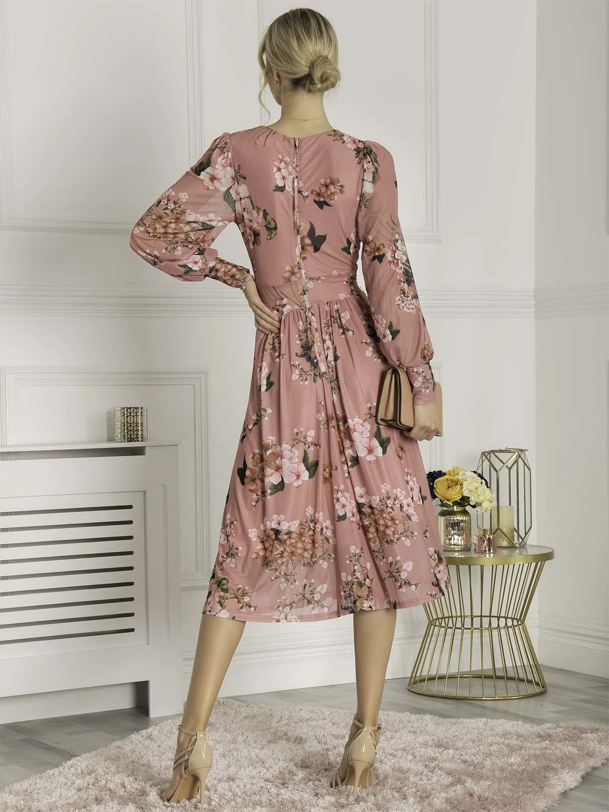 Bring a feminine edge to your occasion-wear with this stylish midi dress from Jolie Moi. Beautifully updated with a watercolour floral print, it is made from lightweight mesh fabric that is soft-to-touch and smooth. With an elegant v-neckline, short floaty long sleeves and a flared skirt that falls just below the knee, it can be paired with heels at your next special event.