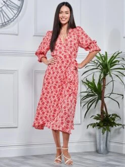Dress to impress this season with the gorgeous Ellie wrapped midi dress from Jolie Moi. Complimented by a bold geometric pattern print, elbow length ruched puff sleeves, and a high low wrapped hemline that falls just below the knees. Pair it with strappy sandals to complete the perfect summer look.
