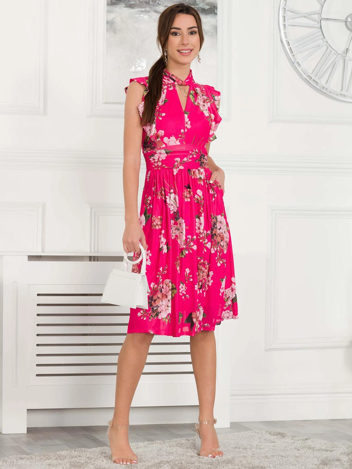 Made from a smooth mesh fabric and cut to a generous skater fit, it is designed with a smart turtleneck with twisted collar and keyhole cut out detailing at the front . Finished with ruffle shoulders and side pockets for easy wear and a nipped-in ruched waistband to create a smooth shape and falls to the knee adding an elegant flow. It would be a beautiful choice for a wedding guest outfit or summer socials.Â