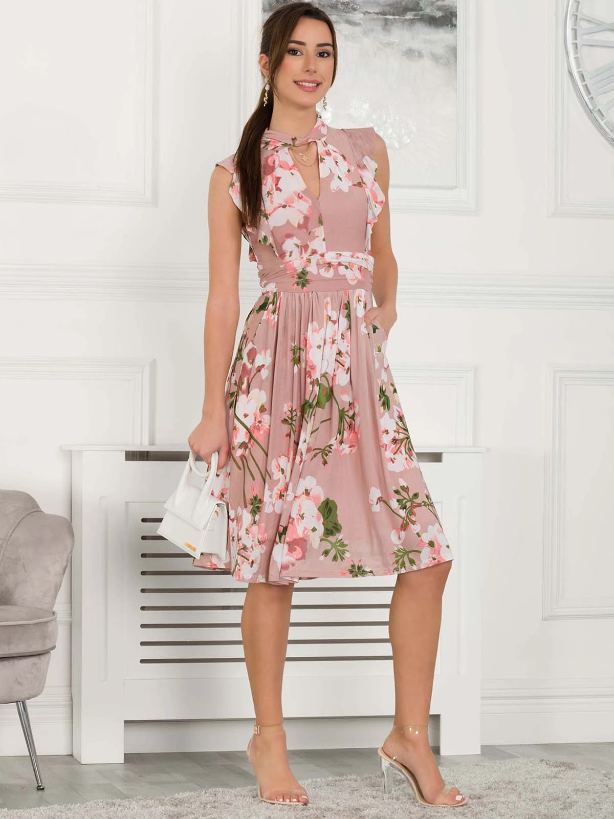 Made from a smooth mesh fabric and cut to a generous skater fit, it is designed with a smart turtleneck with twisted collar and keyhole cut out detailing at the front . Finished with ruffle shoulders and side pockets for easy wear and a nipped-in ruched waistband to create a smooth shape and falls to the knee adding an elegant flow. It would be a beautiful choice for a wedding guest outfit or summer socials.