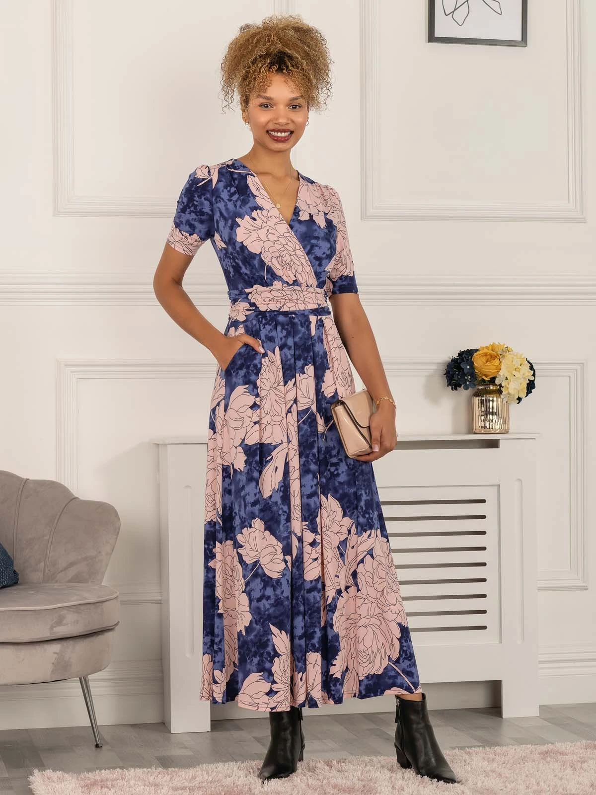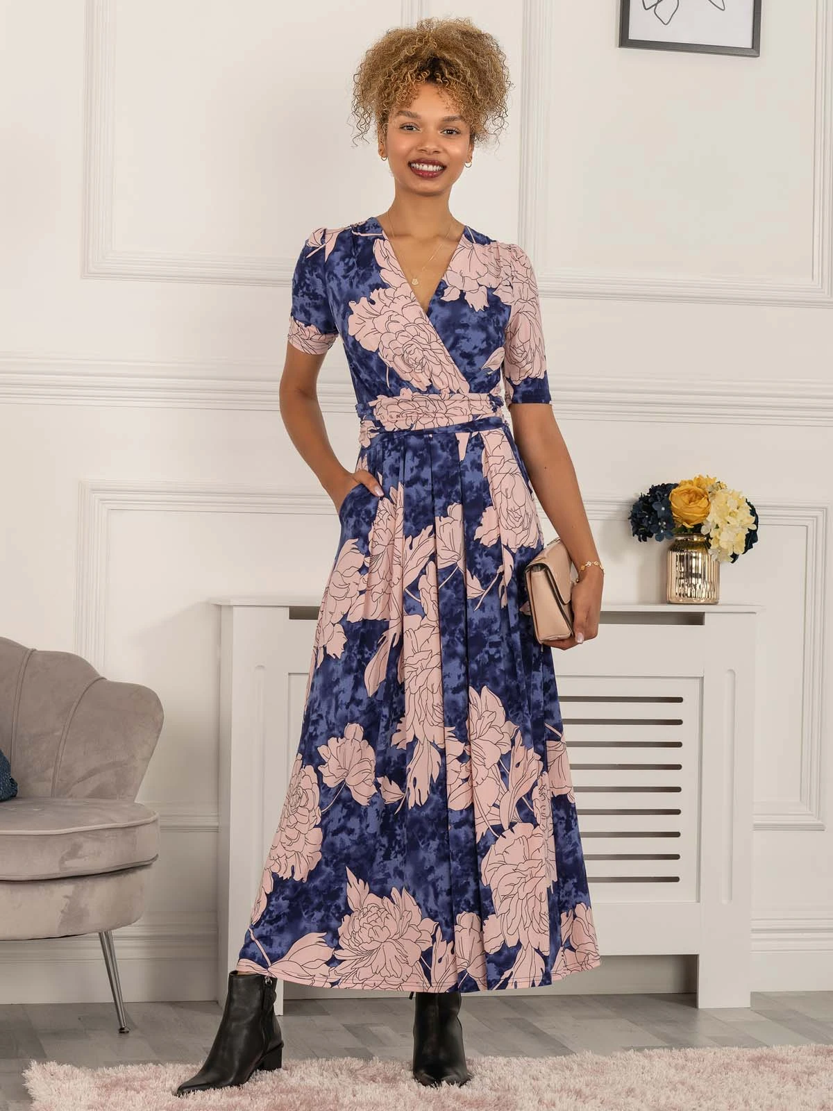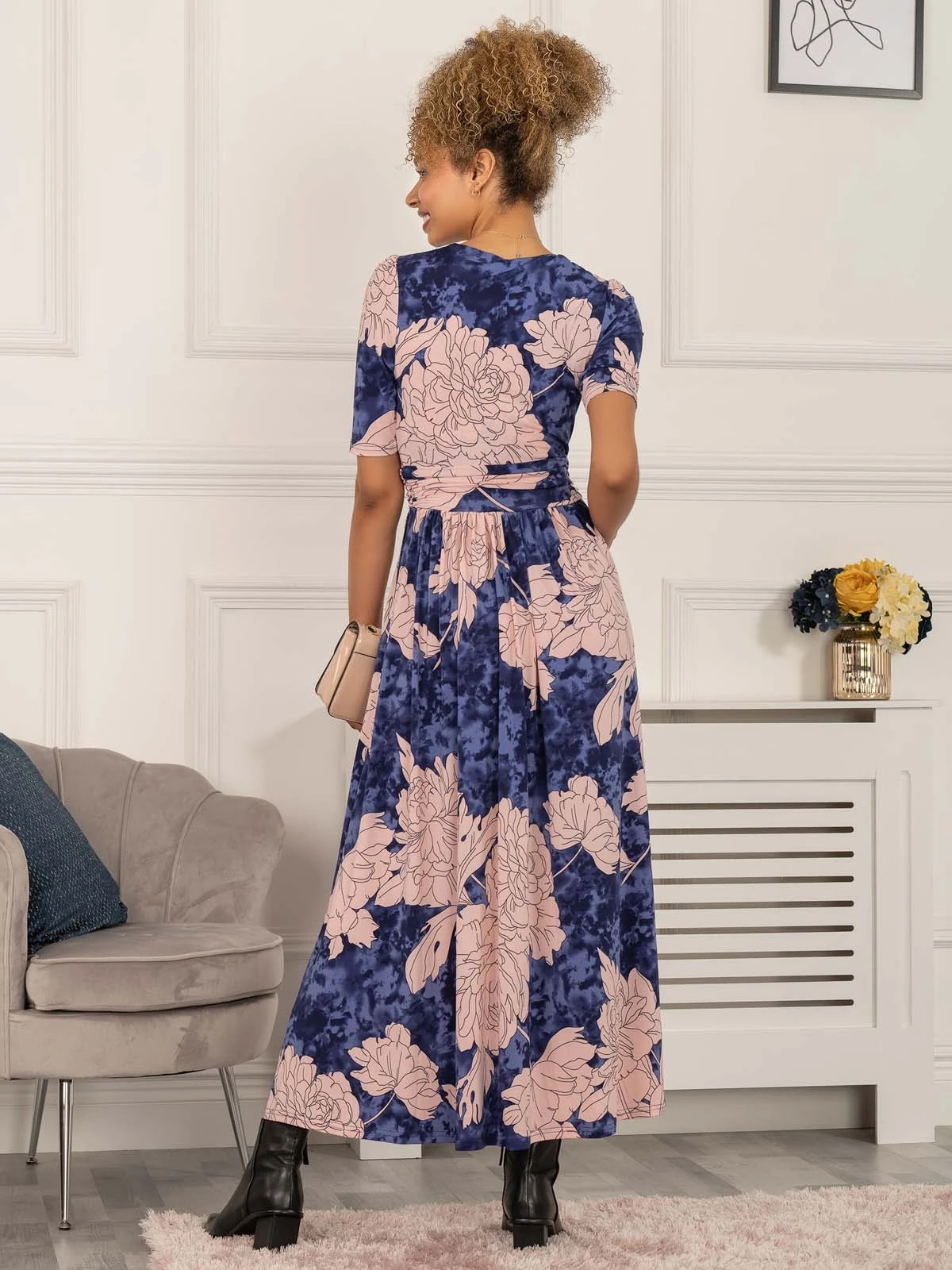 Perfect addition to any wardrobe this season. The Evita maxi dress is constructed from our signature non-static and crease proof jersey fabric. Doused with a beautiful abstract floral print. The dress features, short sleeves, a wrapped v-neck line and a ruched elasticated waistband for added comfort. Match with a pair of trainers or sandals for those casual days out.