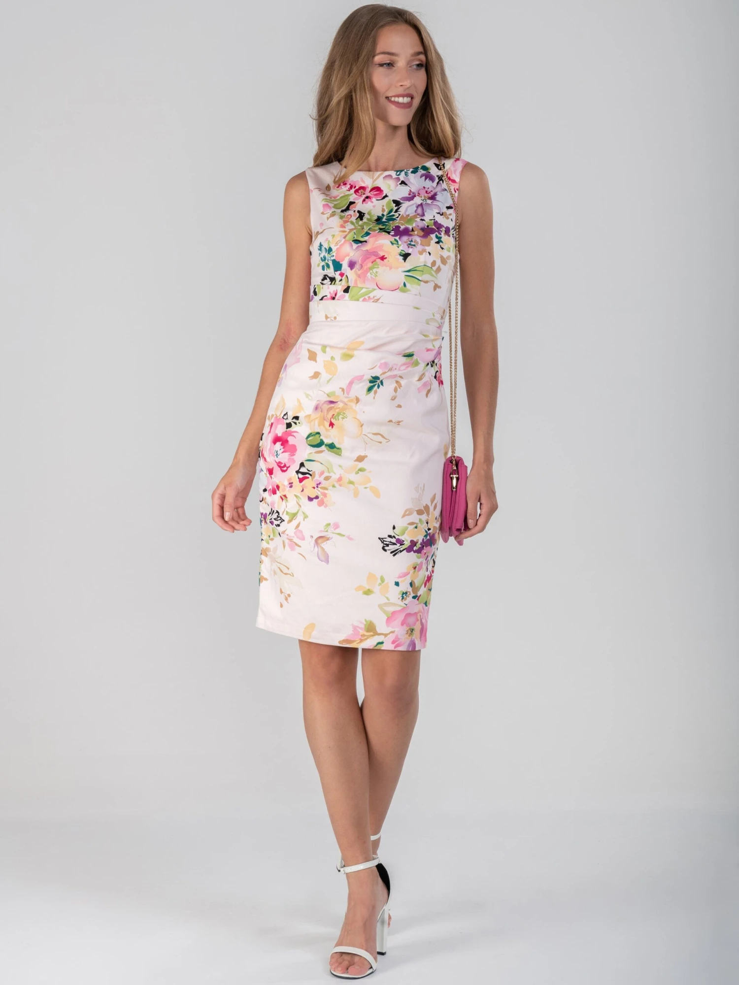 Elegantly designed with a flattering ruched silhouette, this pretty dress is constructed in a stretch woven fabric, featuring a bold floral print, a round neckline and an exposed center back zip.