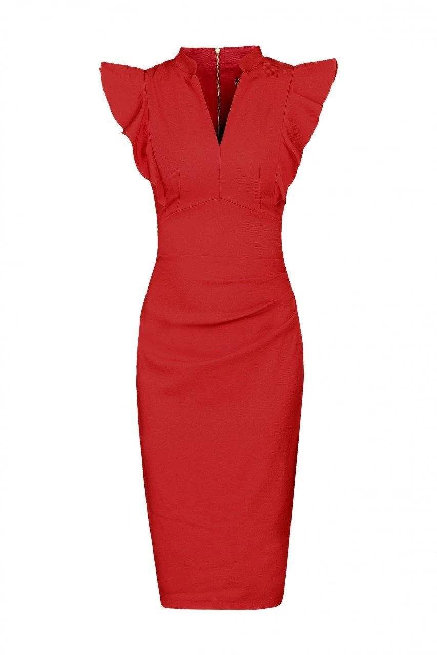 Crafted from a lightweight woven fabric for a pretty drape, this form-fitting style is cut to a versatile knee length, features a classic V neckline with a sleek stand collar, exposed metal zip fastening to the reverse and on-trend frilled sleeves. Fully lined for seamless wear.Â