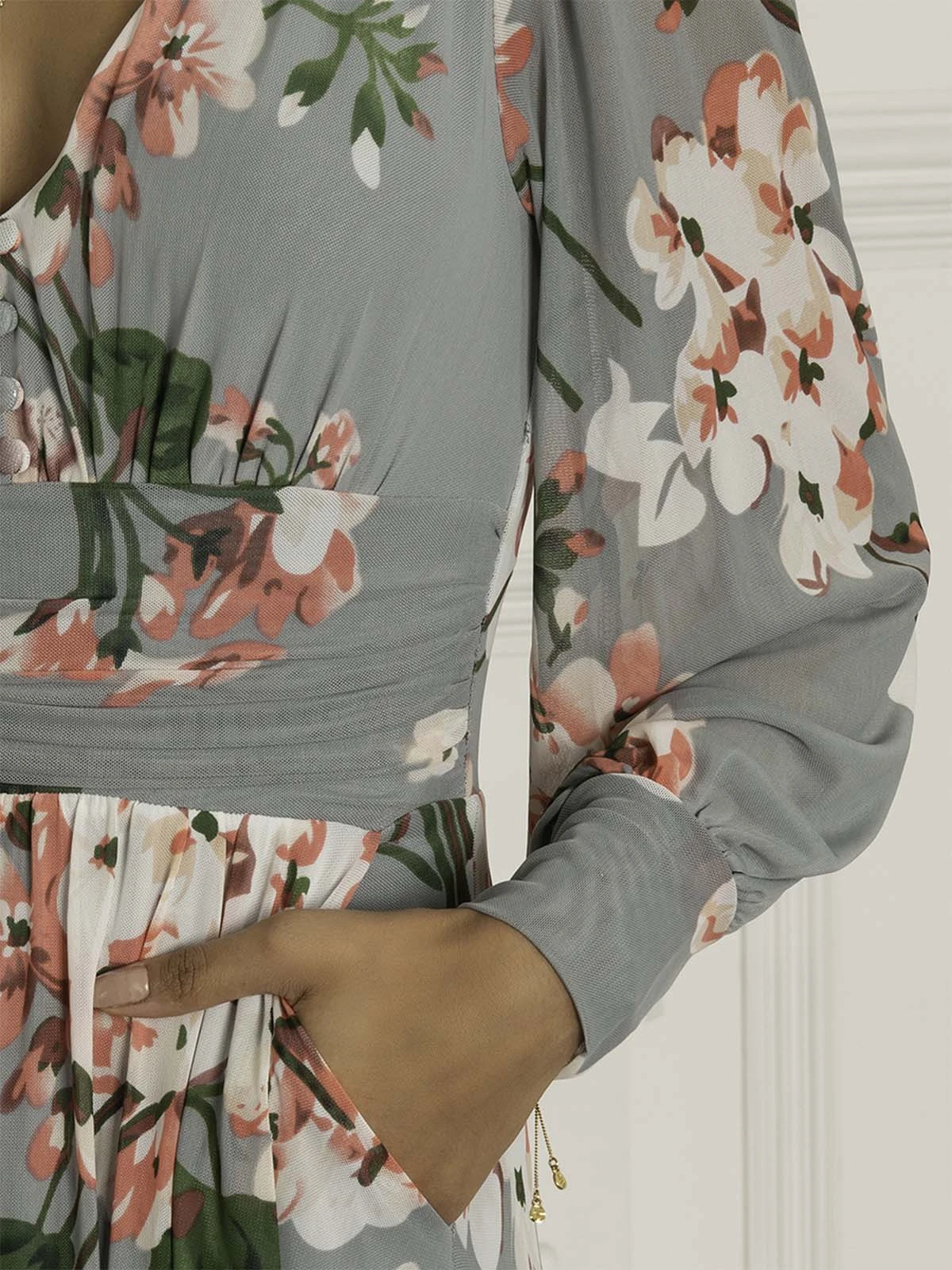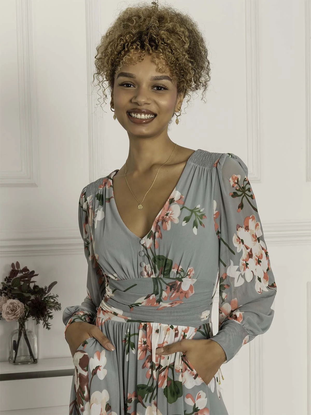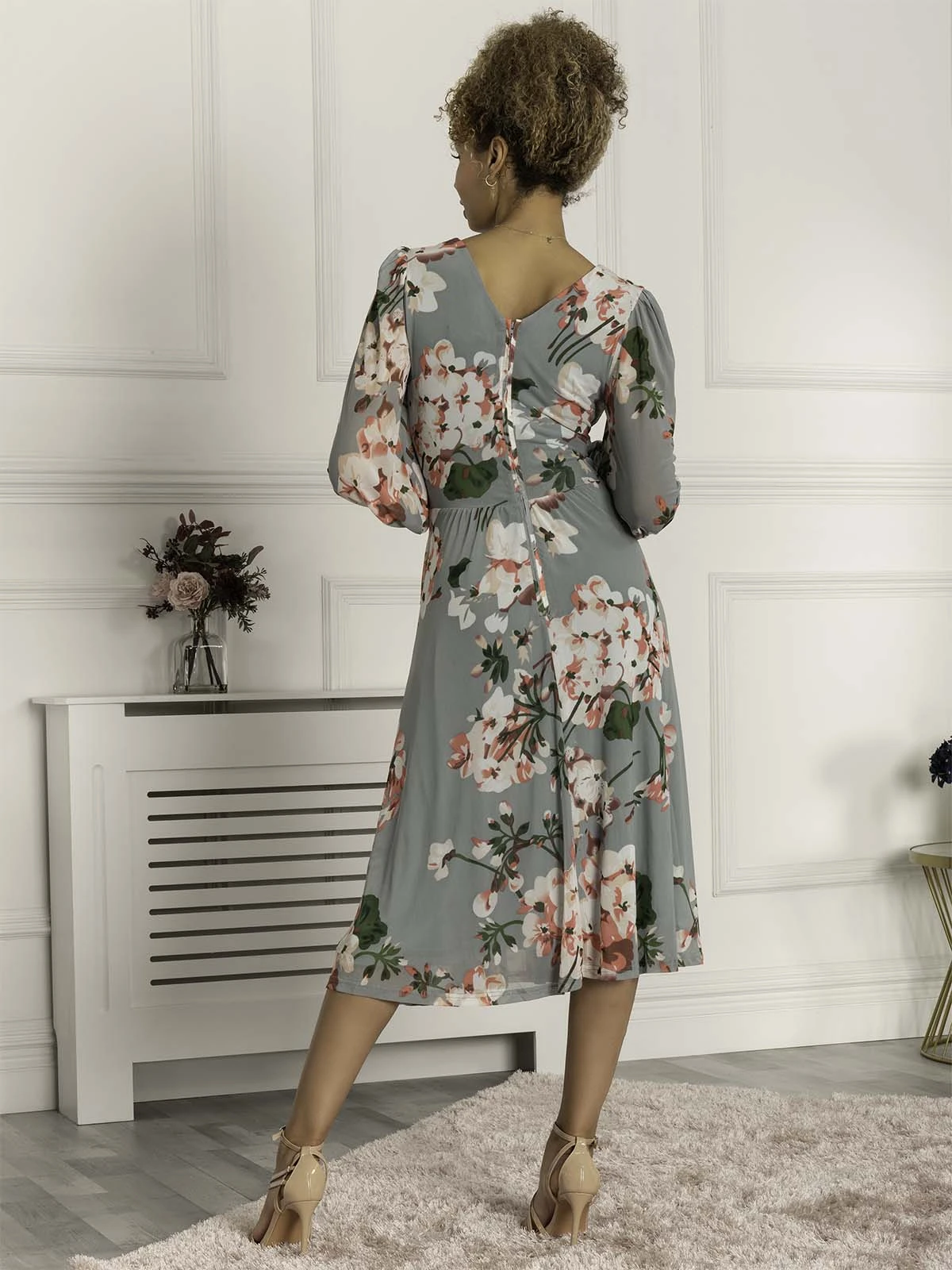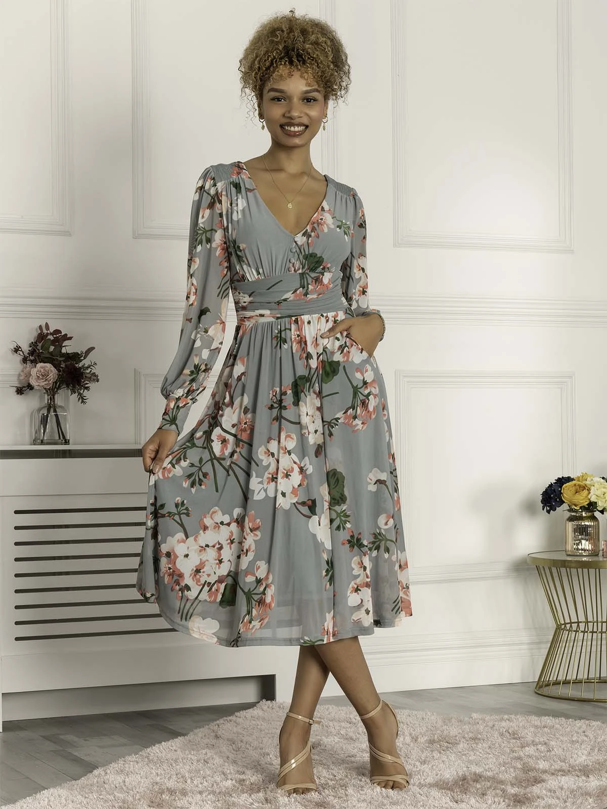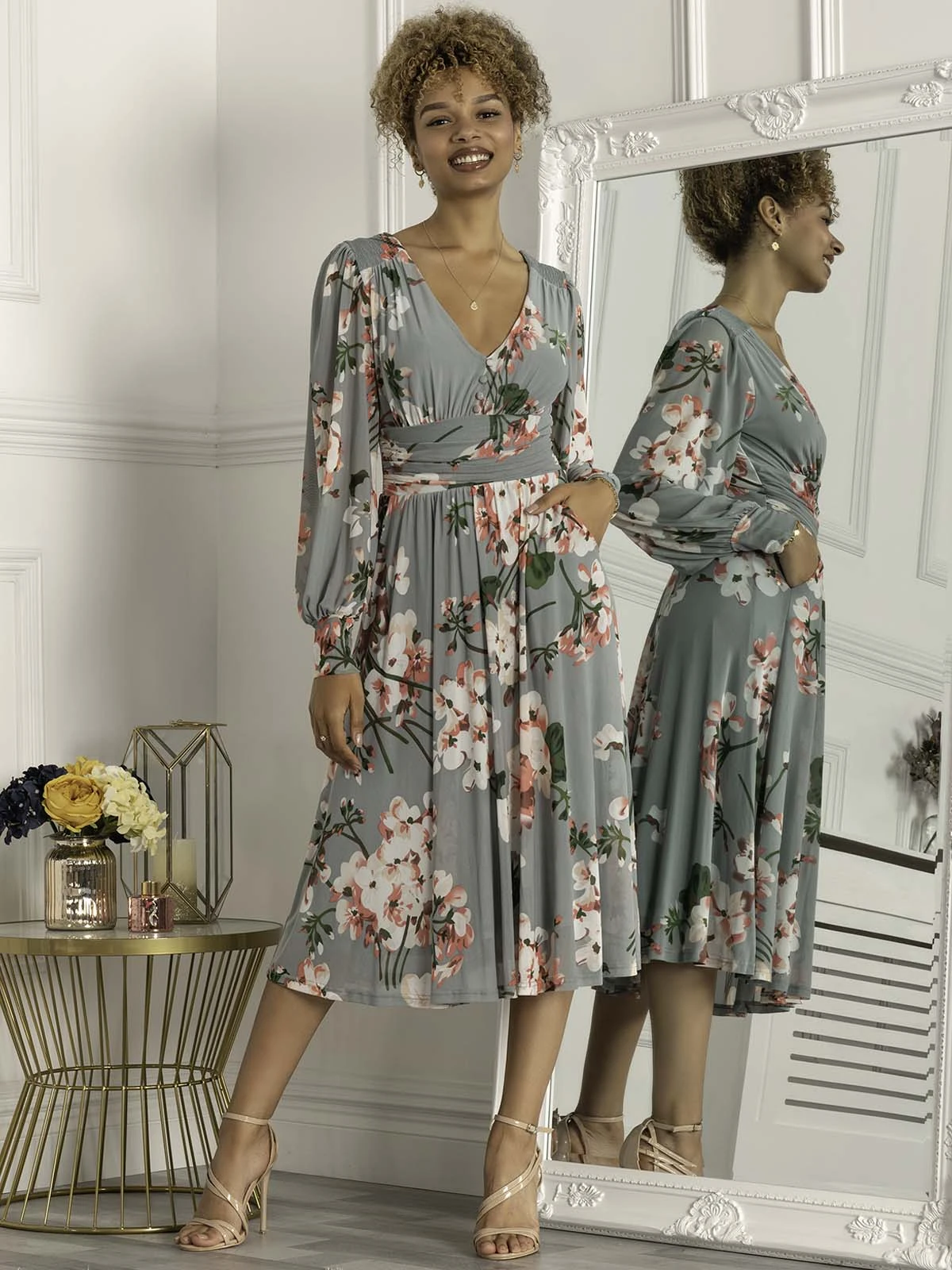 Bring a feminine edge to your occasion-wear with this stylish midi dress from Jolie Moi. Beautifully updated with a watercolour floral print, it is made from lightweight knitted non-static mesh fabric that is soft-to-the-touch. With an elegant v-neckline, floaty long sleeves and a flared skirt that falls just below the knee. Pair with heels for your next special event.