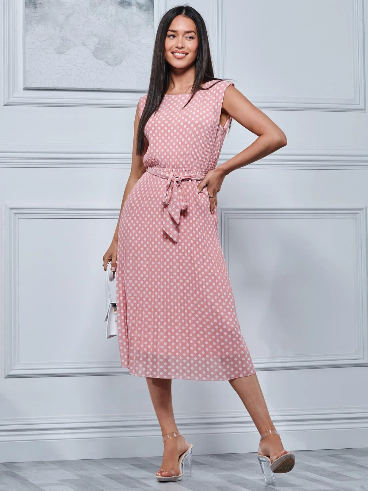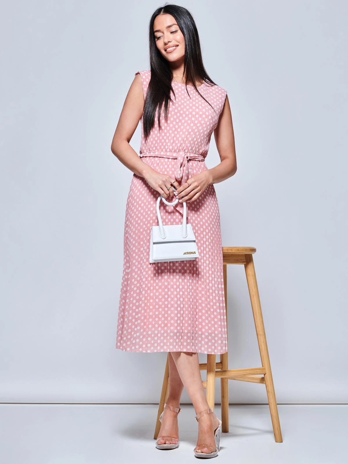 Decorated in a polka dot pattern print, the Hayes sleeveless pleated midi dress from Jolie Moi is the perfect addition for any fashion forward wardrobe. Complete with a rounded neckline, and a self tie-waist for the perfect fit.