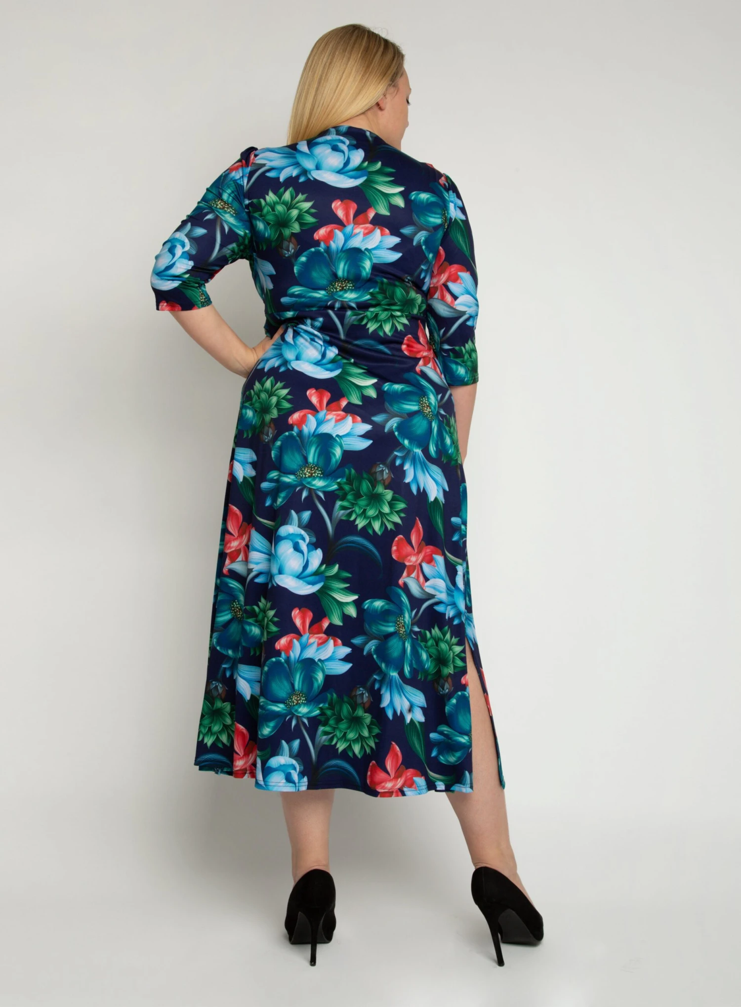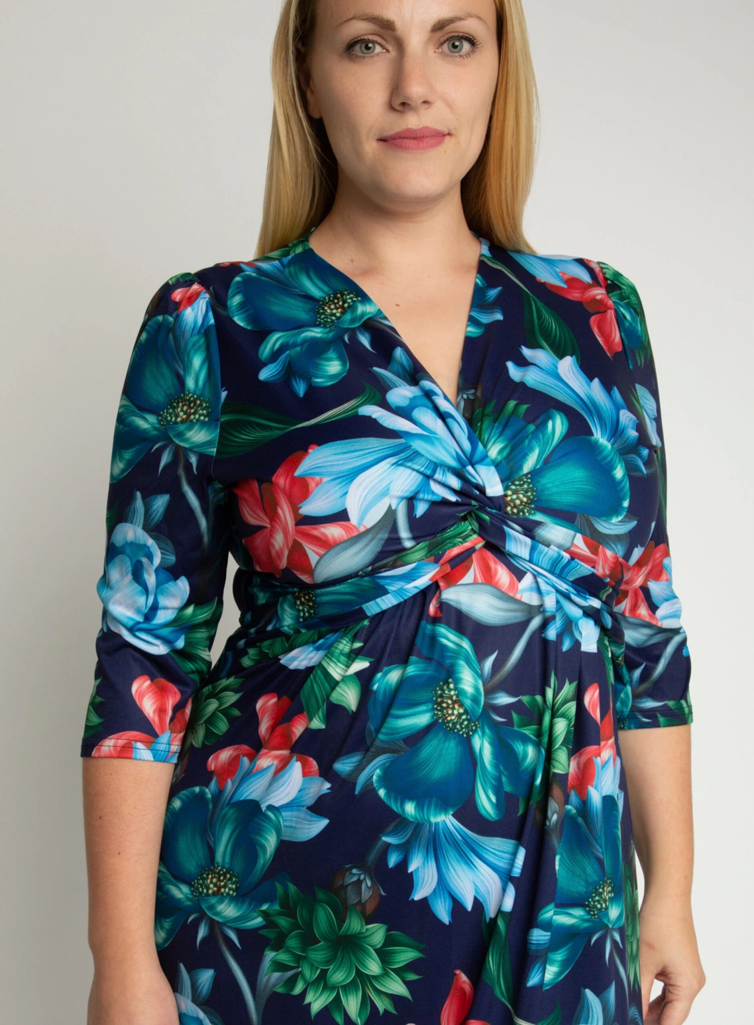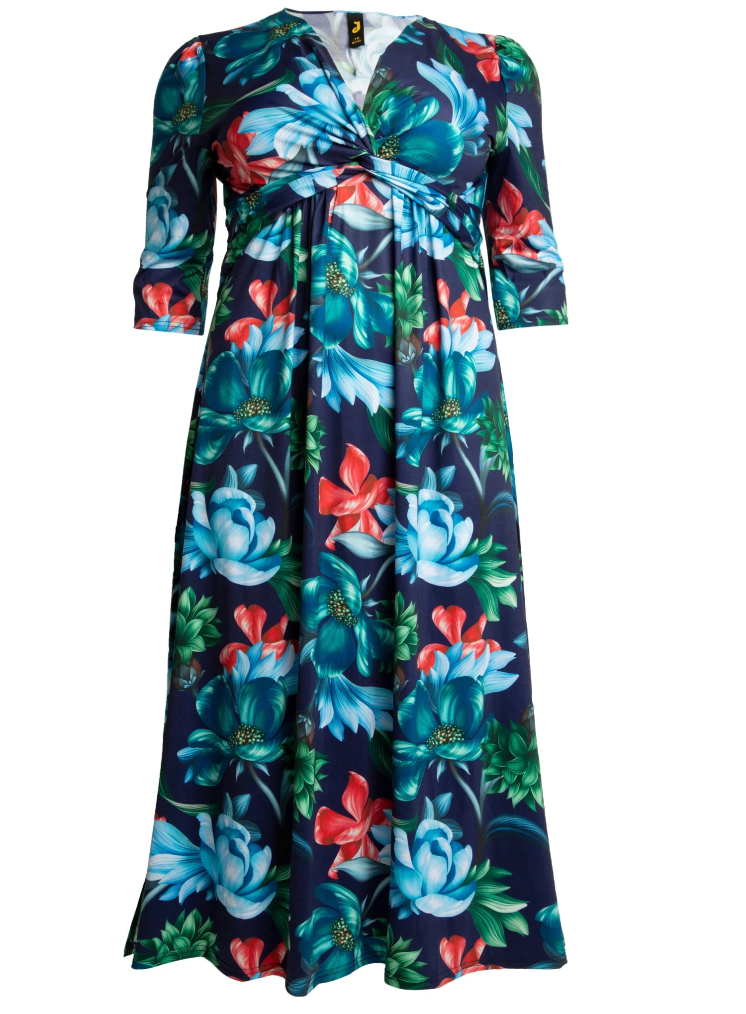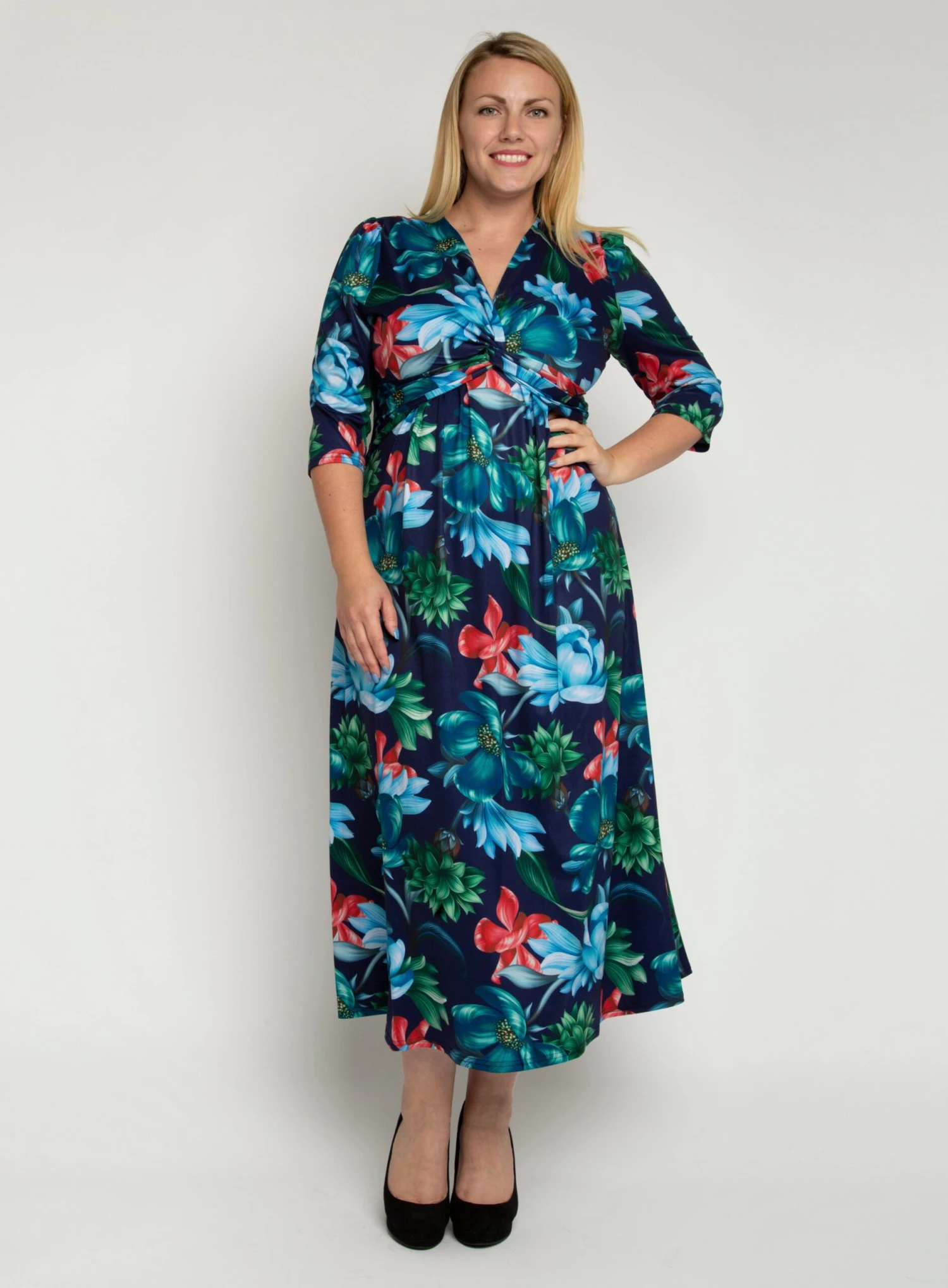 Jolie Moi floral printed maxi dress with v neckline and twist front knot detail.