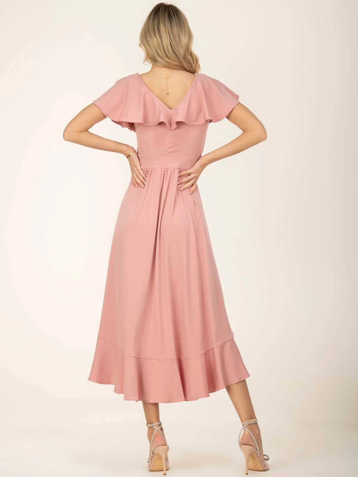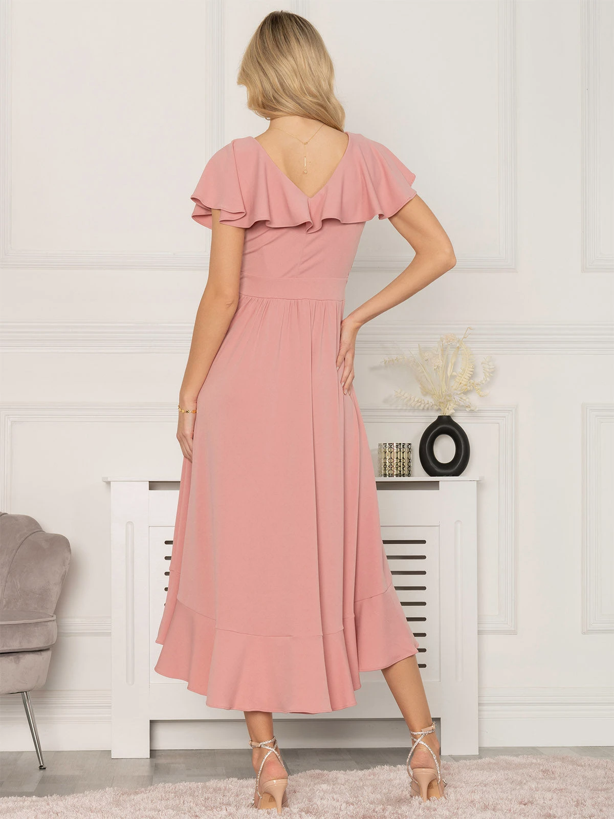 Dress to impress with the Alleigh Maxi Dress from Jolie Moi. With a simple plain design, the dress features a flared out high low hem for a touch of elegance, a decorative bowed waistband, short frilly capped sleeves, and a deep wrapped v-neckline.