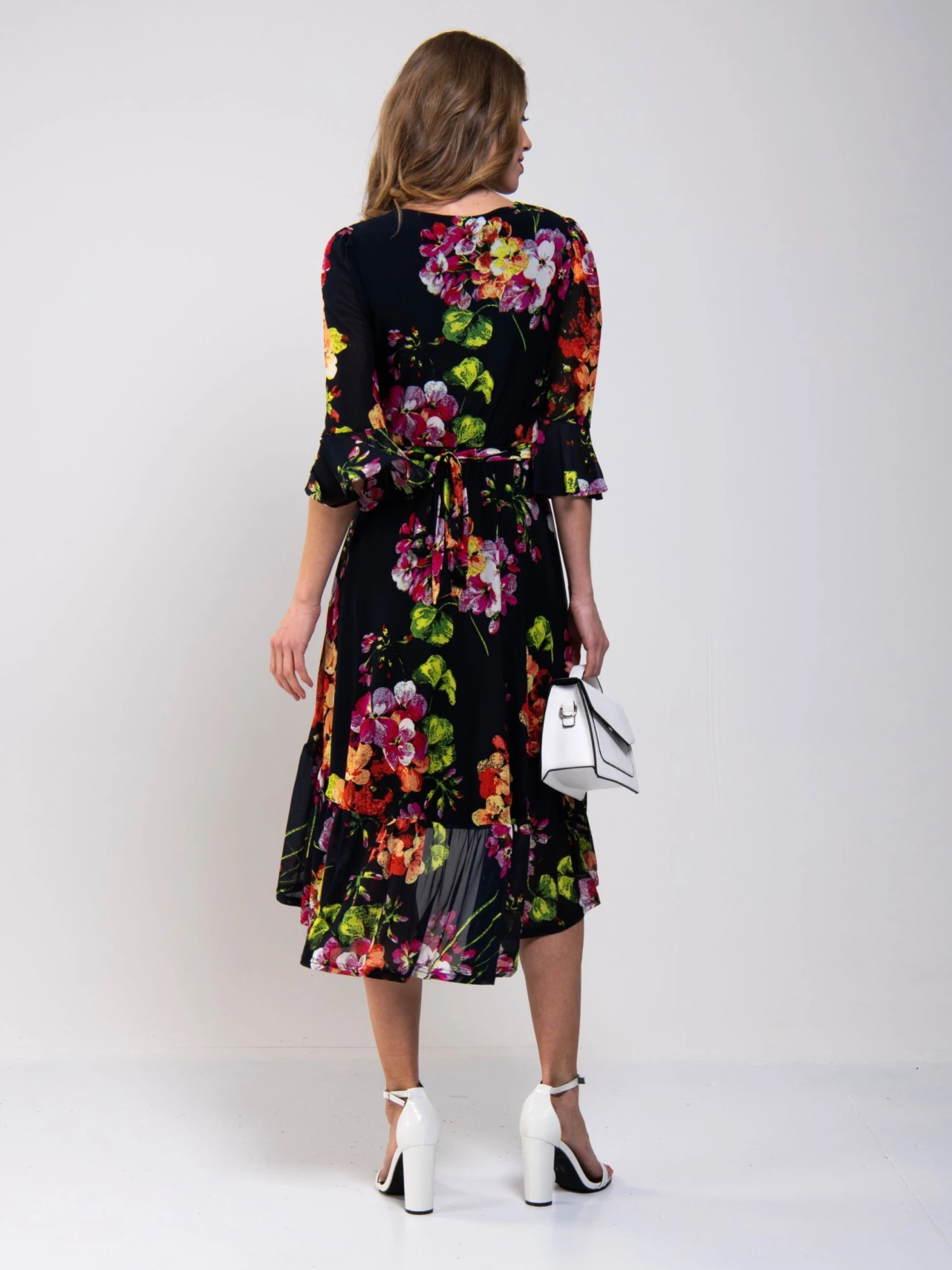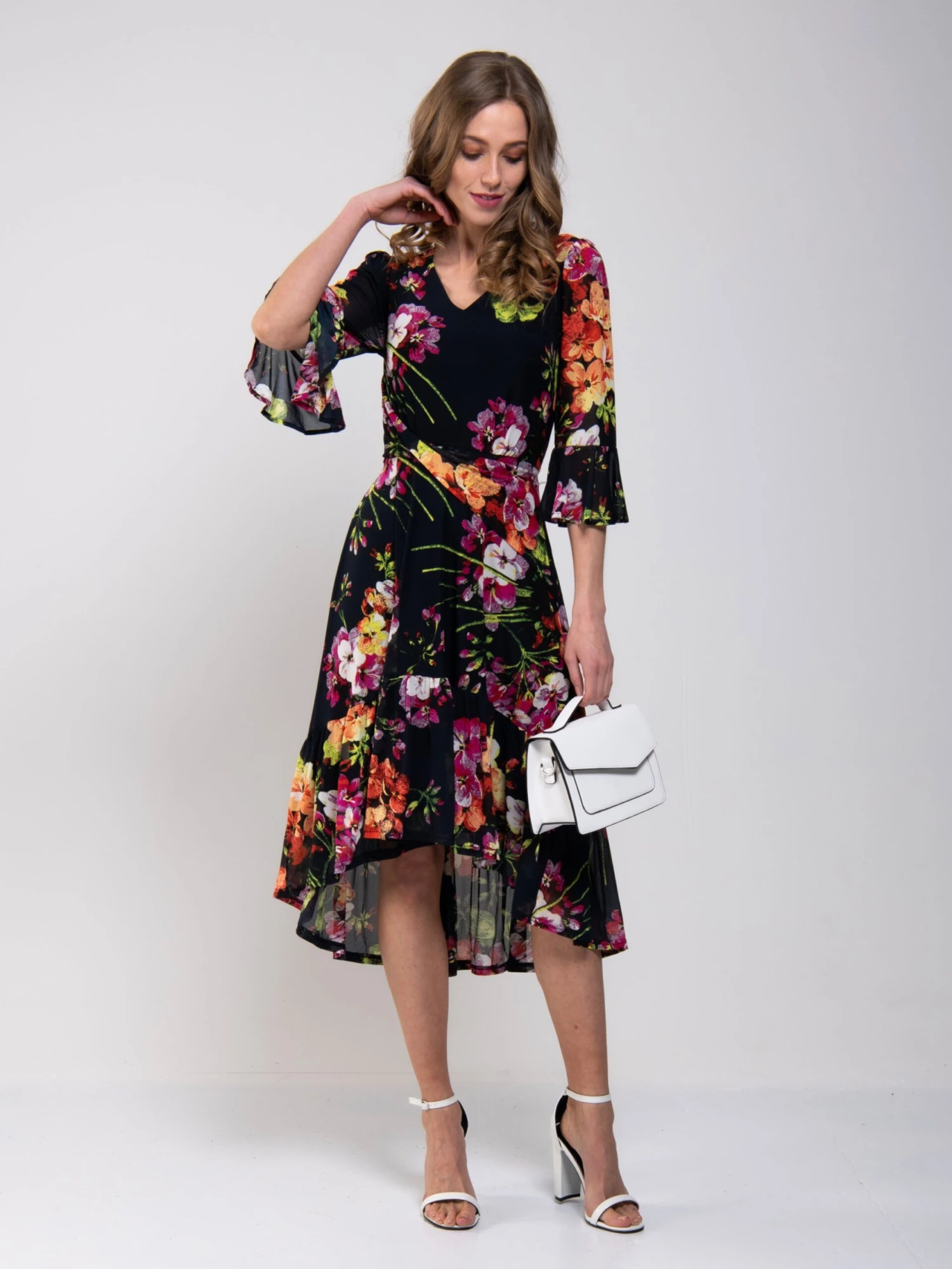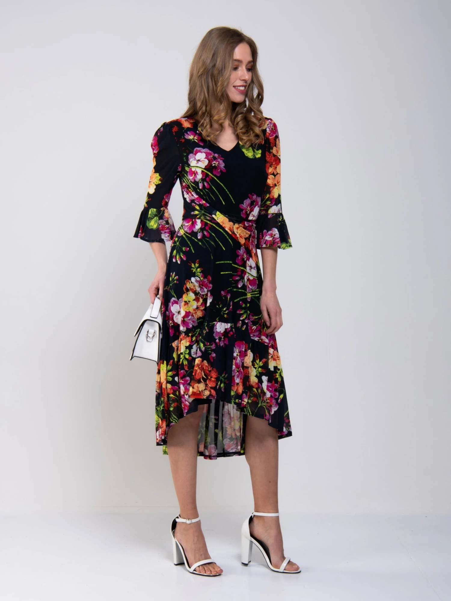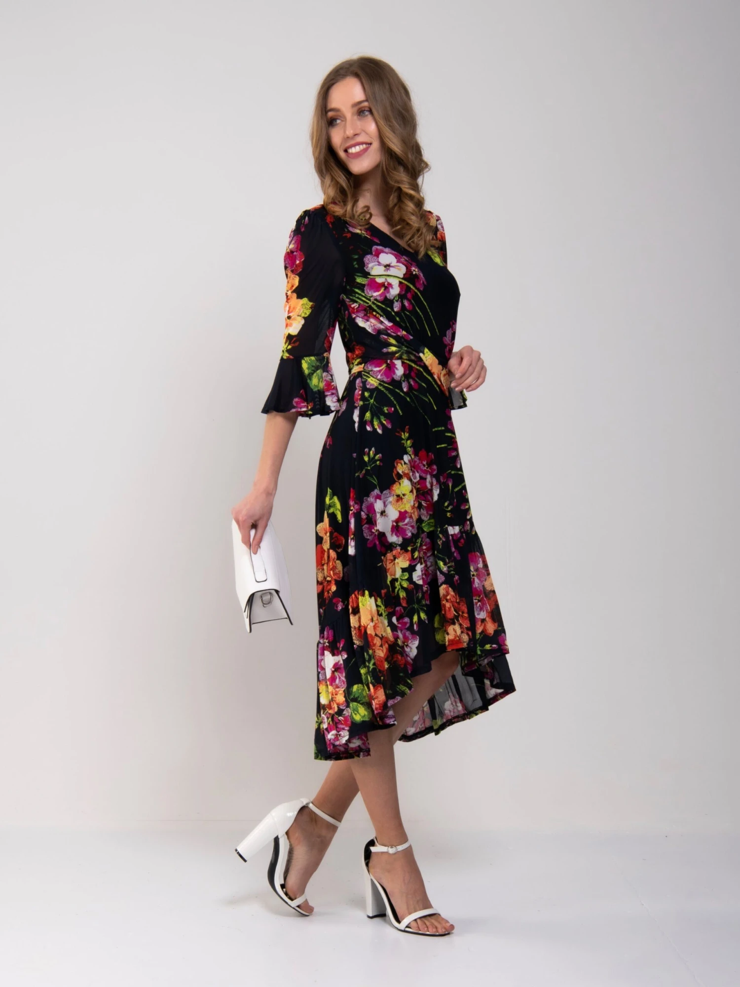 A flattering and striking design with a high-low hem, this dress from Jolie Moi is crafted from sheer mesh fabric with a vibrant floral print. It features a V neckline with asymmetrical fold crossing the waist while the fluid, flared high low skirt is designed to flatter your silhouette. Beautifully draping flute sleeves add in a truly eye-catching finish. Â