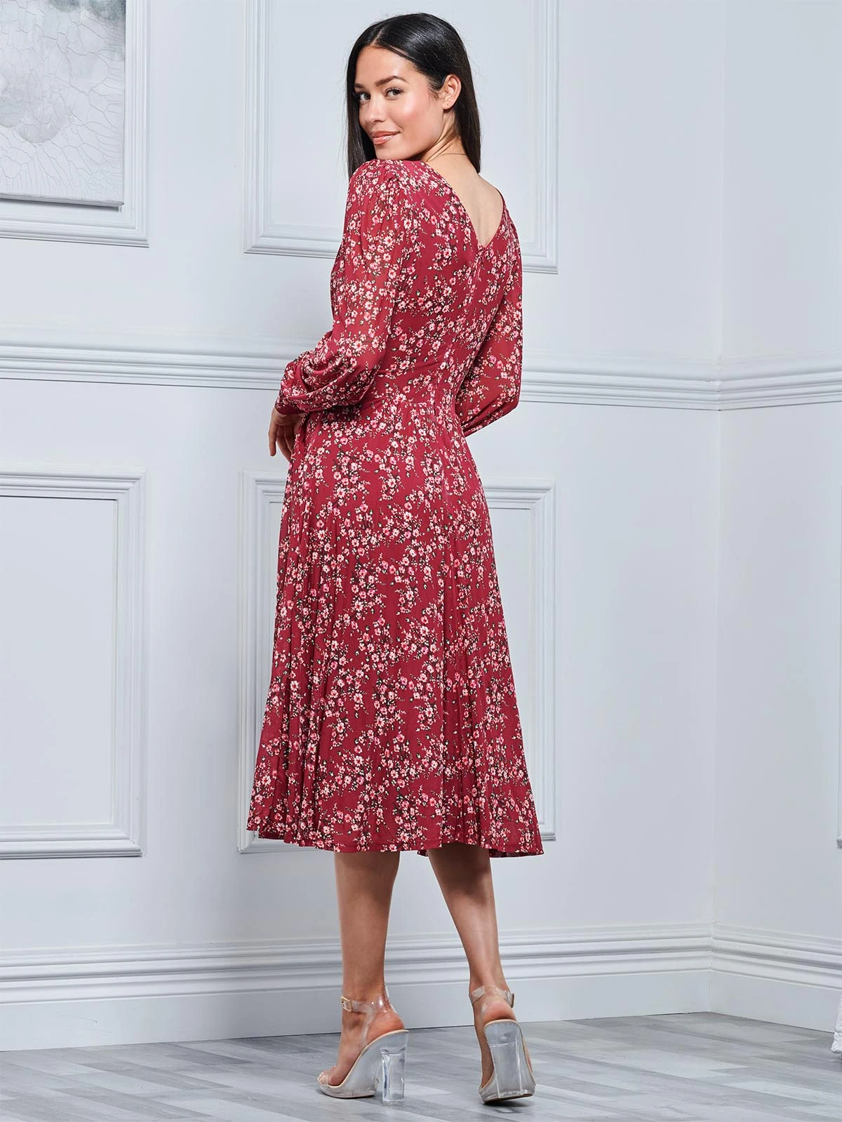 Bring a feminine edge to your occasion wear with this stylish midi dress from Jolie Moi. Beautifully updated with a floral print, it s made from lightweight mesh fabric that s soft-to-touch and smooth.With an elegant v-neckline, short floaty long sleeves and a flared skirt that falls just below the knee, it can be paired with heels at your next special event.