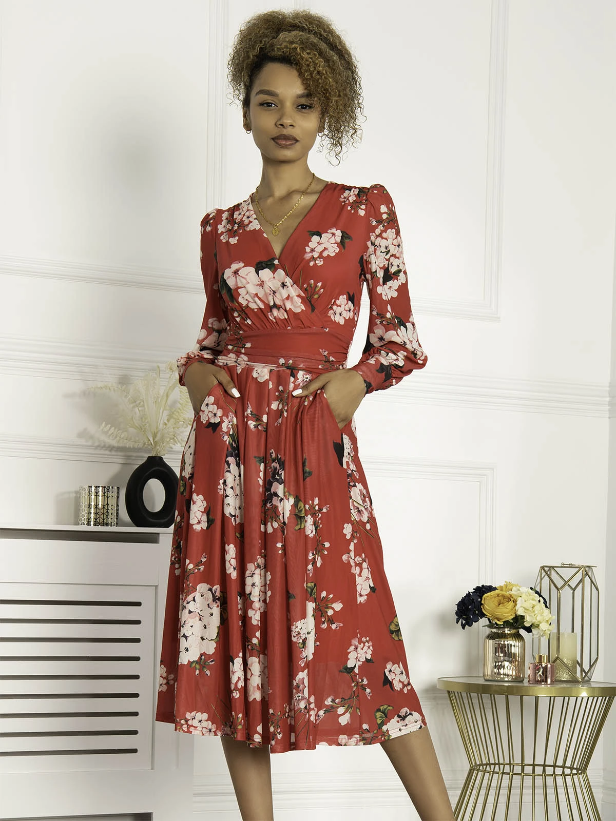 Bring a feminine edge to your occasion-wear with this stylish midi dress from Jolie Moi. Beautifully updated with a watercolour floral print, it is made from lightweight mesh fabric that is soft-to-touch and smooth. With an elegant v-neckline, short floaty long sleeves and a flared skirt that falls just below the knee, it can be paired with heels at your next special event.