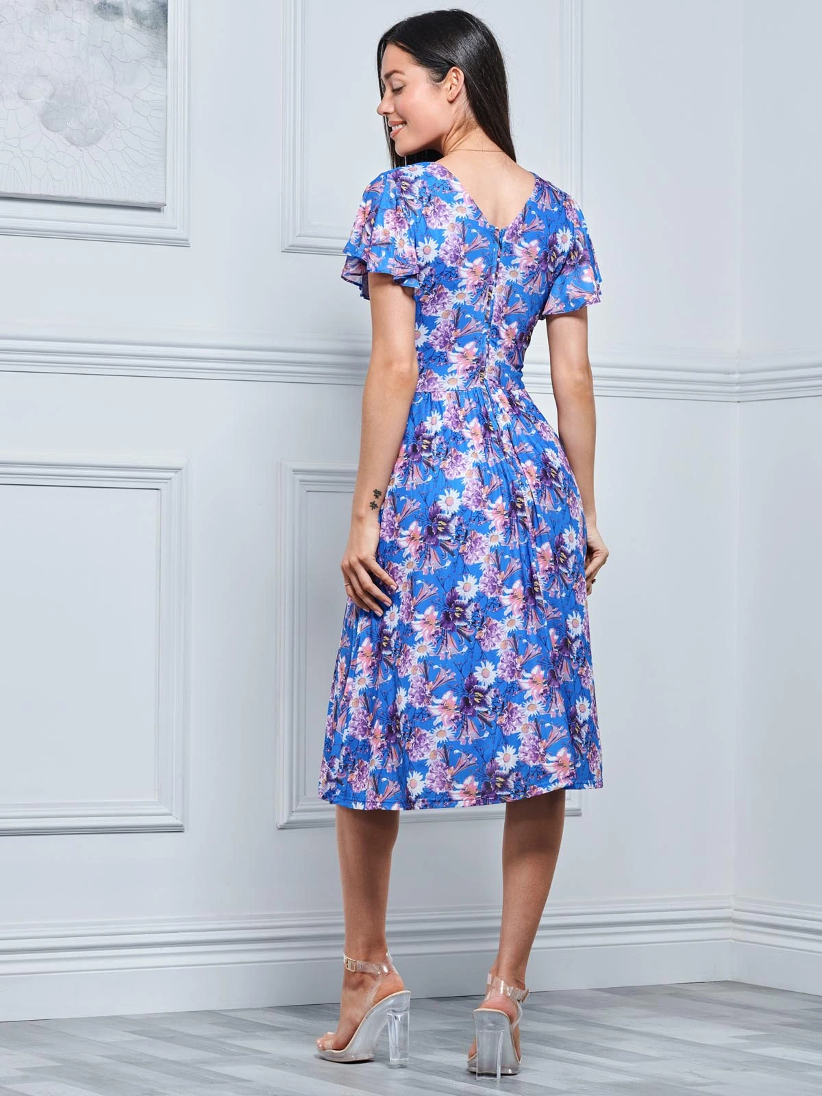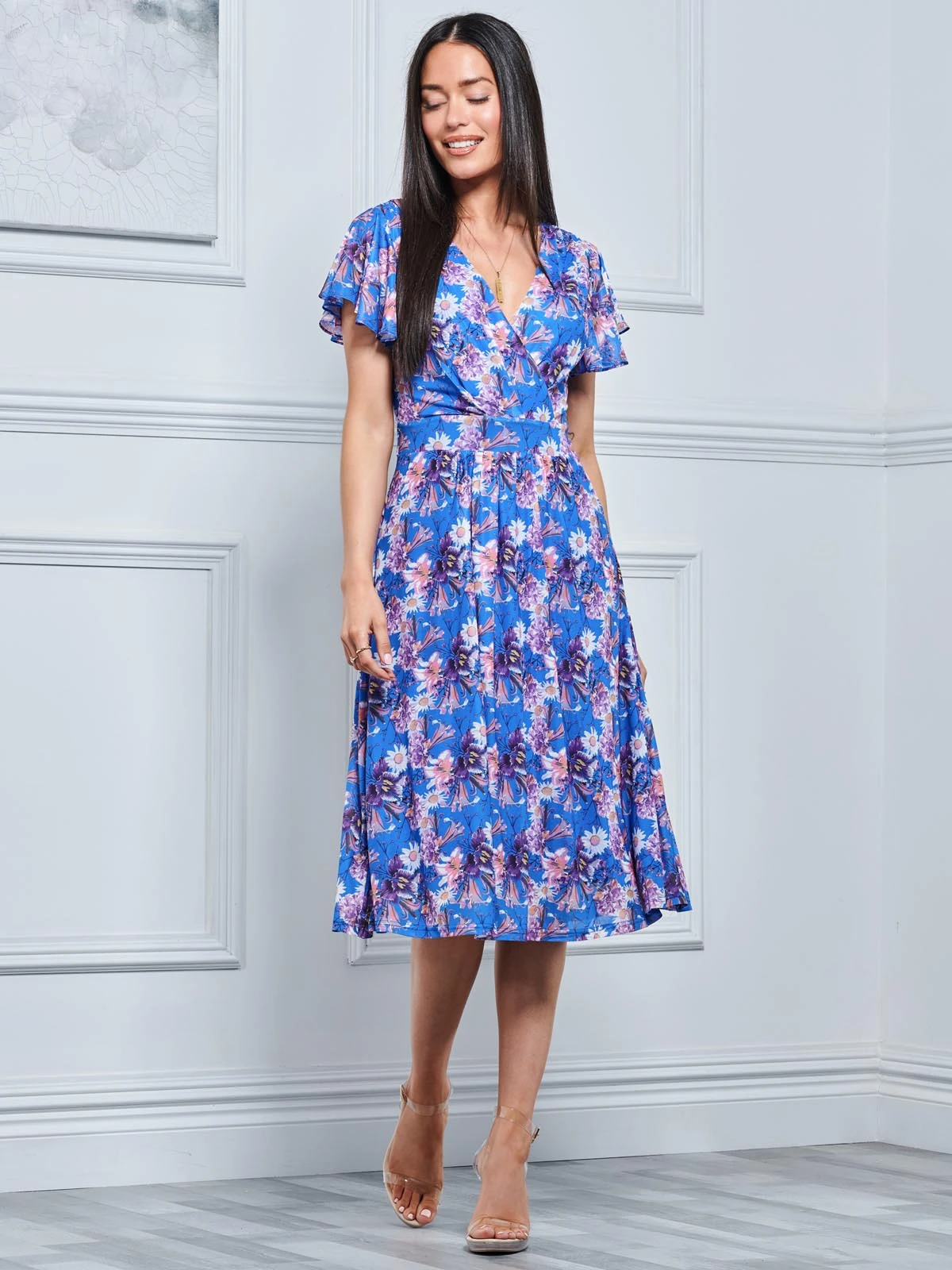 In a flattering fit-and-flare silhouette, this midi dress by Jolie Moi is cut from a premium mesh fabric with full lining. Accentuating the figure with a V neckline and short angel sleeves, it has an elegant floral pattern design that is perfect that summer wedding or garden party.