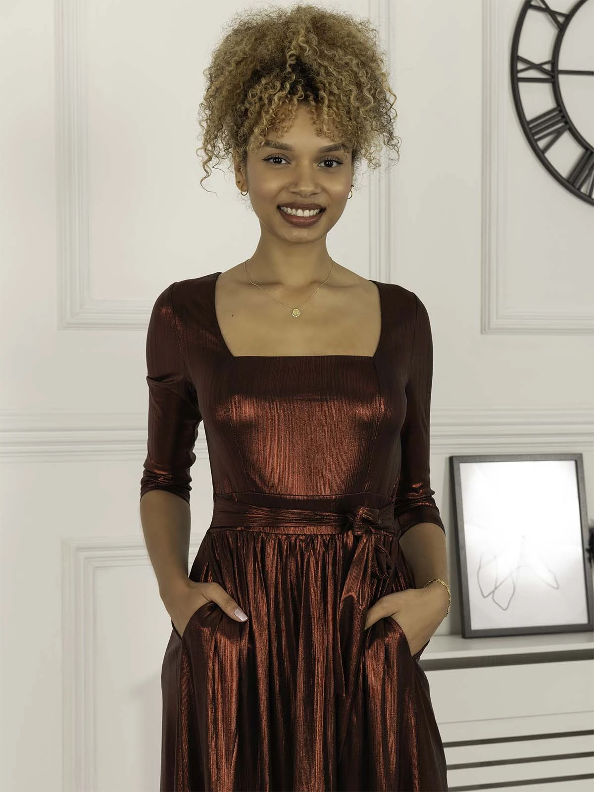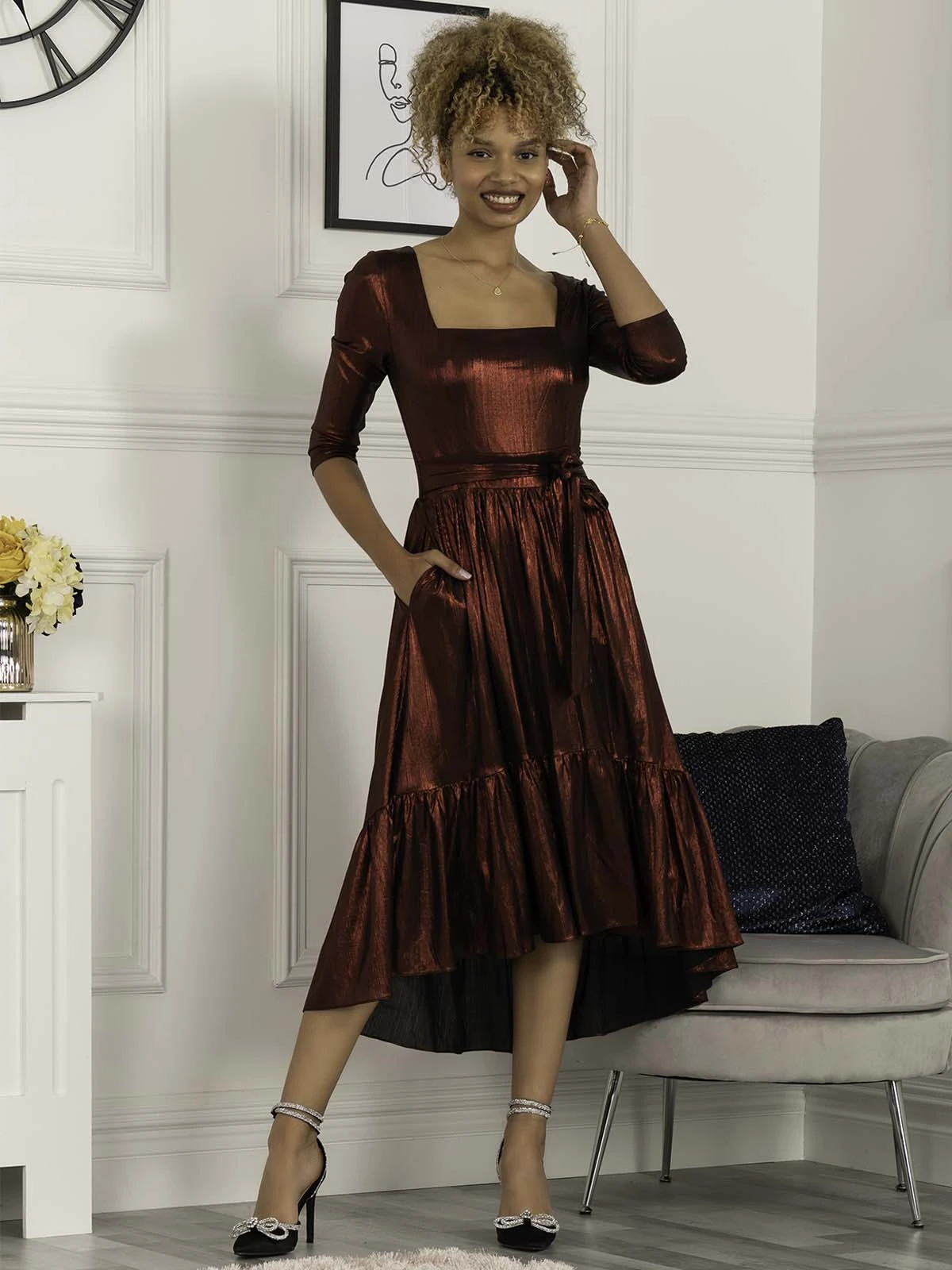 Celebrate the holidays in style with the Orly sparkly midi dress from Jolie Moi. The dress features a squared plunge neckline and 3/4 length cropped sleeves. There is a self tie waistband for a custom form-flattering silhouette. The high-low hem makes the dress flow and adds an extra level of elegance. Guaranteed you’ll reach for this dress time and time again. Add a pair of sparkly heels to complete the look.