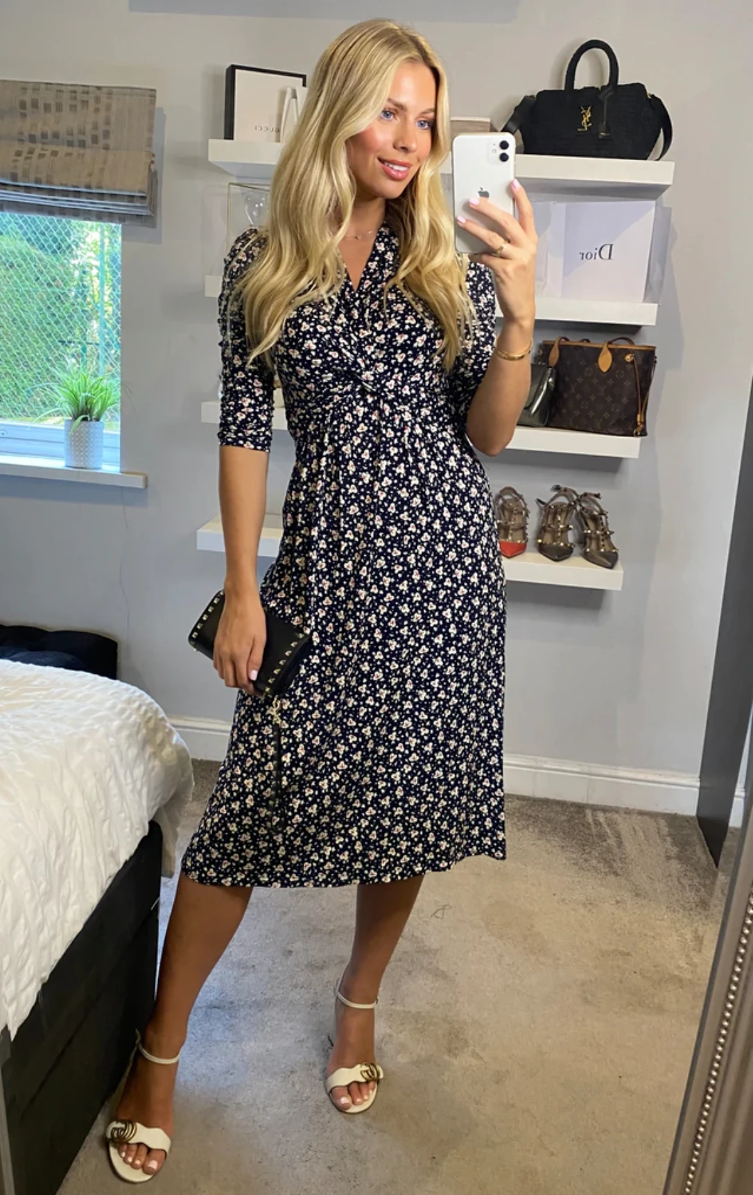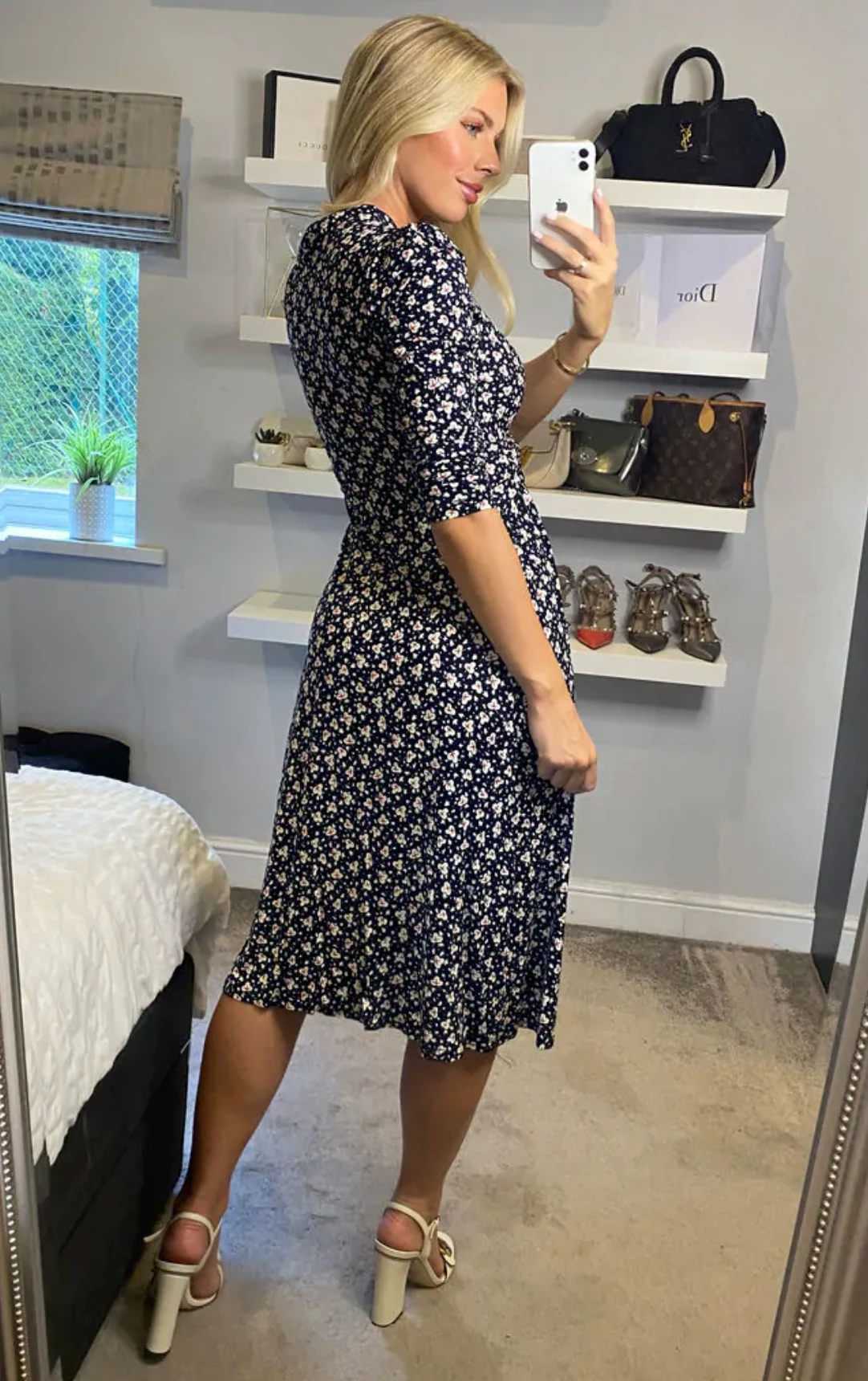 Crafted from a soft, stretchy jersey fabric, this cross-over knot front V neck dress is perfect for weekend activities with its flattering empire line silhouette and all over eye-catching retro geometric pattern print. Finished with three-quarter length puffy ruched sleeves, this style can be dressed or or down effortlessly