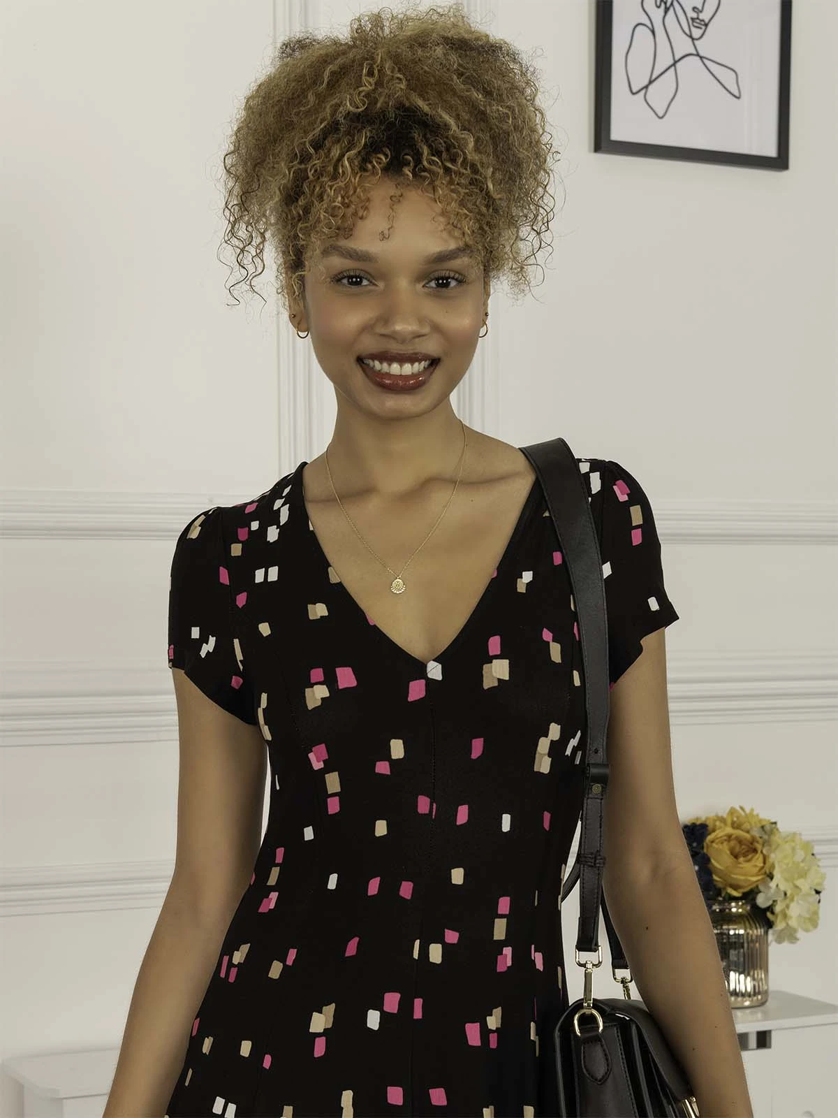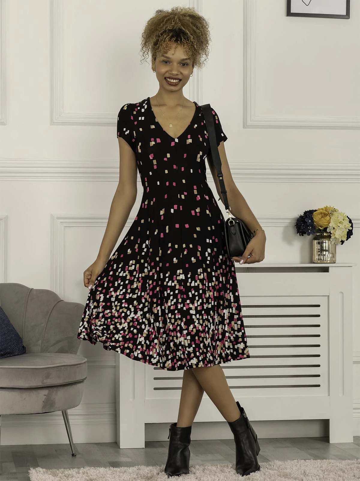 Striking a pose is made easy with this Jolie Moi dress. Boasting a vibrant geometric abstract print throughout, this dress is cut from soft and stretchy viscose jersey for a comfortable fit. The structured waist and flared skirt make the look even more feminine.Â