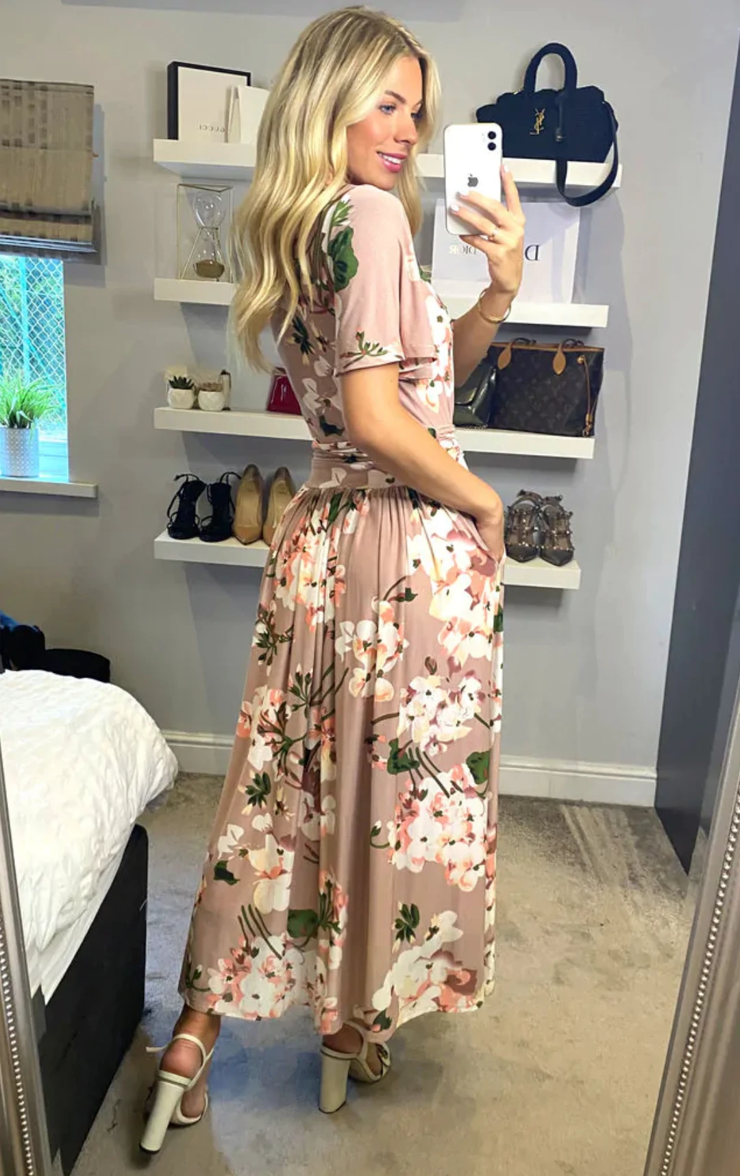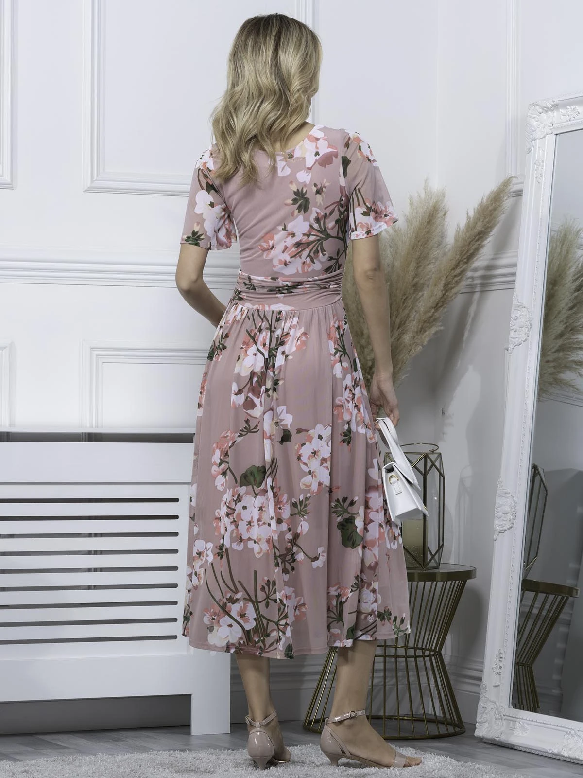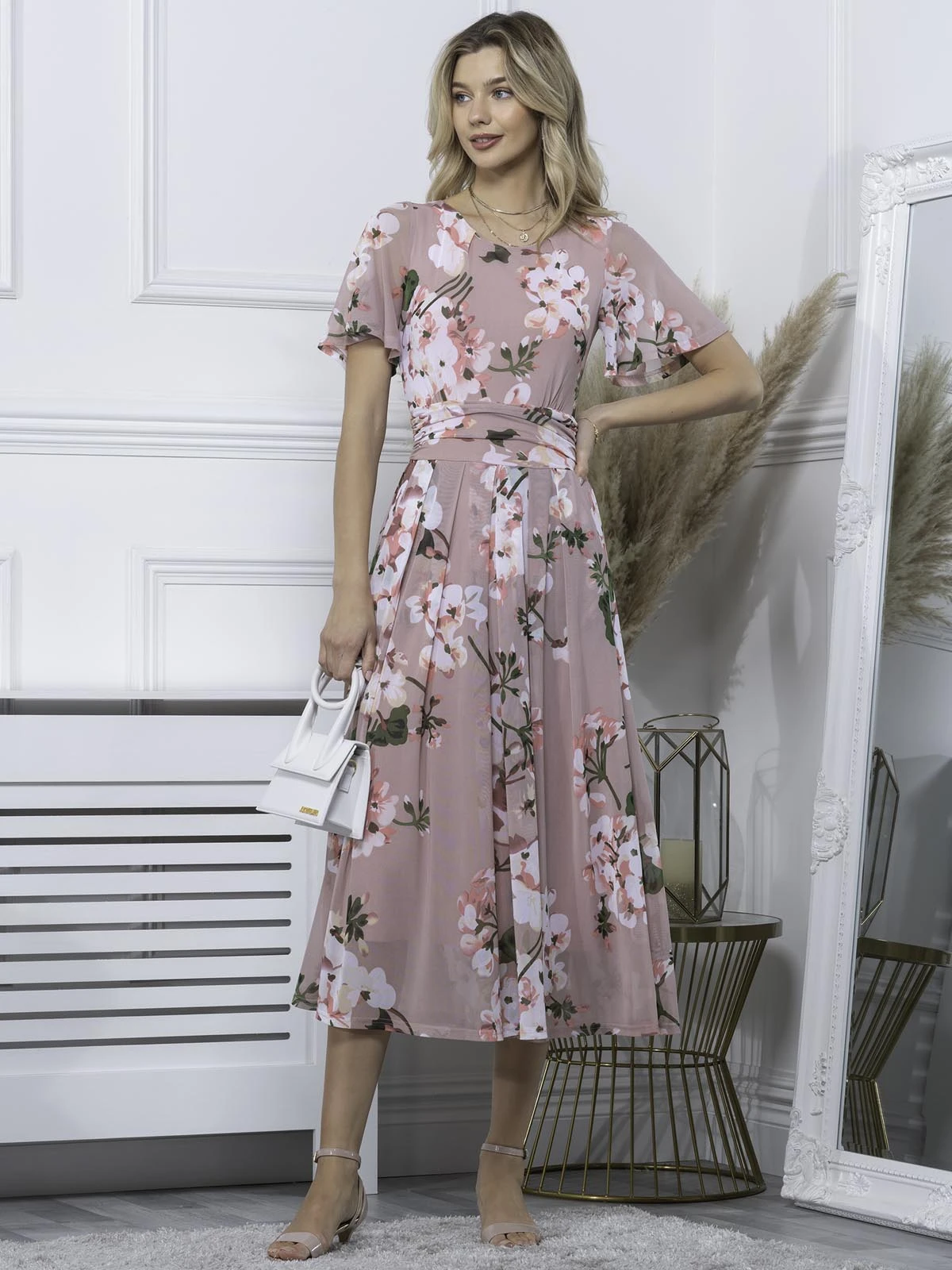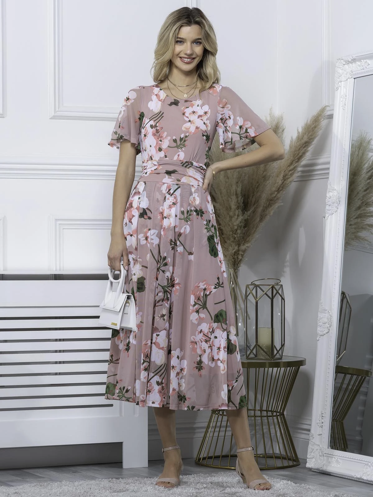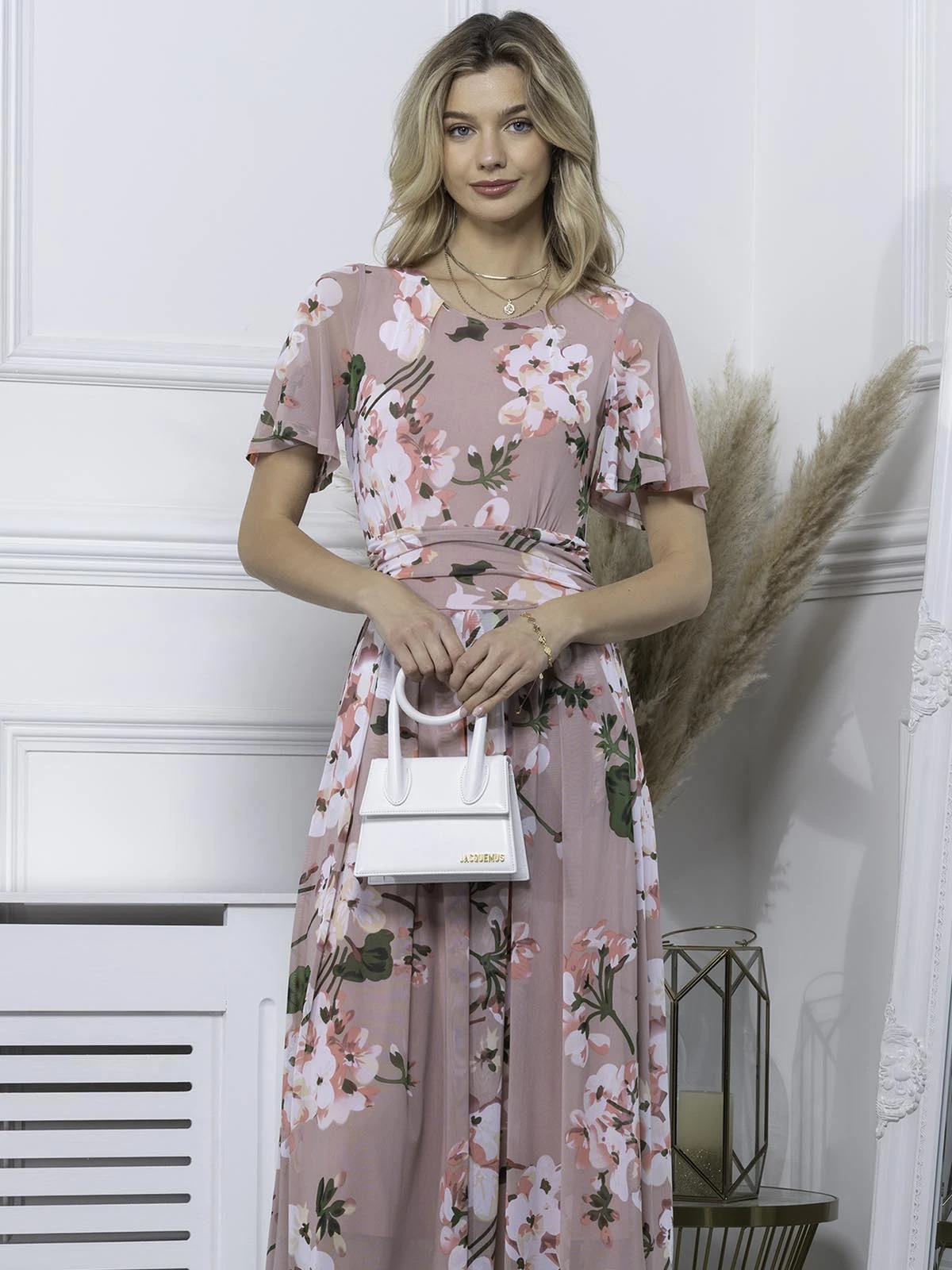 Decorated in an all over floral print and equipped with an elasticated waist to ensure a form-flattering silhouette, this maxi dress features a flattering boat neckline and flared elbow length sleeves, it is made from a soft and fluid mesh fabric and fully lined. It is a pretty piece you’ll reach for again and again.Â