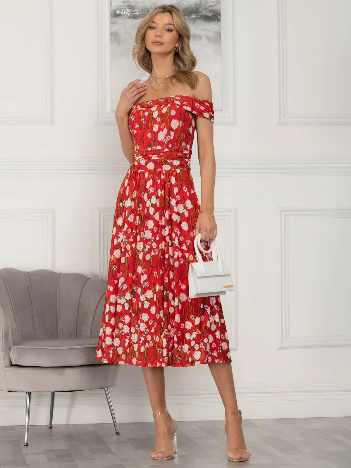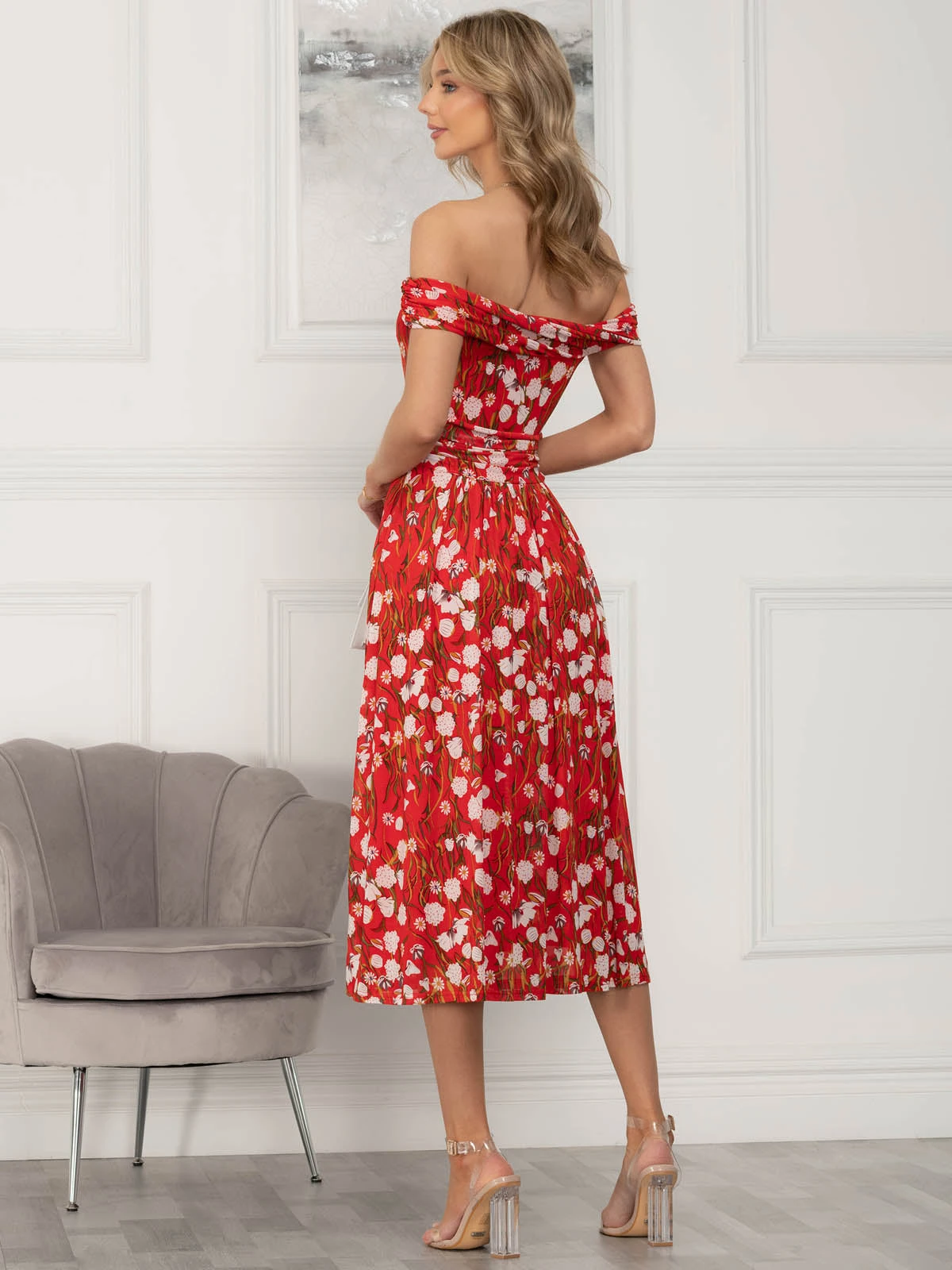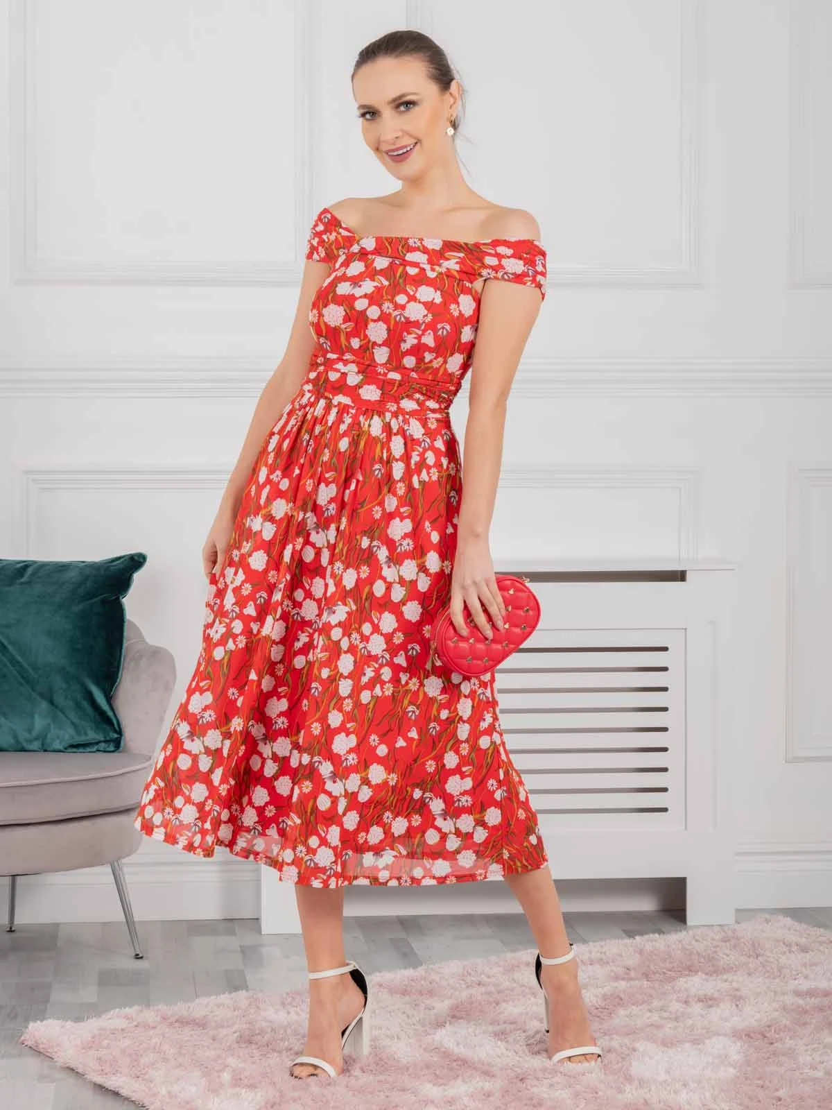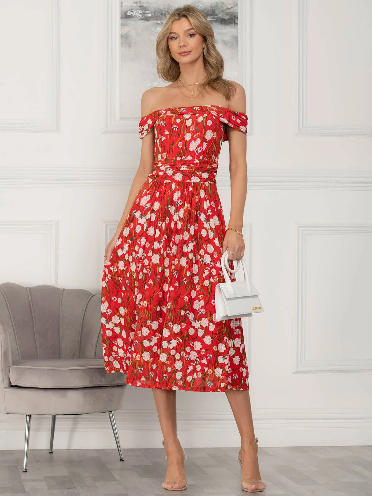 Draped for ultimate sophistication, this midi dress from Jolie Moi sits off the shoulders with an alluring twist Bardot neckline. It is made from a delicate mesh fabric with an overall floral print and nipped-in at the waist before flaring out through the skirt. Fully lined for comfort and finished with a pull on fastening. Wear with metallic strappy heels to dazzle at your next event.