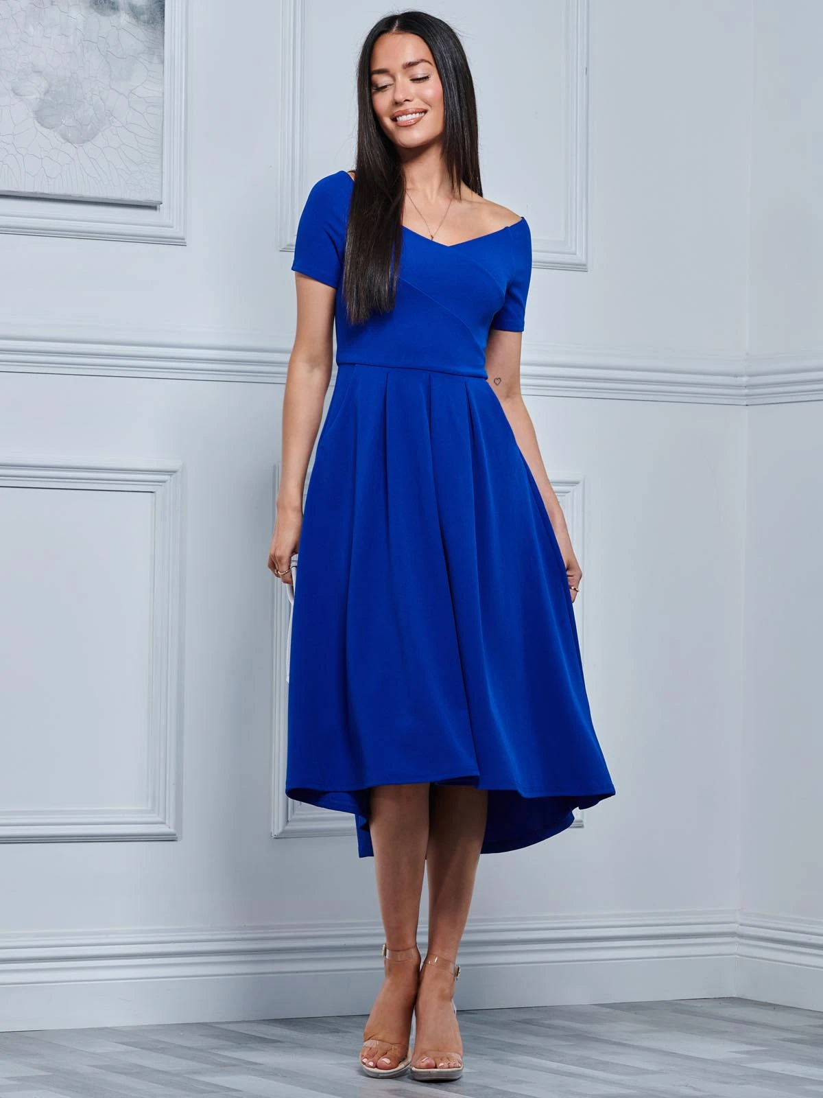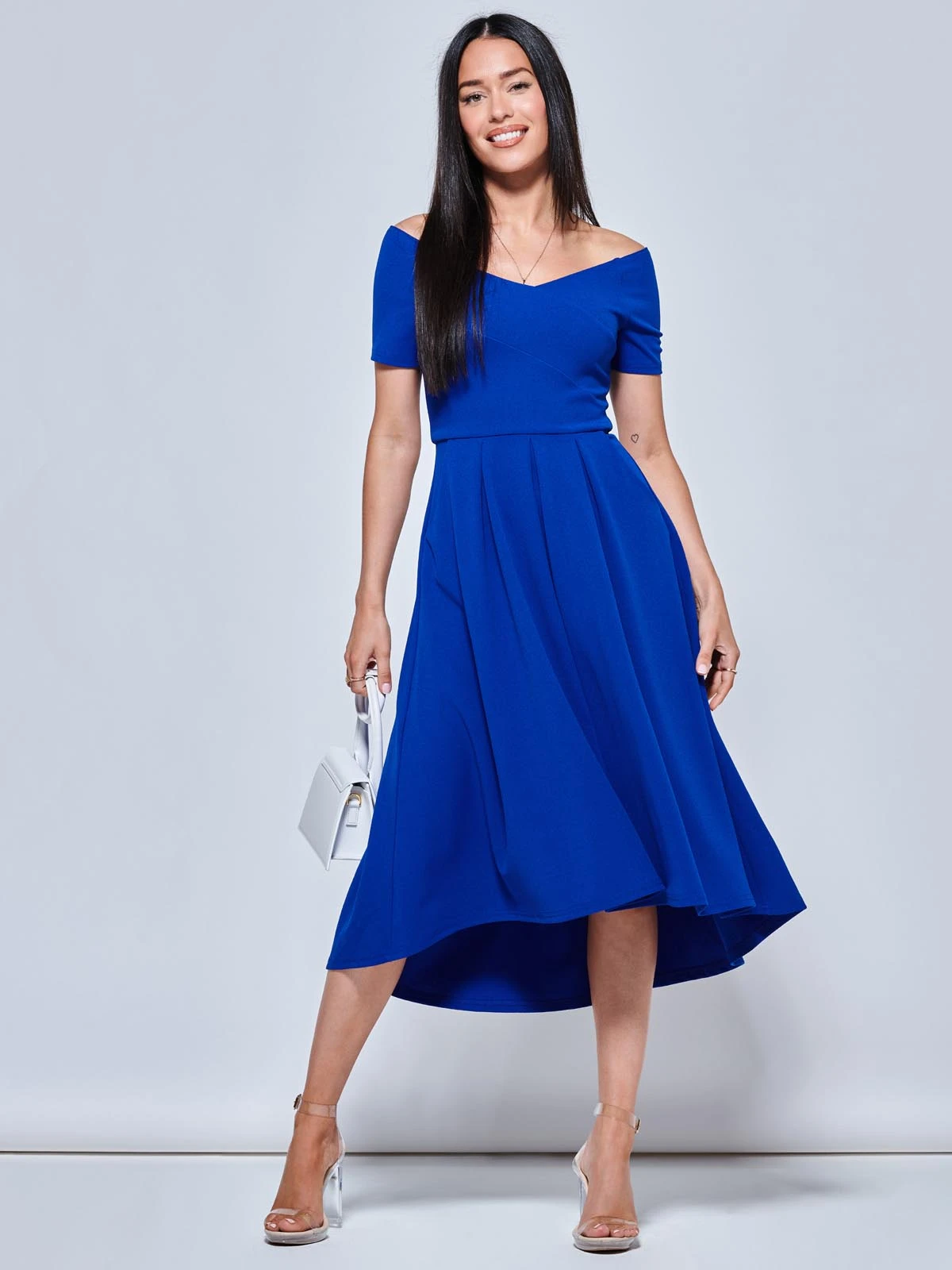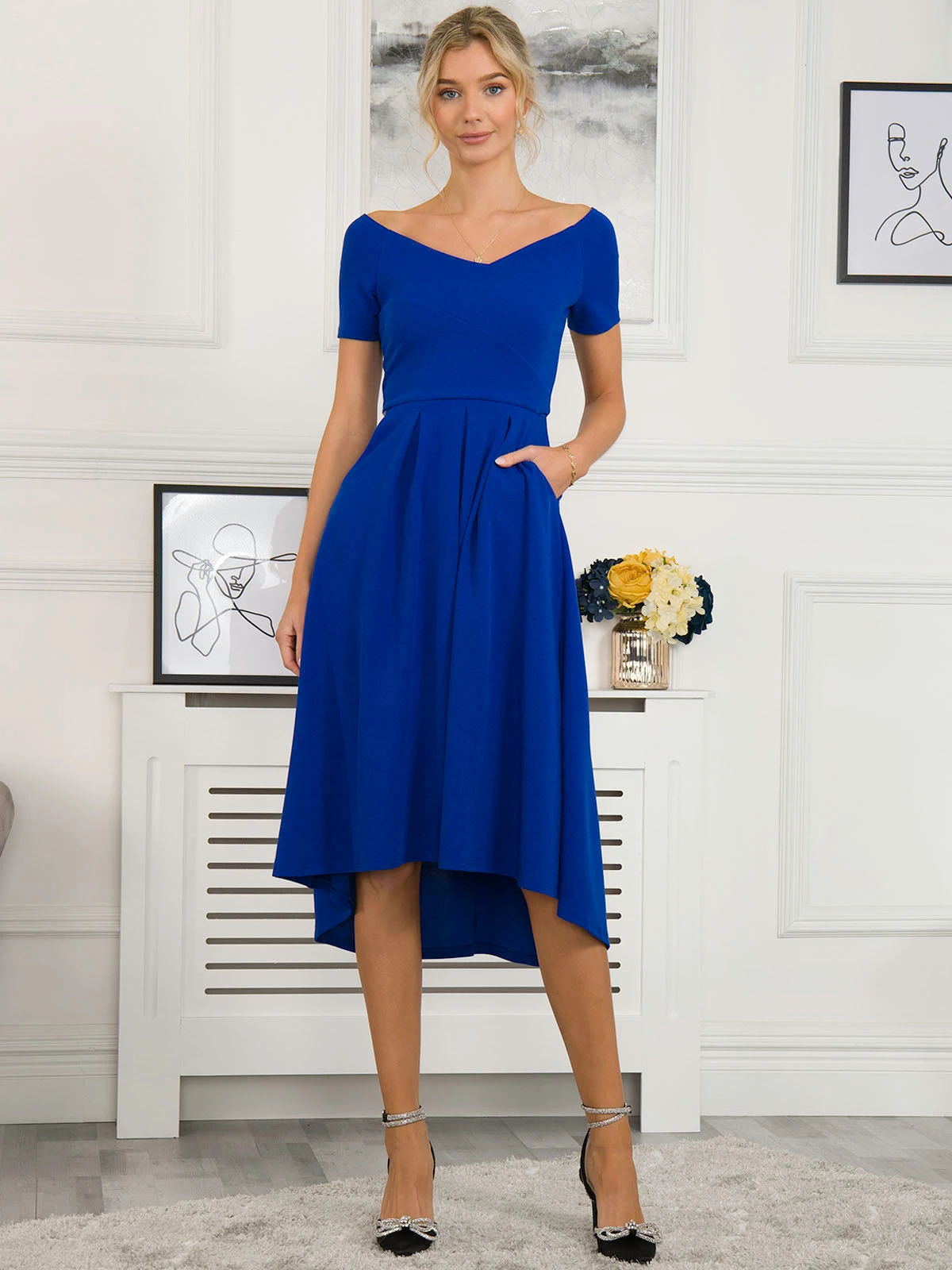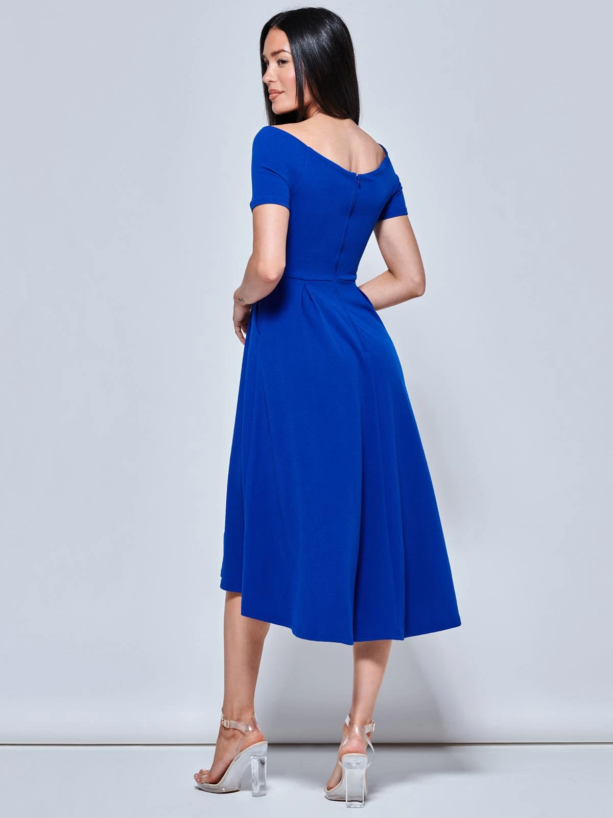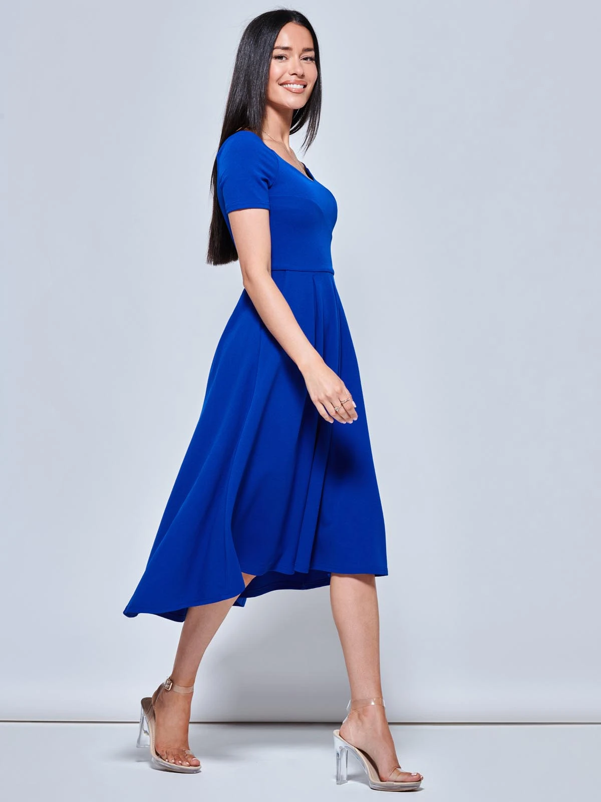 Combining elegance and style into a gorgeous dress. The Lenora fit and flare midi dress exerts refinement. Crafted from knitted scuba fabric. The dress features a lightweight stretchy construction, short sleeves, a wide v-neckline that comfortably sits on the shoulders showing off your neck and collarbone, and a high low construction that sits just below the knees. Match with a pair of sparkly heels to complete the look for your next event.