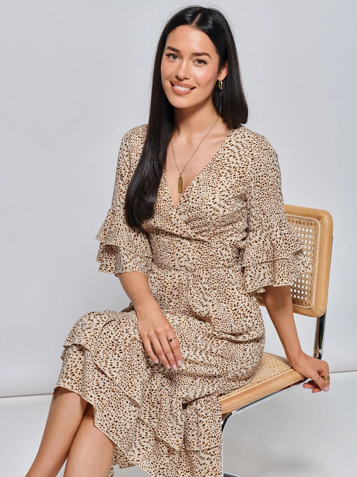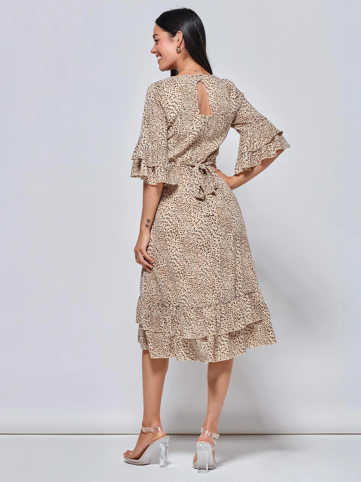 Opt for a wild appeal with the Litzy midi dress. Complimented with an on-trend animal pattern print. The dress features a button up back, short tiered sleeves, and a self-tie waist for a true to fit silhouette. Complete the look with a a pair of heels for an instant get ready look, or dress it down with a pair of flats for a more casual look.