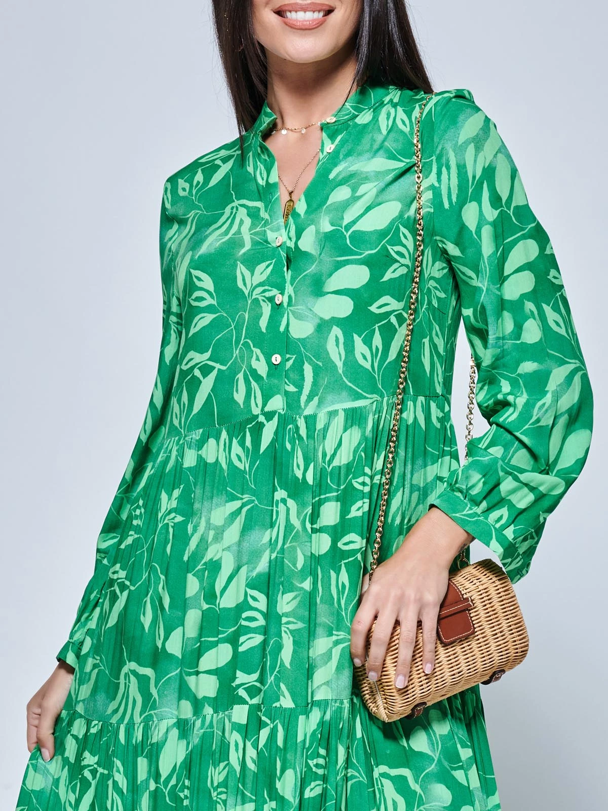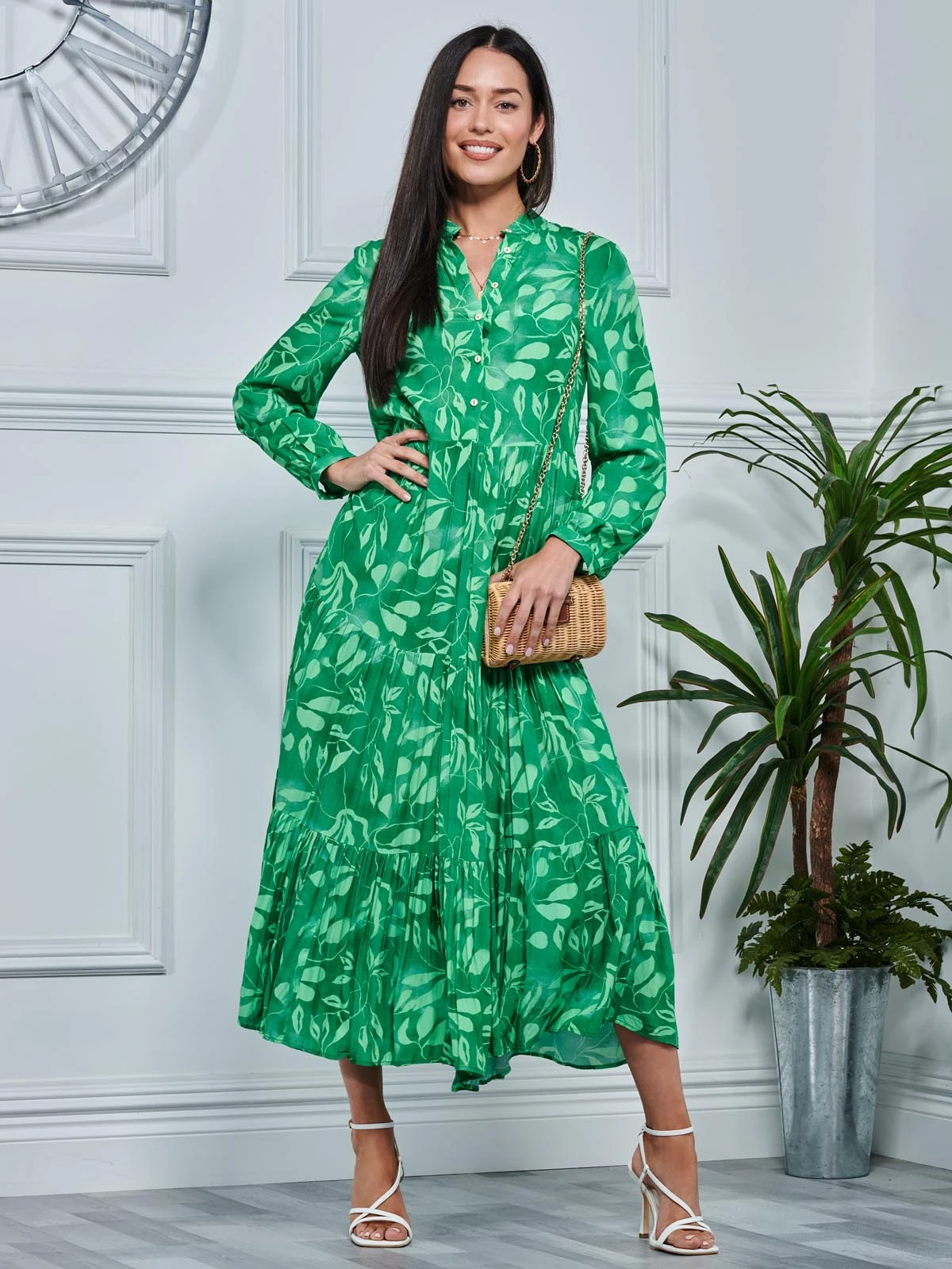 Get ready for you next holiday with our long sleeved maxi shirt dress. Decorated with an abstract print, front buttons and a tiered hemline that drapes down to your feet. Crafted from our soft and flowy viscose material. Combine with a pair of sandals for a beach ready look.