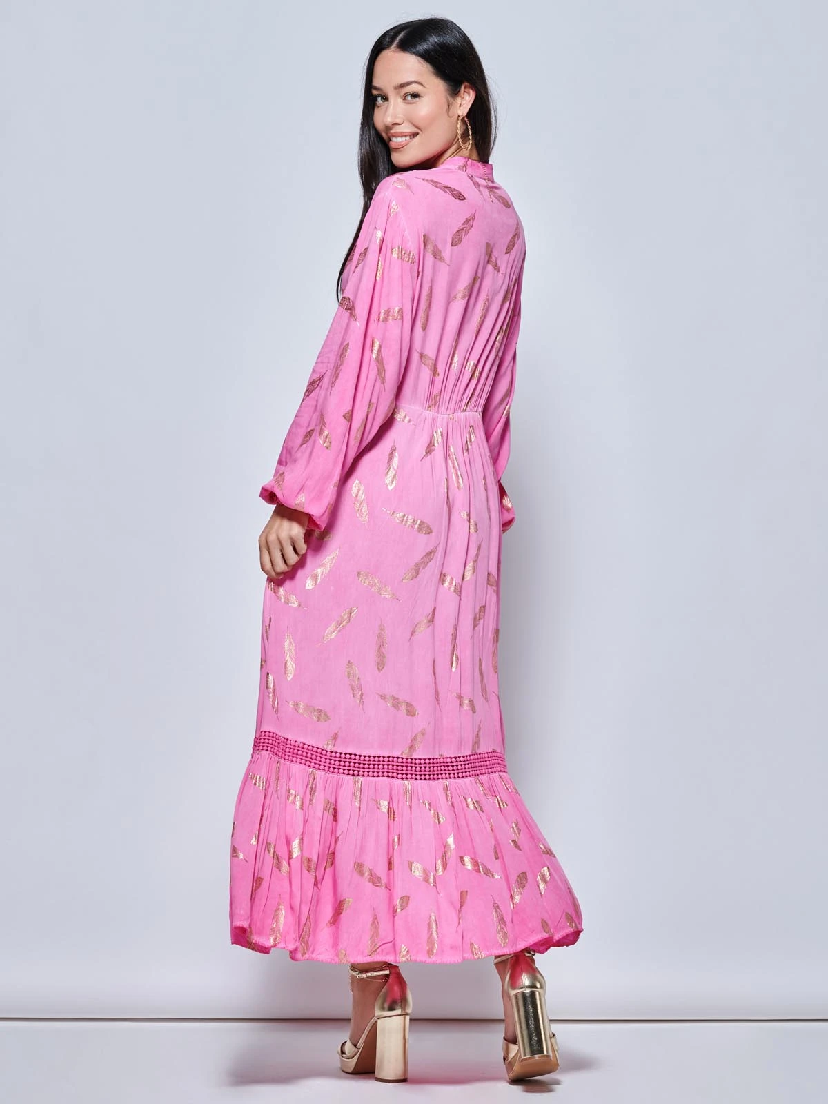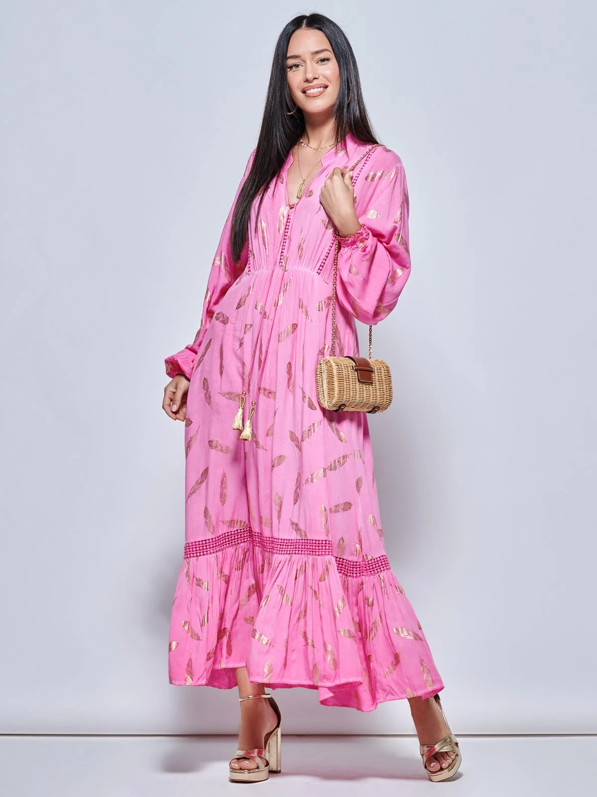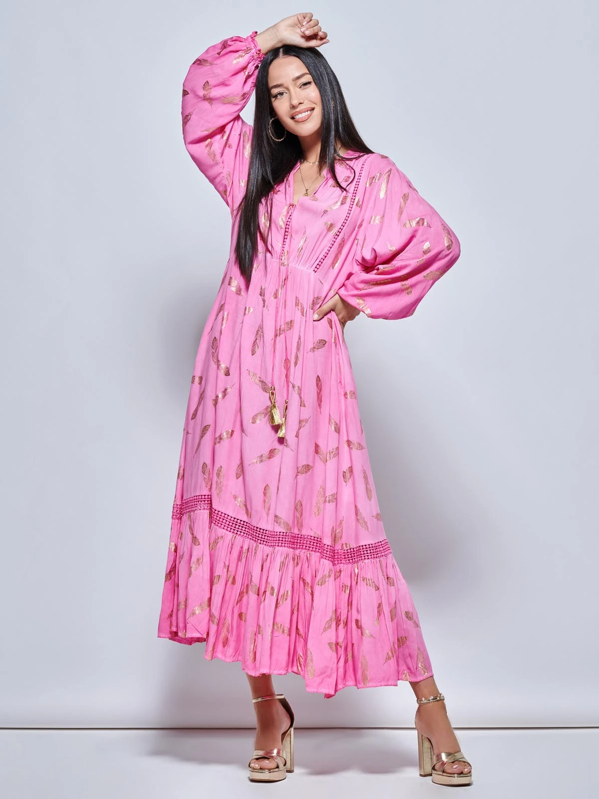Dress to impress with our long sleeved holiday maxi dress from Jolie Moi. Decorated with an on-trend gold effect feather print and crochet lace trim. The dress features long cropped sleeves, front tassle tie, and a frilly tiered hemline that falls to the floor. Dress it up or down for any occasion.