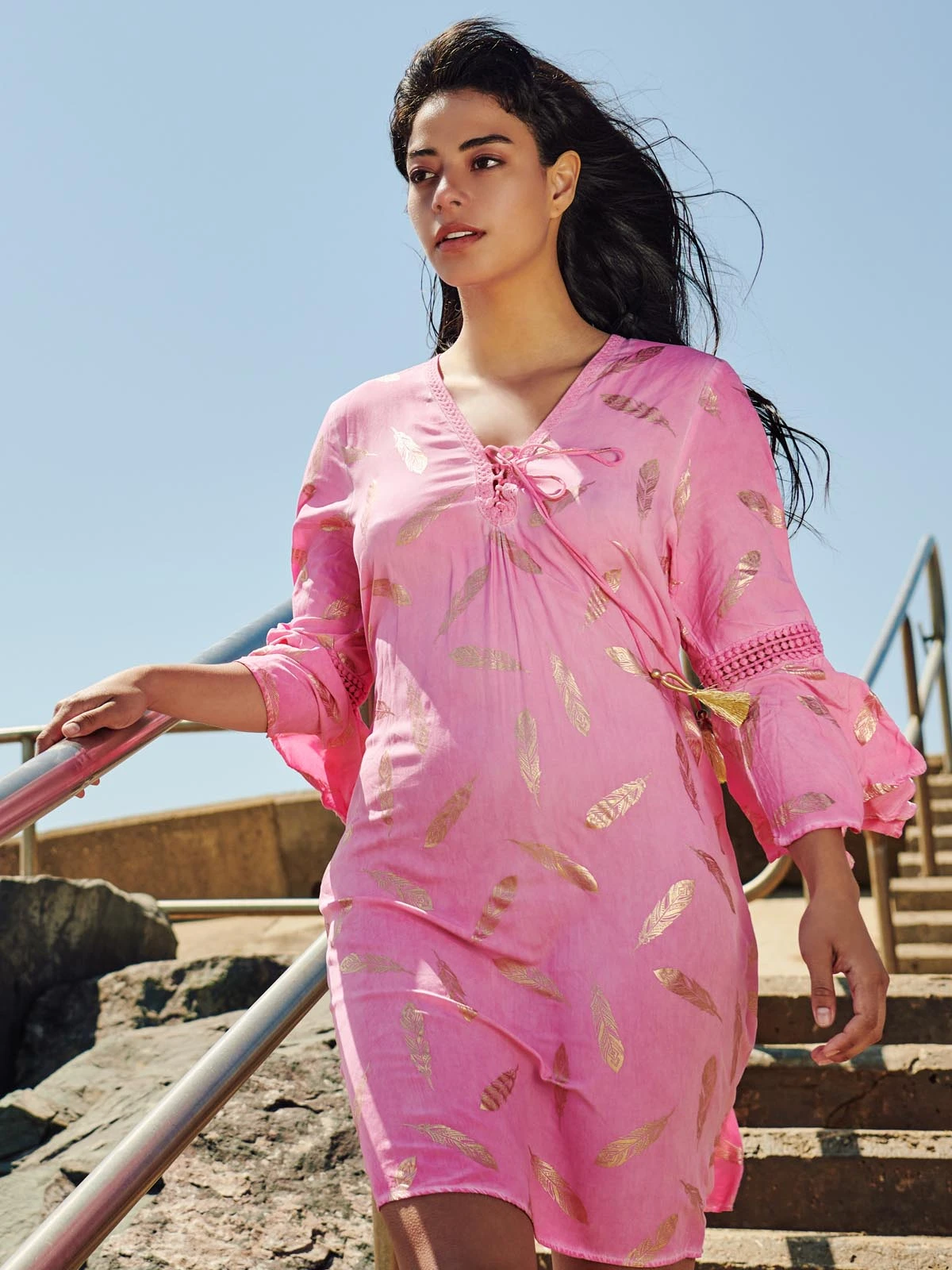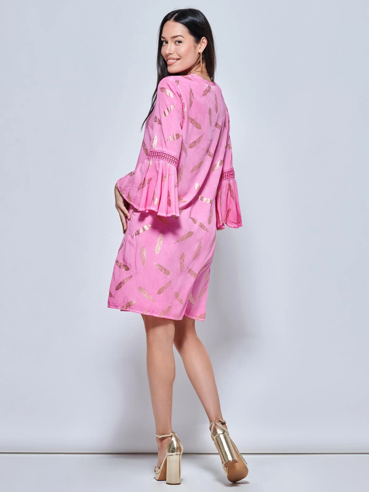 Dress up for your next vacation with our loose fitted holiday midi dress from Jolie Moi. Decorated with an on-trend gold effect feather print and crochet lace trim. The dress features frilly 3/4 kimono sleeves and a front tassle tie. Style it for any occasion with a pair of sandals or heels.