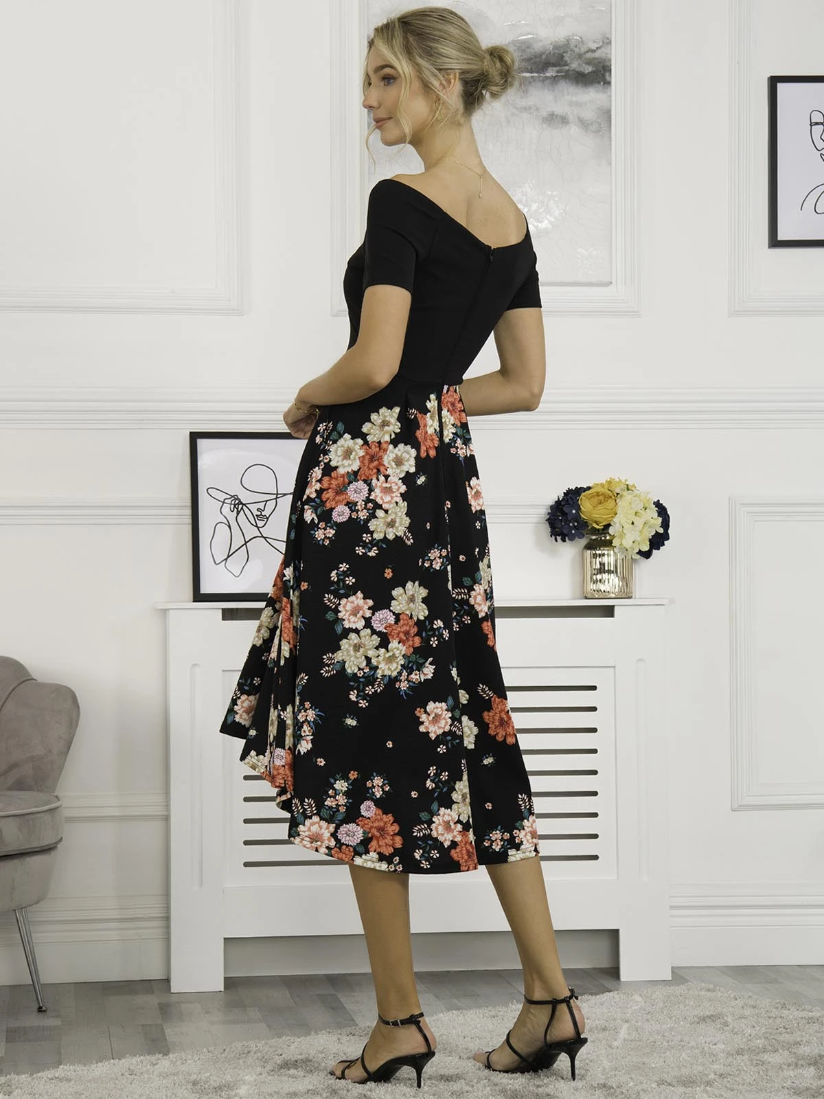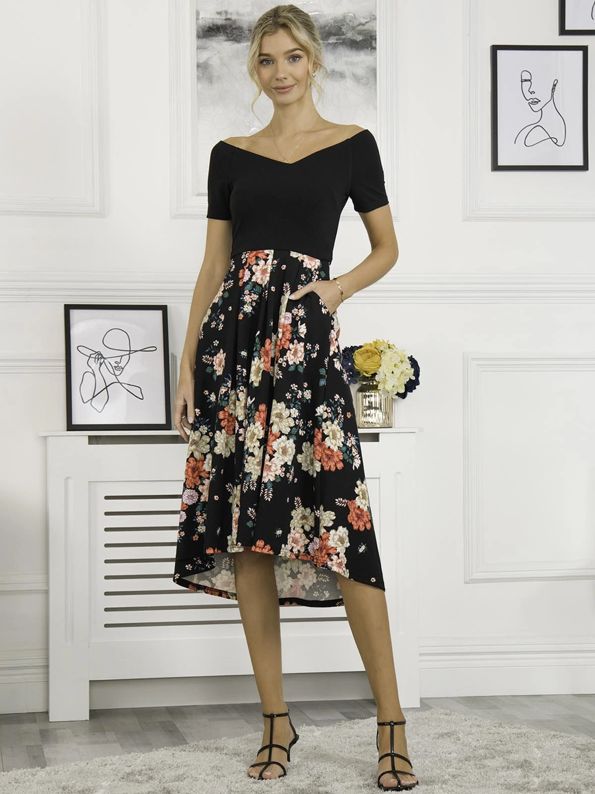 Combining style and simplicity with the Vianna contrast 2in1 midi dress from Jolie Moi. Our 2in1 dress is a quick and easy alternative for the fashionista on the go. The skirt is doused with our beautiful floral print and features a high low midi construction, the top has short sleeves and a wide v-neckline that comfortably sits on the shoulders. Crafted from our knitted scuba fabric. Match it with a pair of sandals or heels to get a picture ready look in minutes.Â