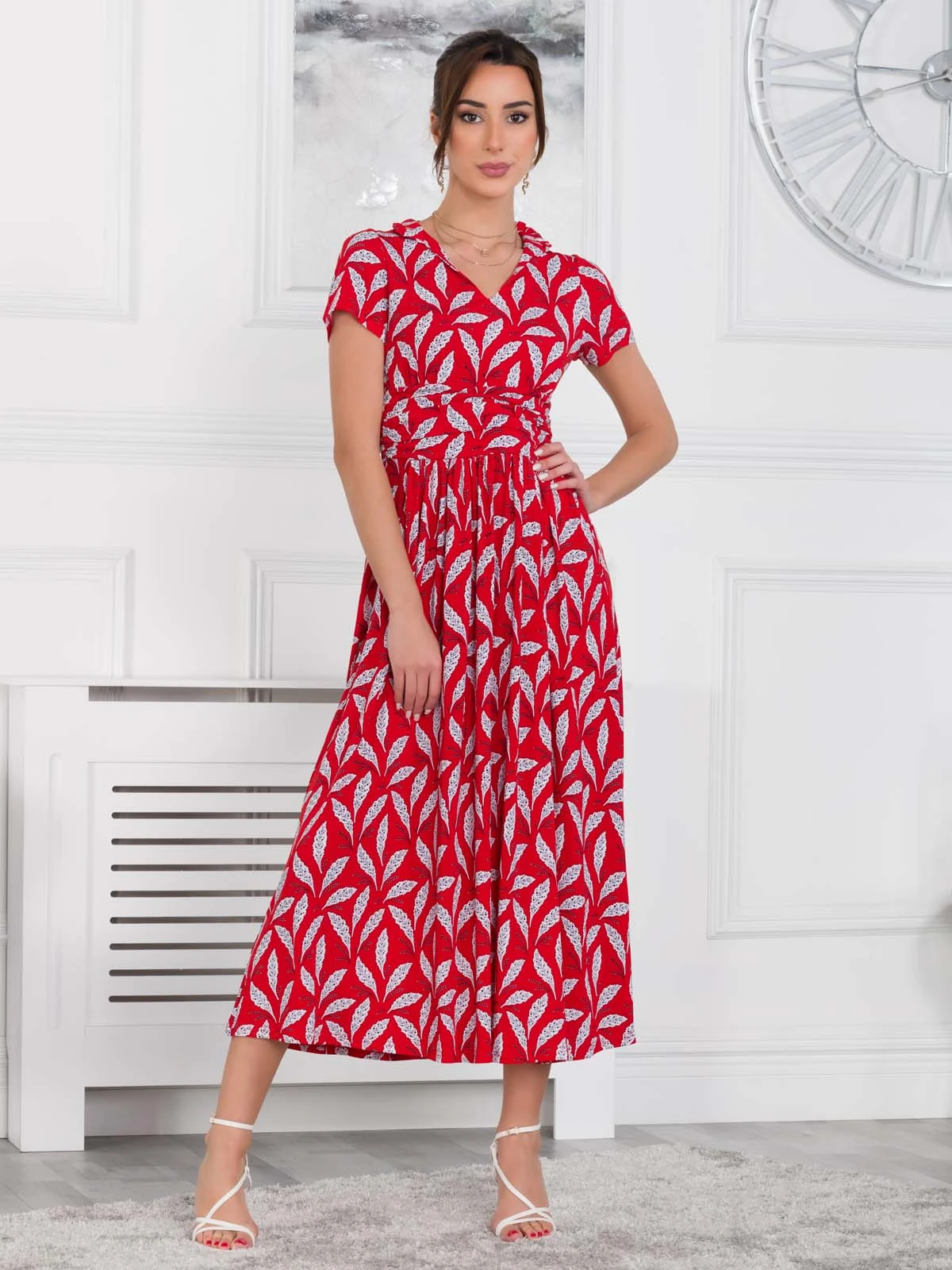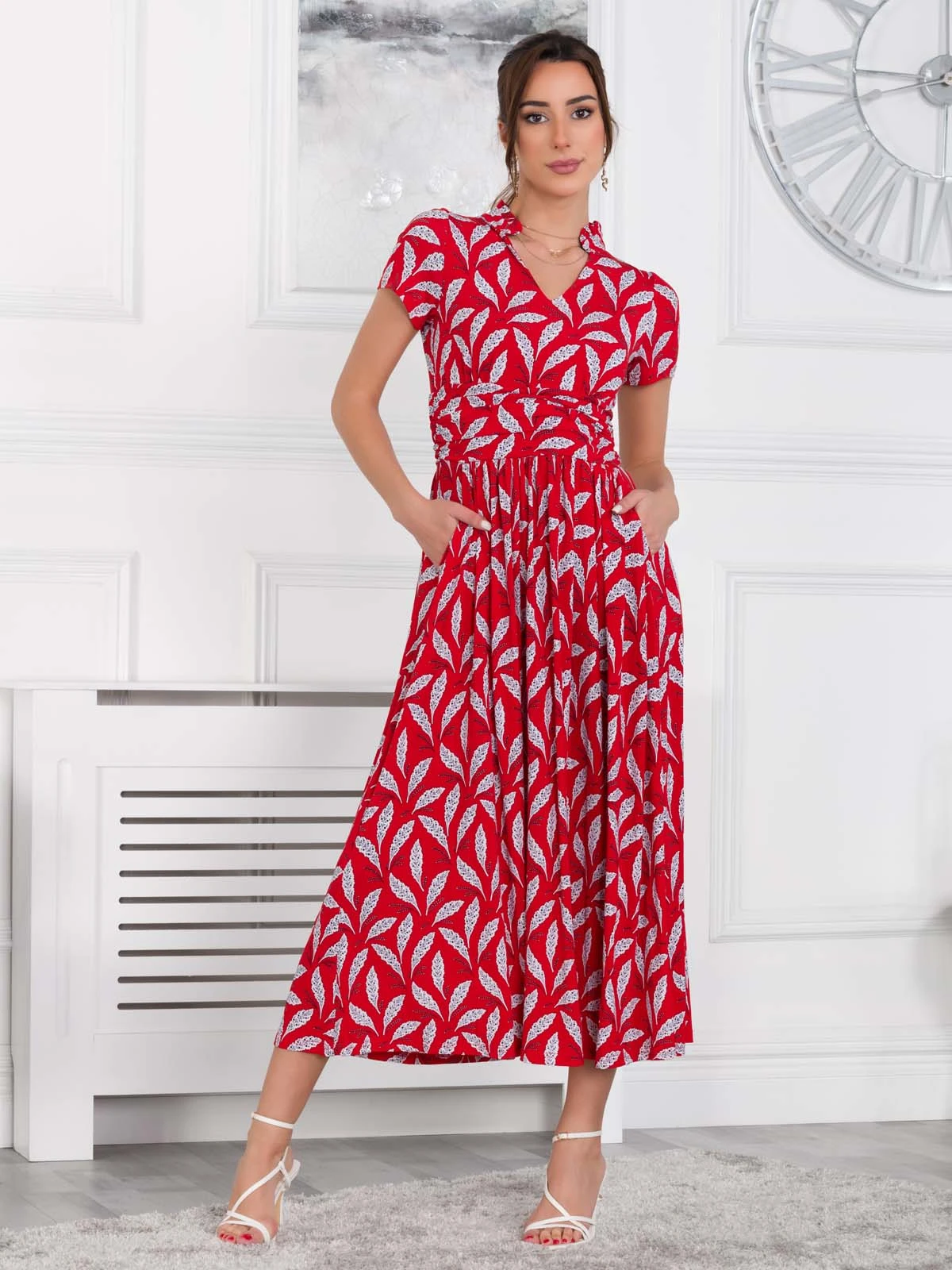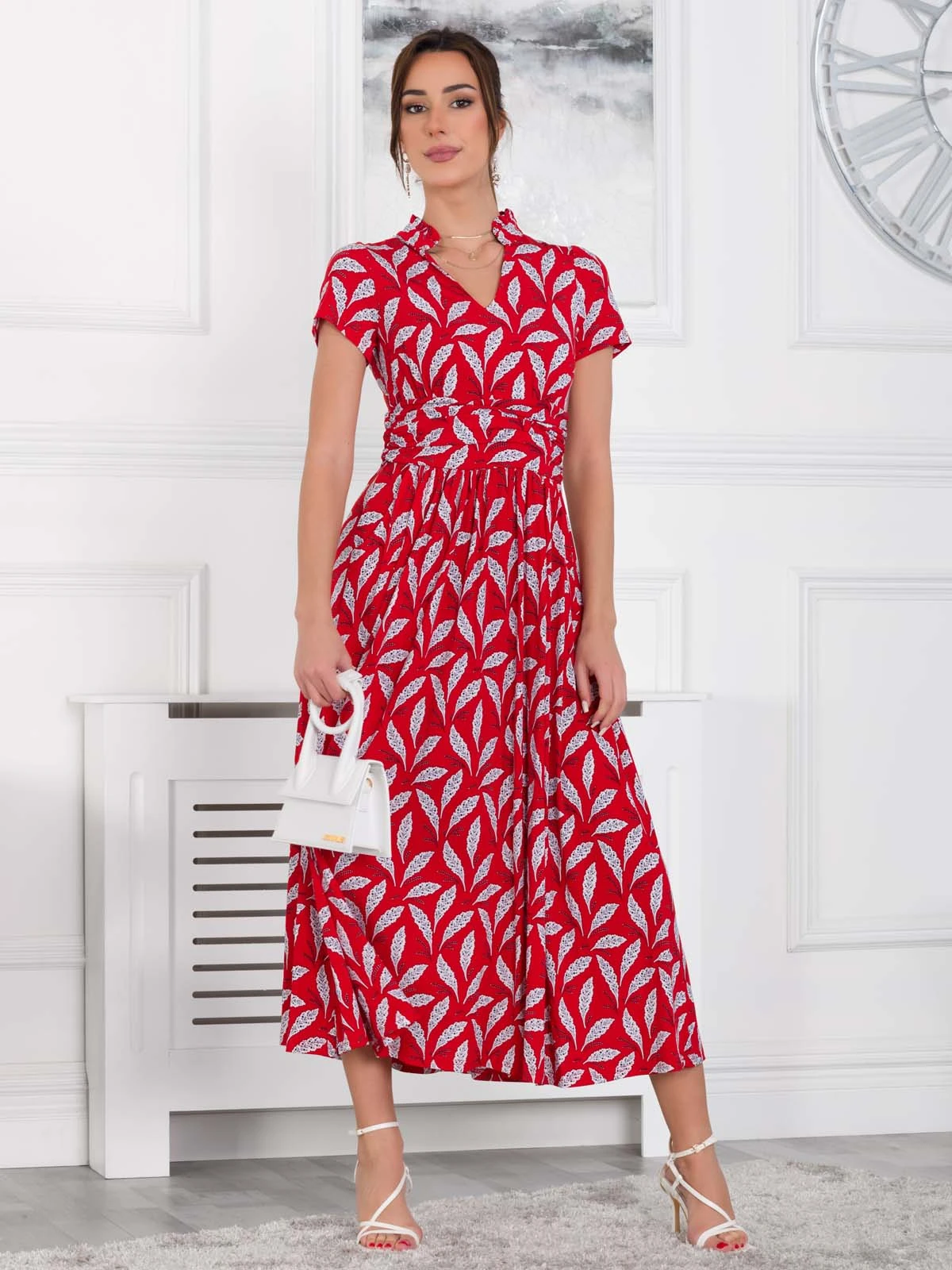 Crafted from comfortable jersey fabric in an elegant maxi silhouette, this dress is decorated with a pretty retro print and features a V-neckline and a frilled stand-up collar. It features a nipped-in ruched waistband to create a smooth shape and falls to the ankle adding an elegant flow. Team with flats for casual days or pair with heels for a dressed-up look.