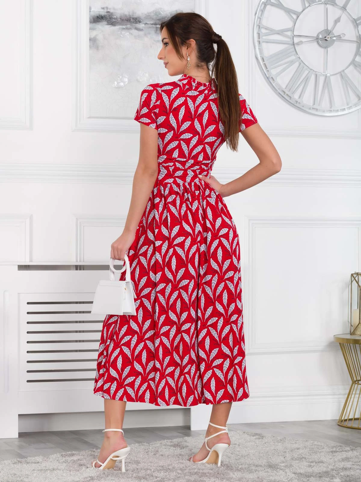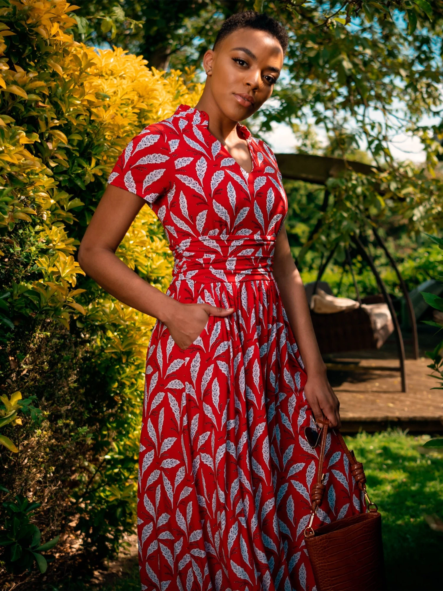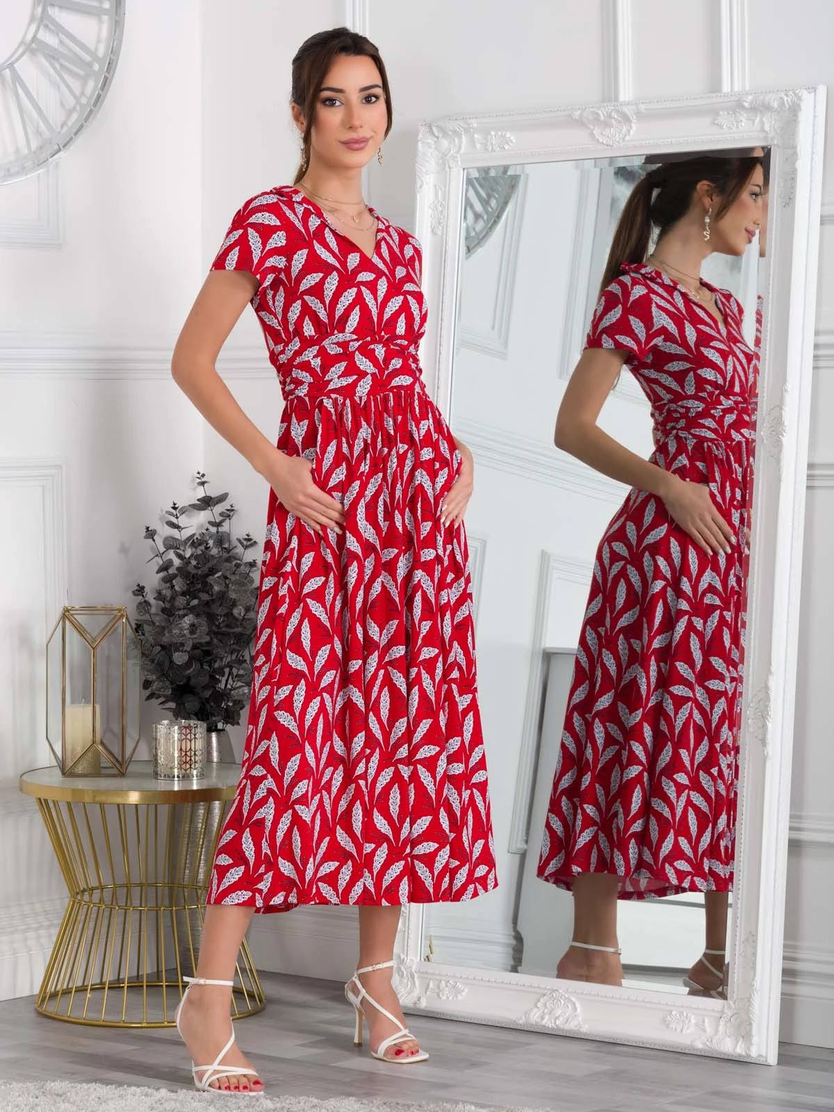 Crafted from comfortable jersey fabric in an elegant maxi silhouette, this dress is decorated with a pretty retro print and features a V-neckline and a frilled stand-up collar. It features a nipped-in ruched waistband to create a smooth shape and falls to the ankle adding an elegant flow. Team with flats for casual days or pair with heels for a dressed-up look.