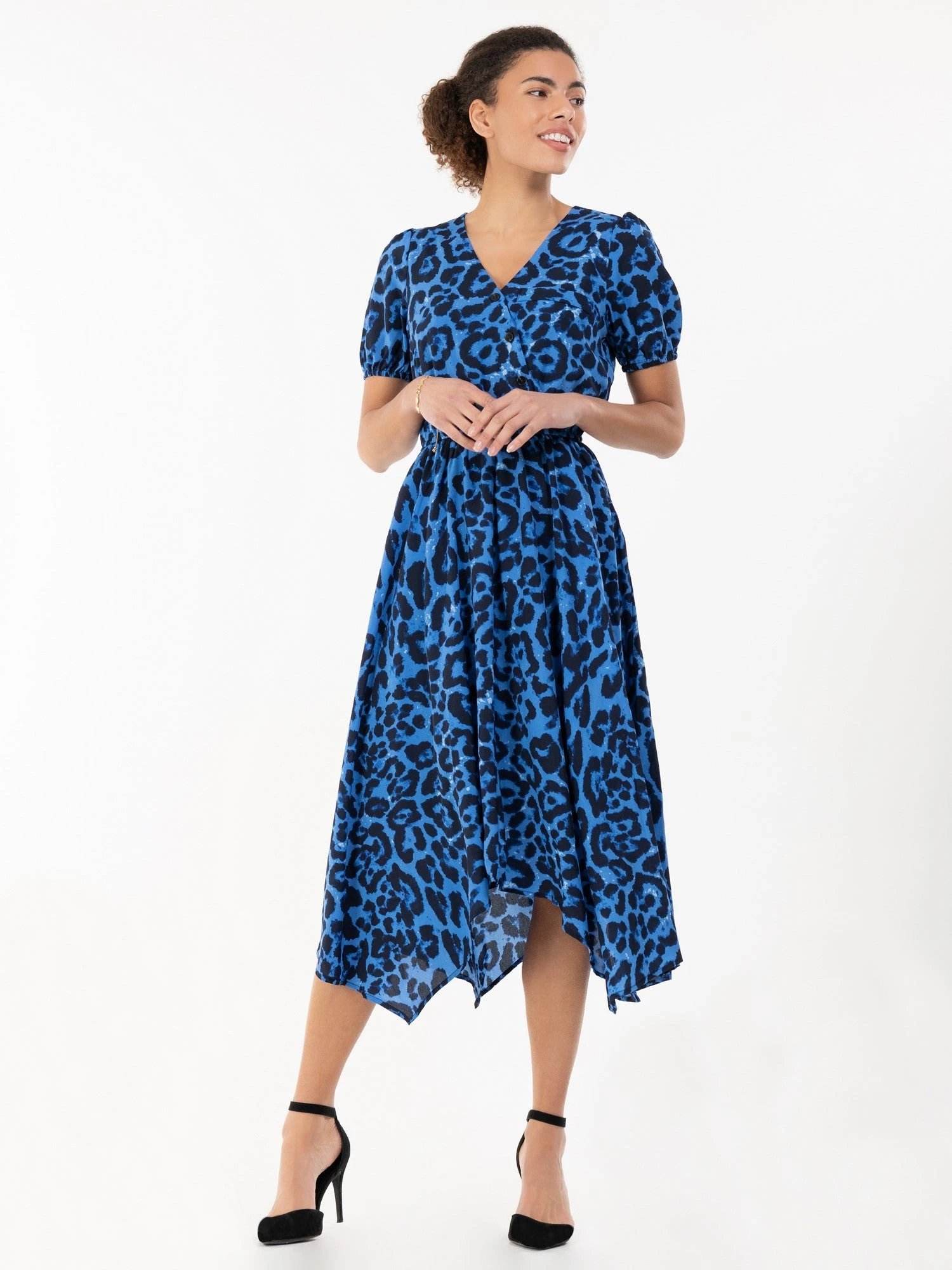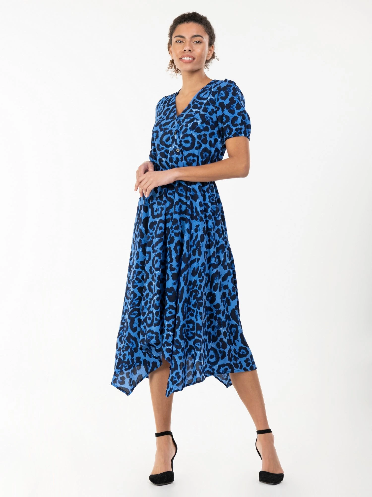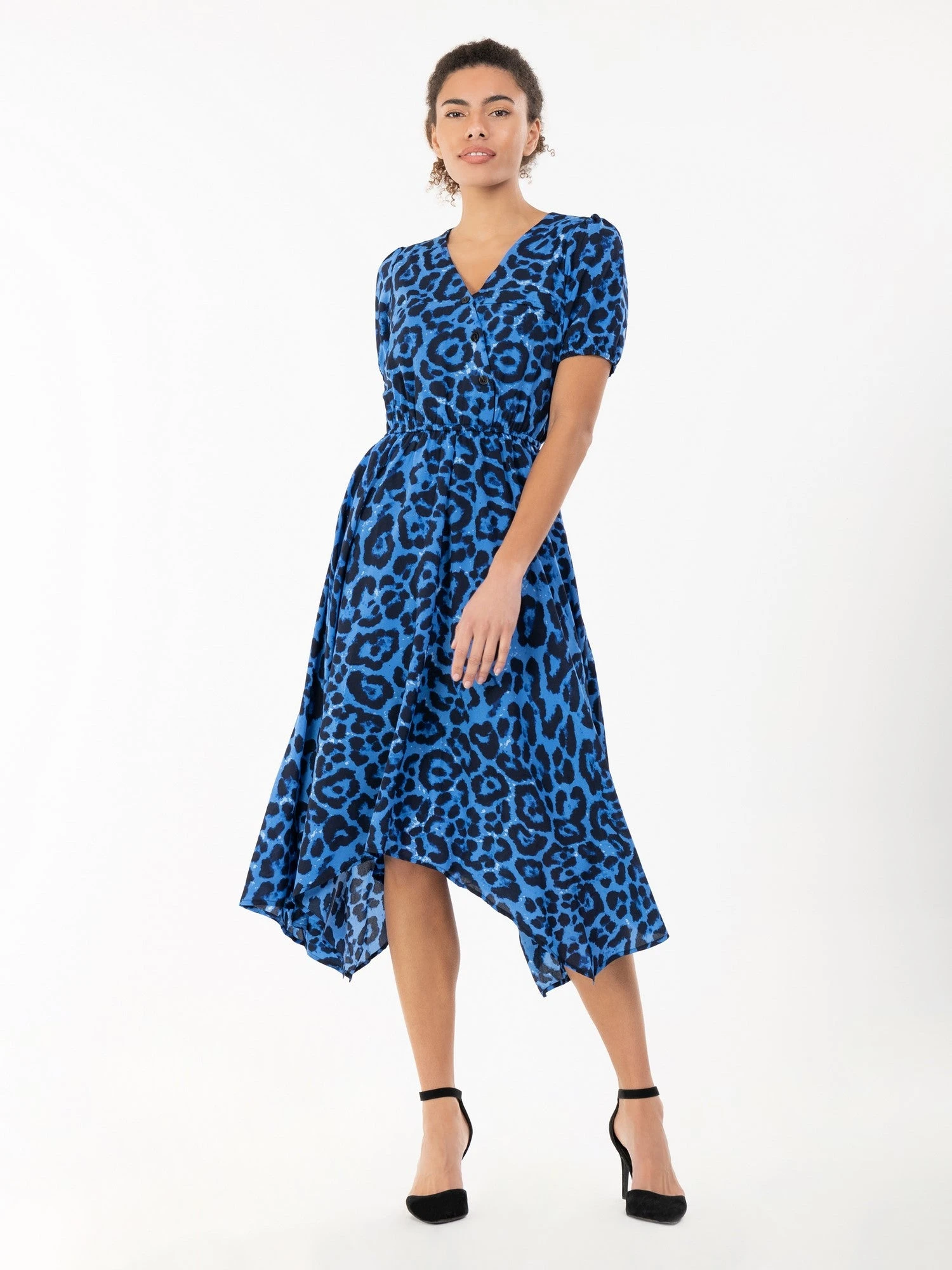 Flaring out at the hem for a feminine silhouette, this dress by Jolie Moi adds impact with a flowing handkerchief hemline. Crafted from a soft woven fabric with lining for comfort, it is framed with a faux-wrap V-neck front with statement button detailing and completed with an elasticated waist and side pockets. Wears well with strappy heels for a polished office look or plimsolls for casual catch-ups.
