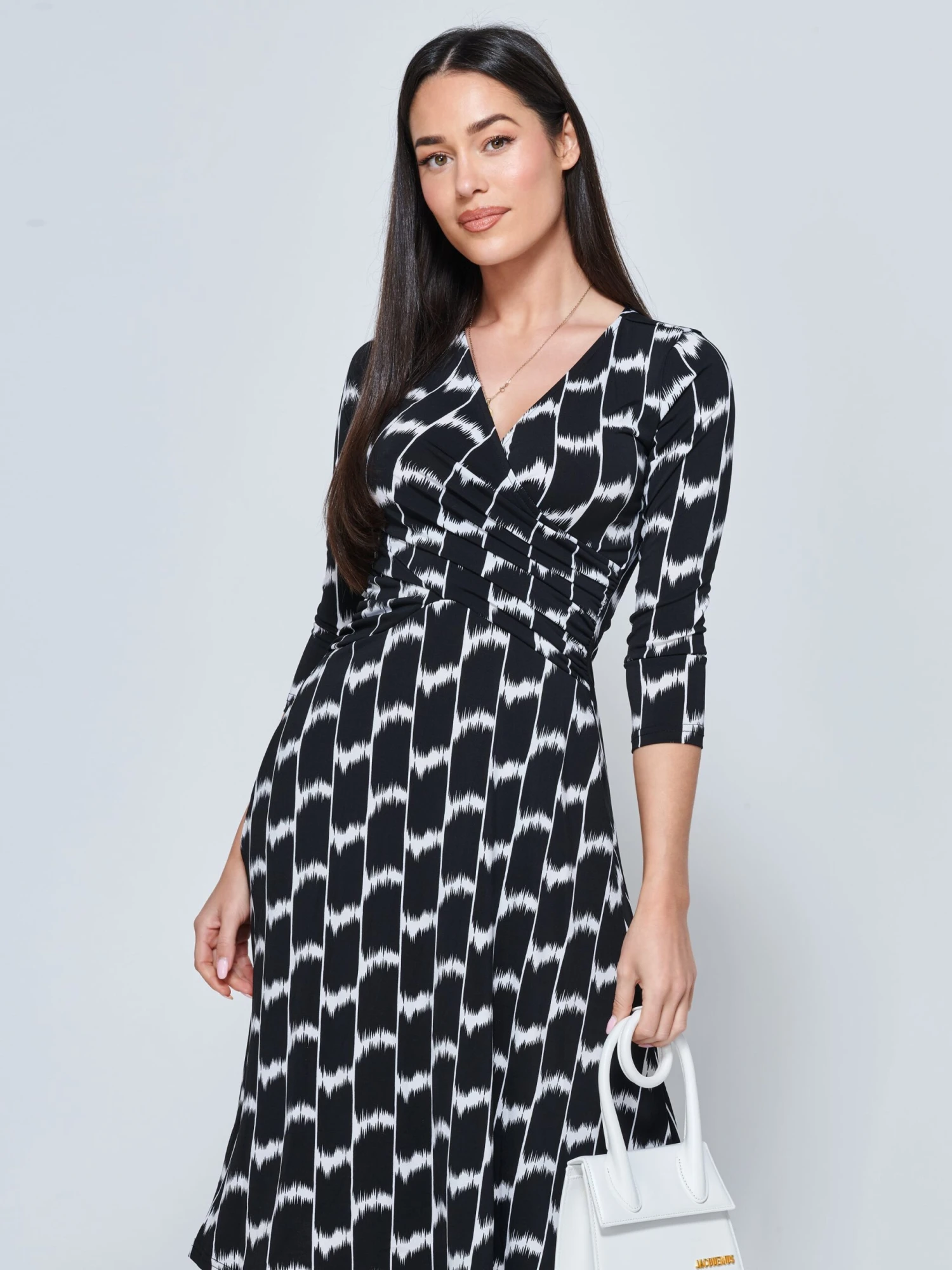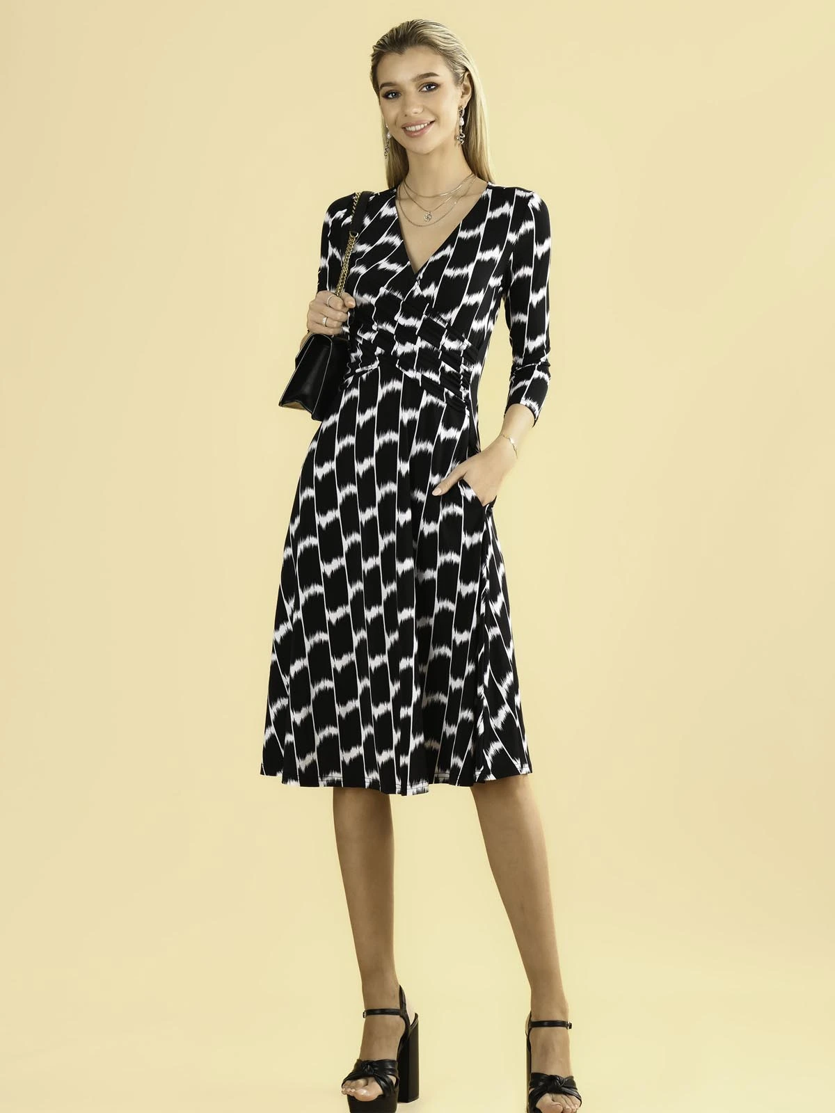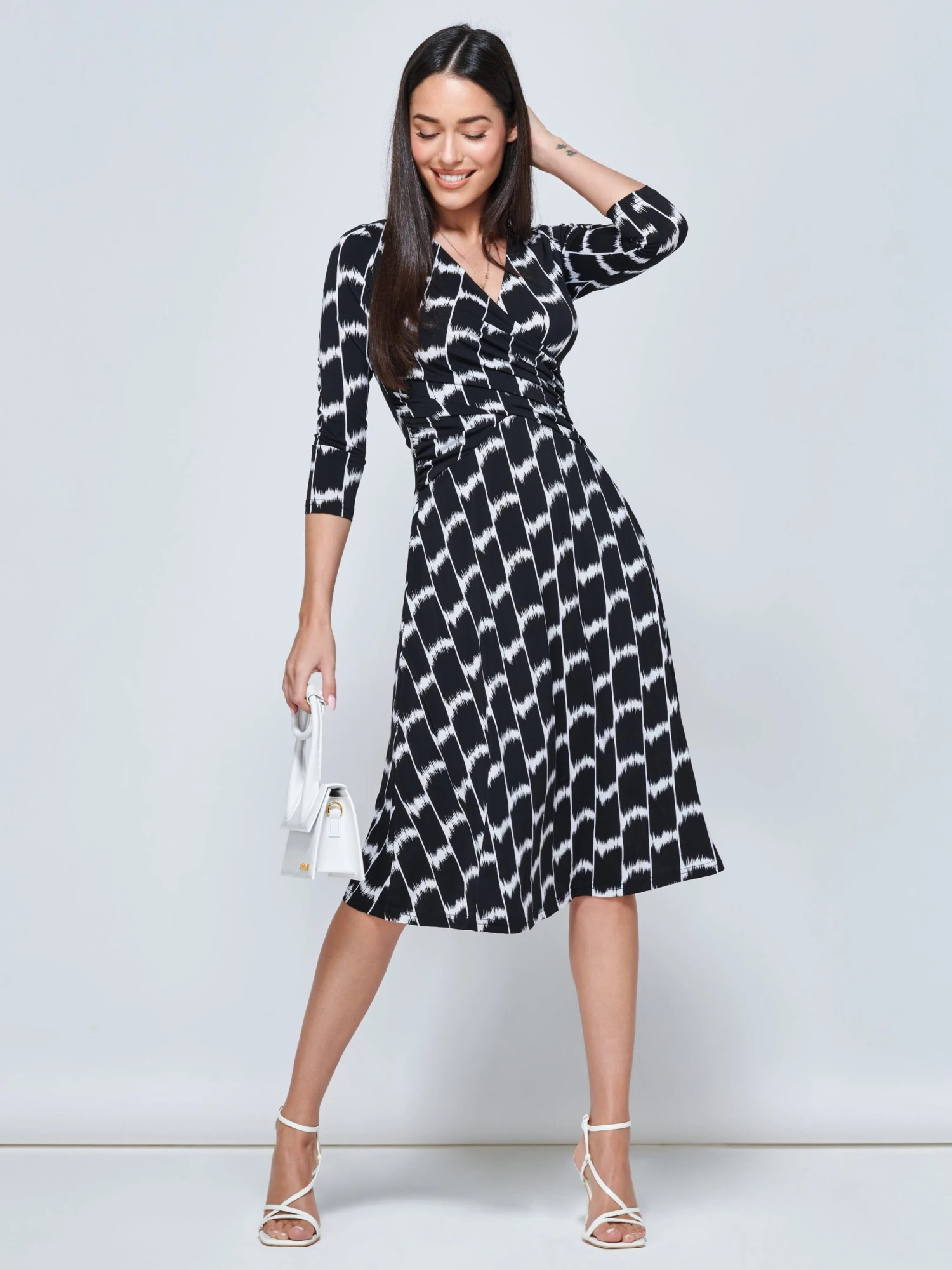 Jump into the light and breezy Odilla midi dress from Jolie Moi. Covered in a striking geometric pattern print, the Odilla features a ruched elasticated waistband for a form-flattering silhouette, 3/4 cropped sleeves and 2 side pockets. Crafted from our signature non-static and crease-proof fabric.Â