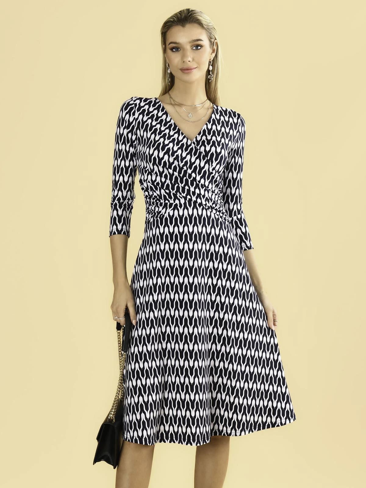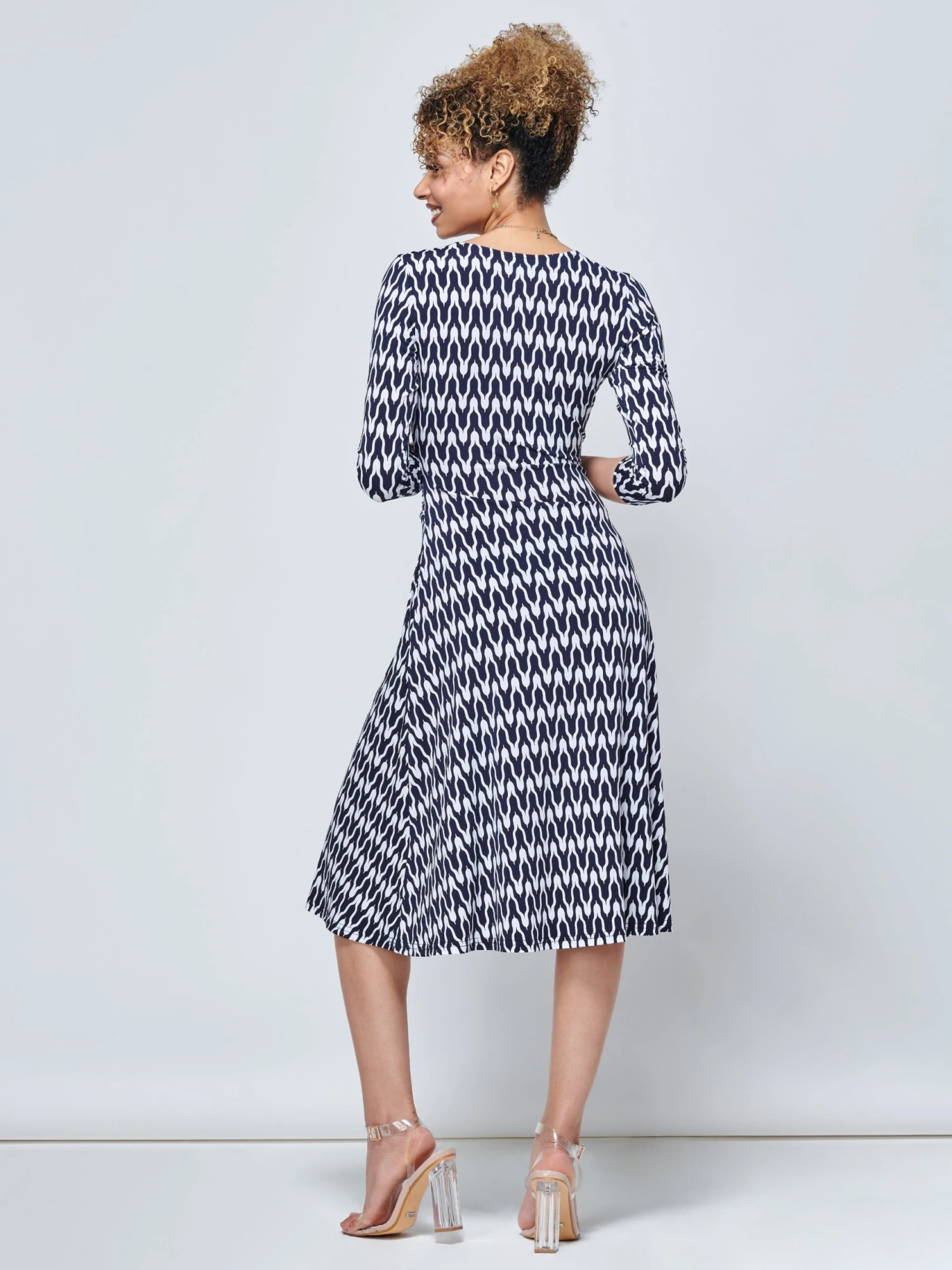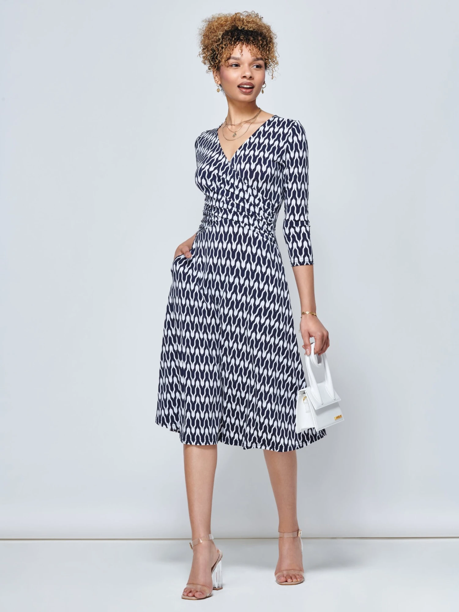 Jump into the light and breezy Odilla midi dress from Jolie Moi. Covered in a striking geometric pattern print, the Odilla features a ruched elasticated waistband for a form-flattering silhouette, 3/4 cropped sleeves and 2 side pockets. Crafted from our signature non-static and crease-proof fabric.Â
