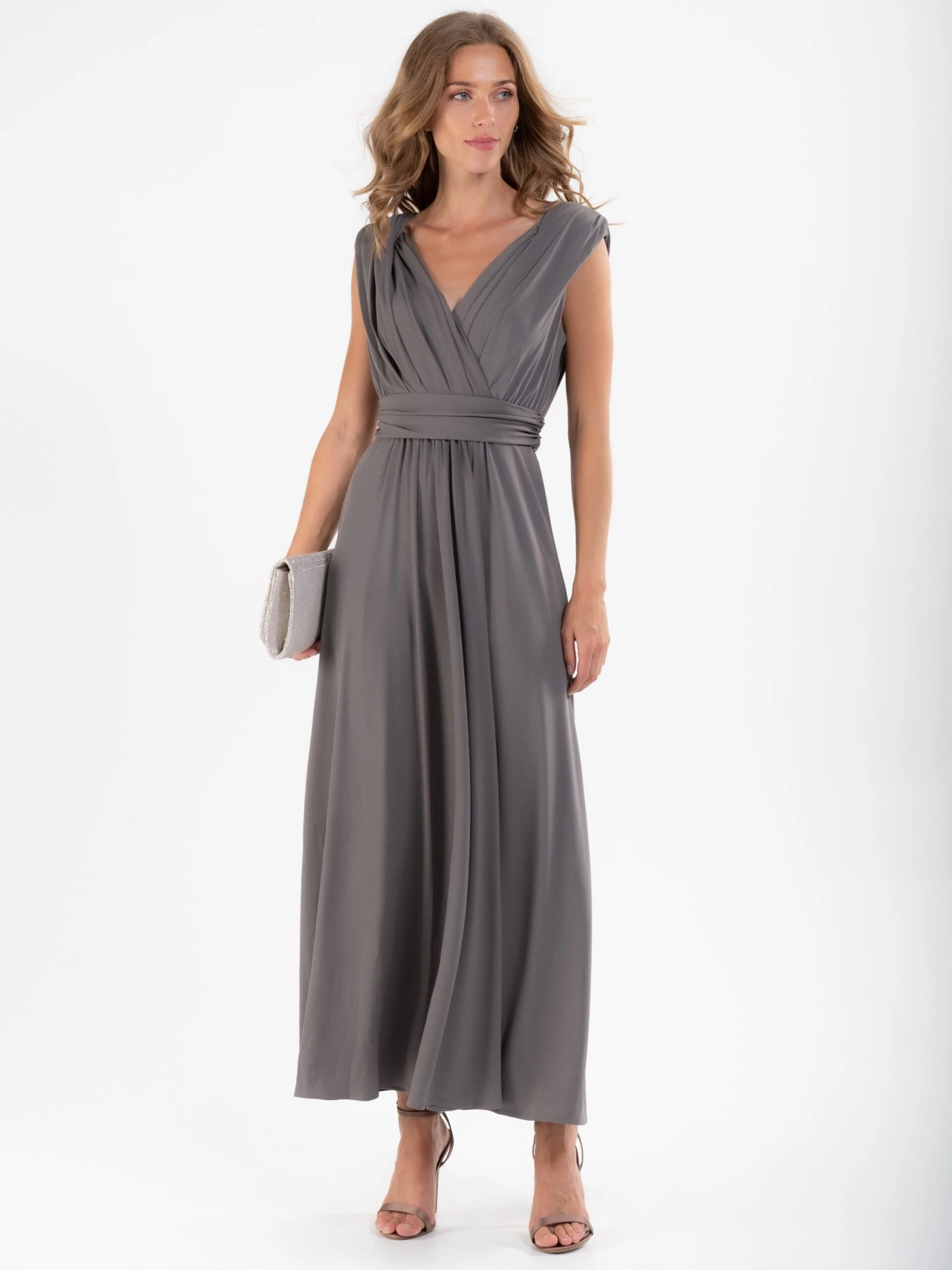 Opt for classic elegance in this draped dress from Jolie Moi. Crafted in a smooth and fluid stretchy fabric, this piece not only offers a comfortable fit, but a beautifully draped silhouette. Pleating detail adorns the wrap-over body and the skirt, adding graceful movement to its floor sweeping length. It’s waist is cinched with a pleated band, while the back reveals a deep V-back and an invisible zip fastening for a delicate touch.