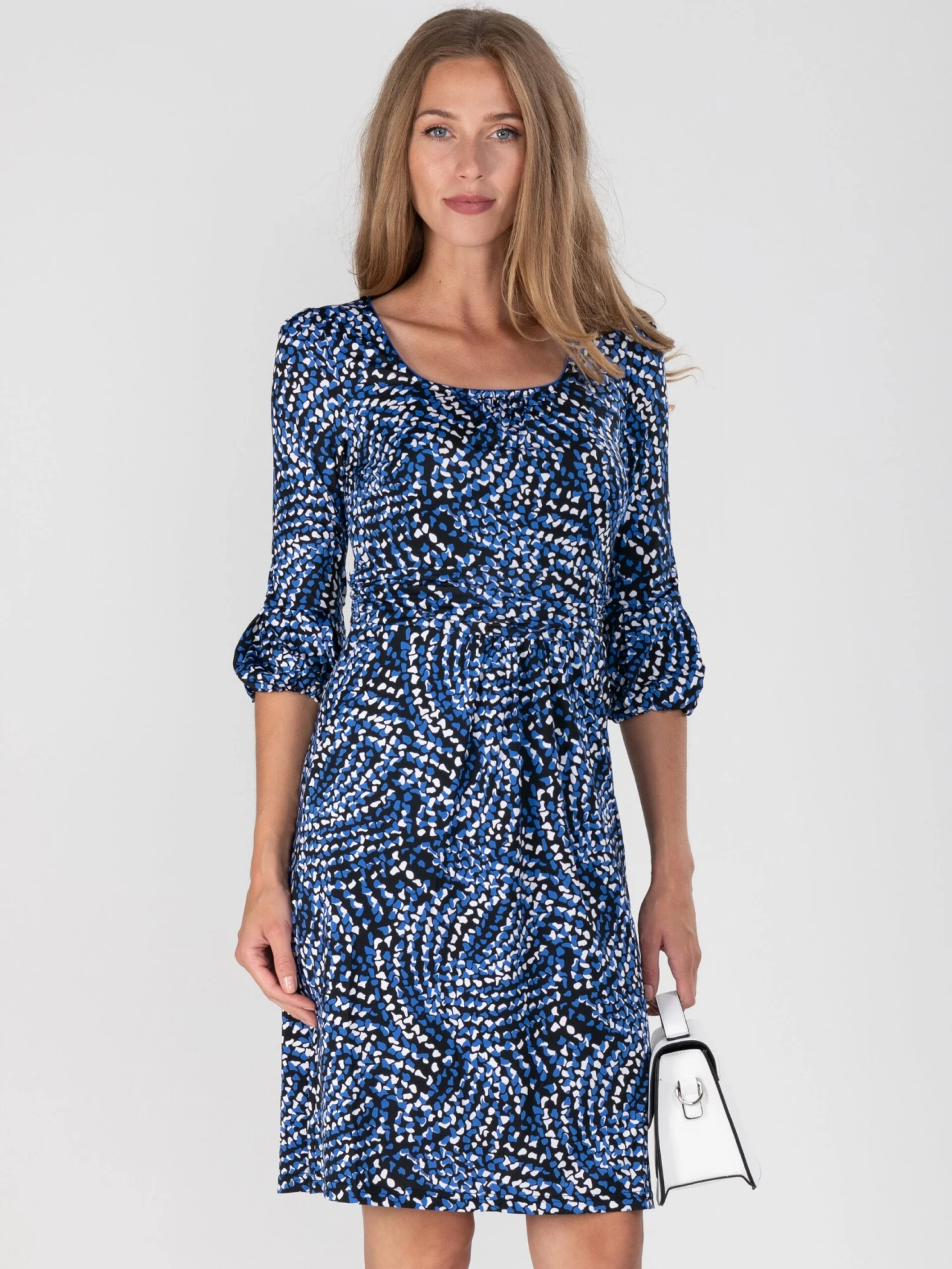 Bring a subtle retro flair to your daytime dressing with this printed jersey dress from Jolie Moi. Crafted from a soft stretchy jersey fabric, this design features a flattering boat neckline and an all over eye-catching retro pattern print. It is bound to win complements with its trendy 3/4 length balloon sleeve design and demure appeal making this dress suitable for work or weekend.