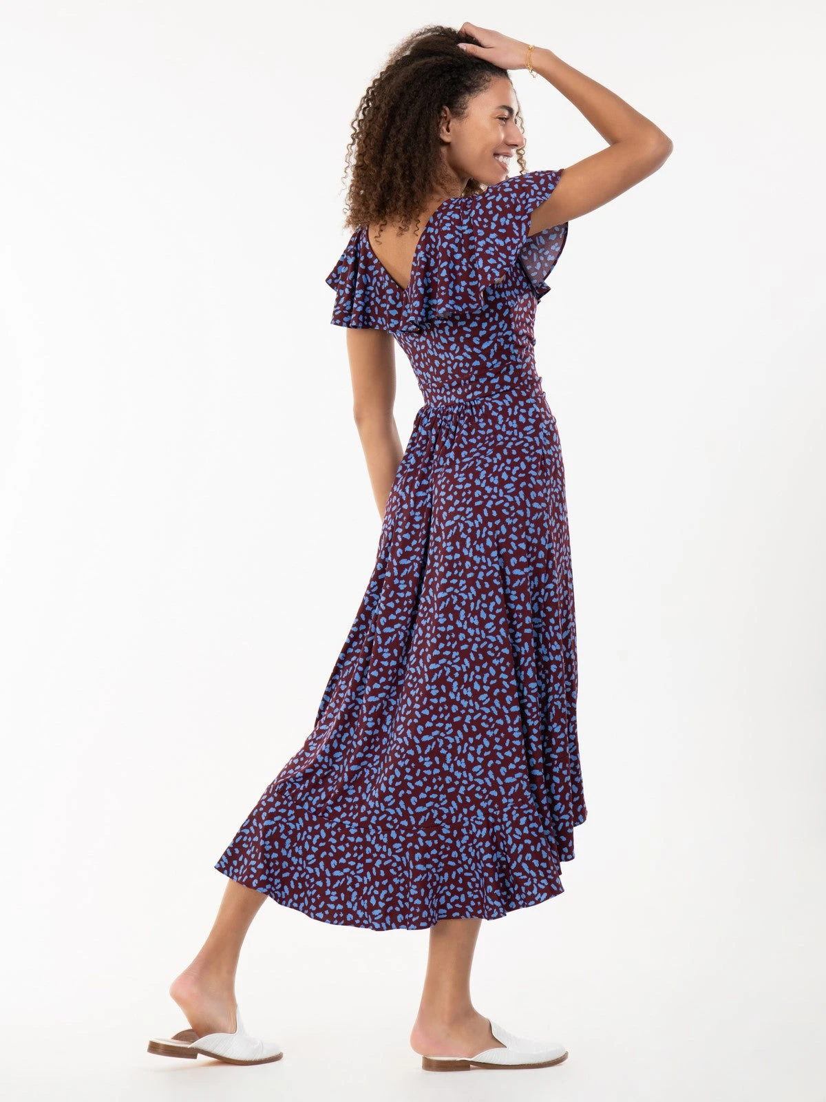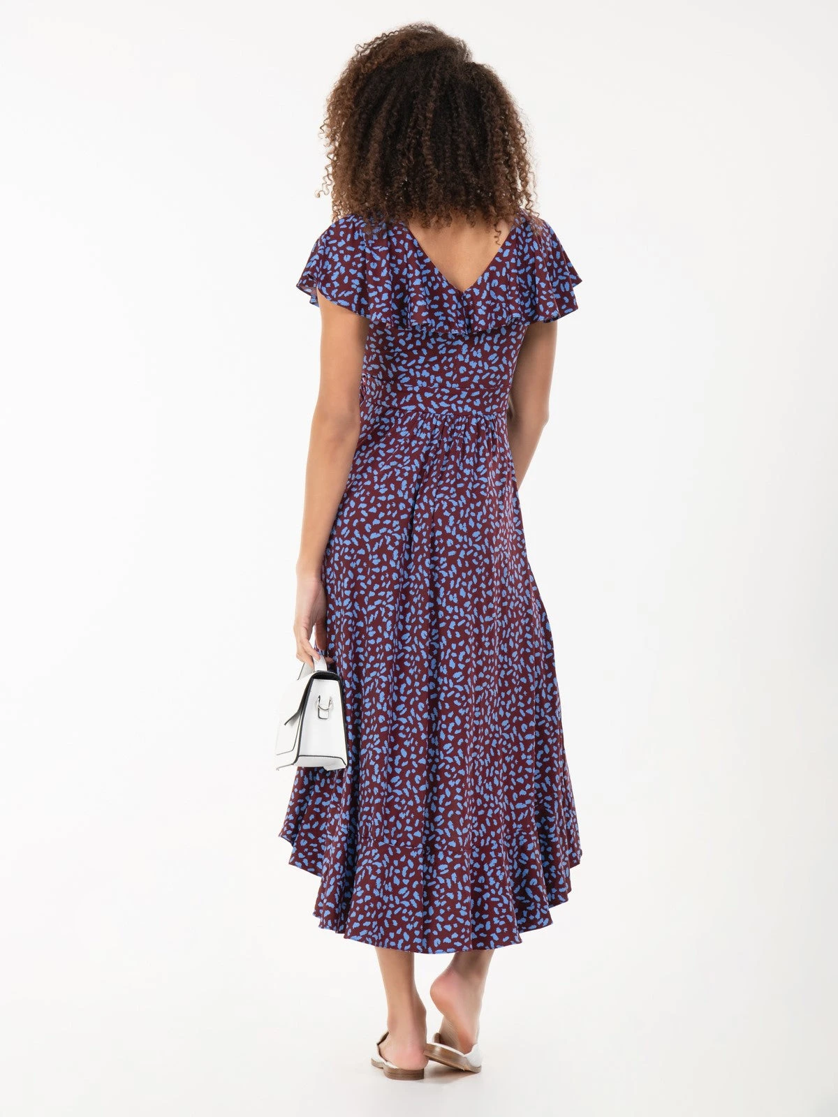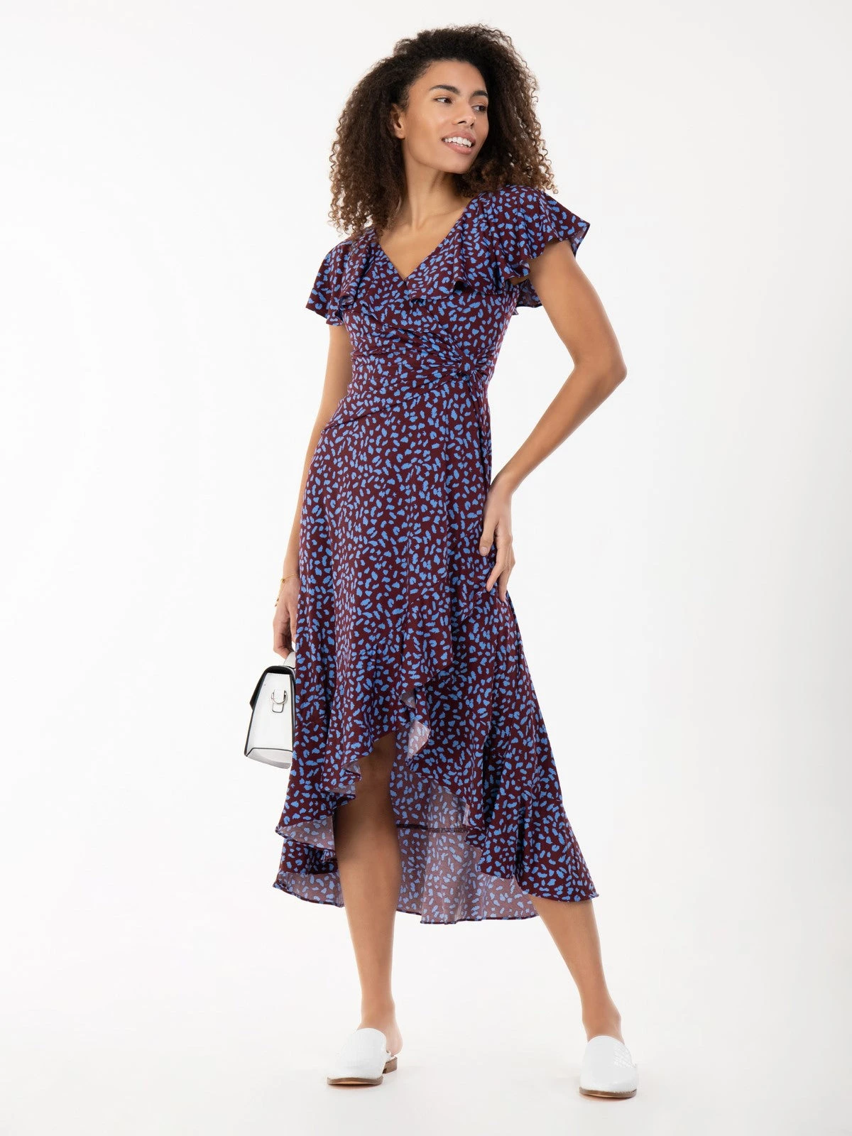 Floaty and fabulous – add this dip hem ruffle dress from Jolie Moi to your wardrobe for a look like no other. Crafted from a soft and fluid jersey fabric, this V-neck dress comes with oversize frilly collar which add interest and cover the shoulders, whilst the ruched waistband creates a form-flattering silhouette. Finished off with a handful of ruffles along the side and dipped hemline. In a refined style that softly drapes and flares out at the hem for added movement, this maxi dress by Jolie Moi is decorated in an on-trend animal print for wild appeal.Â