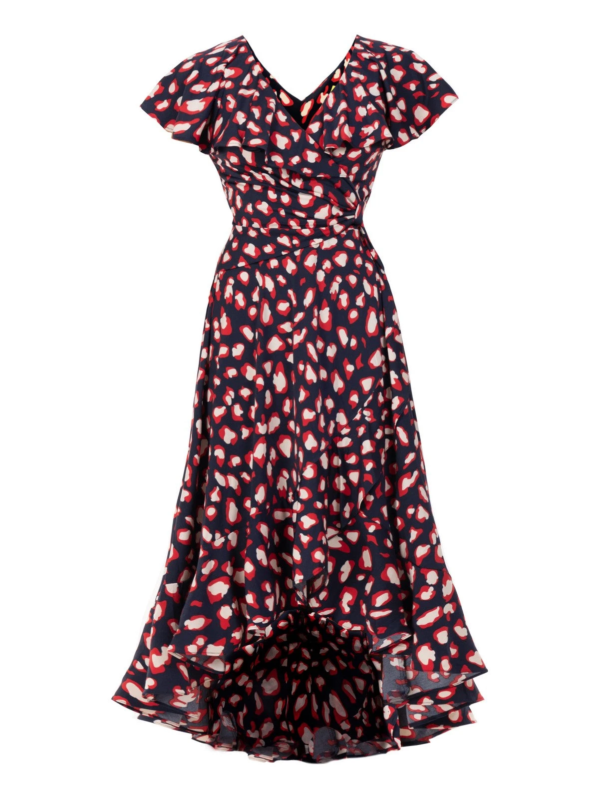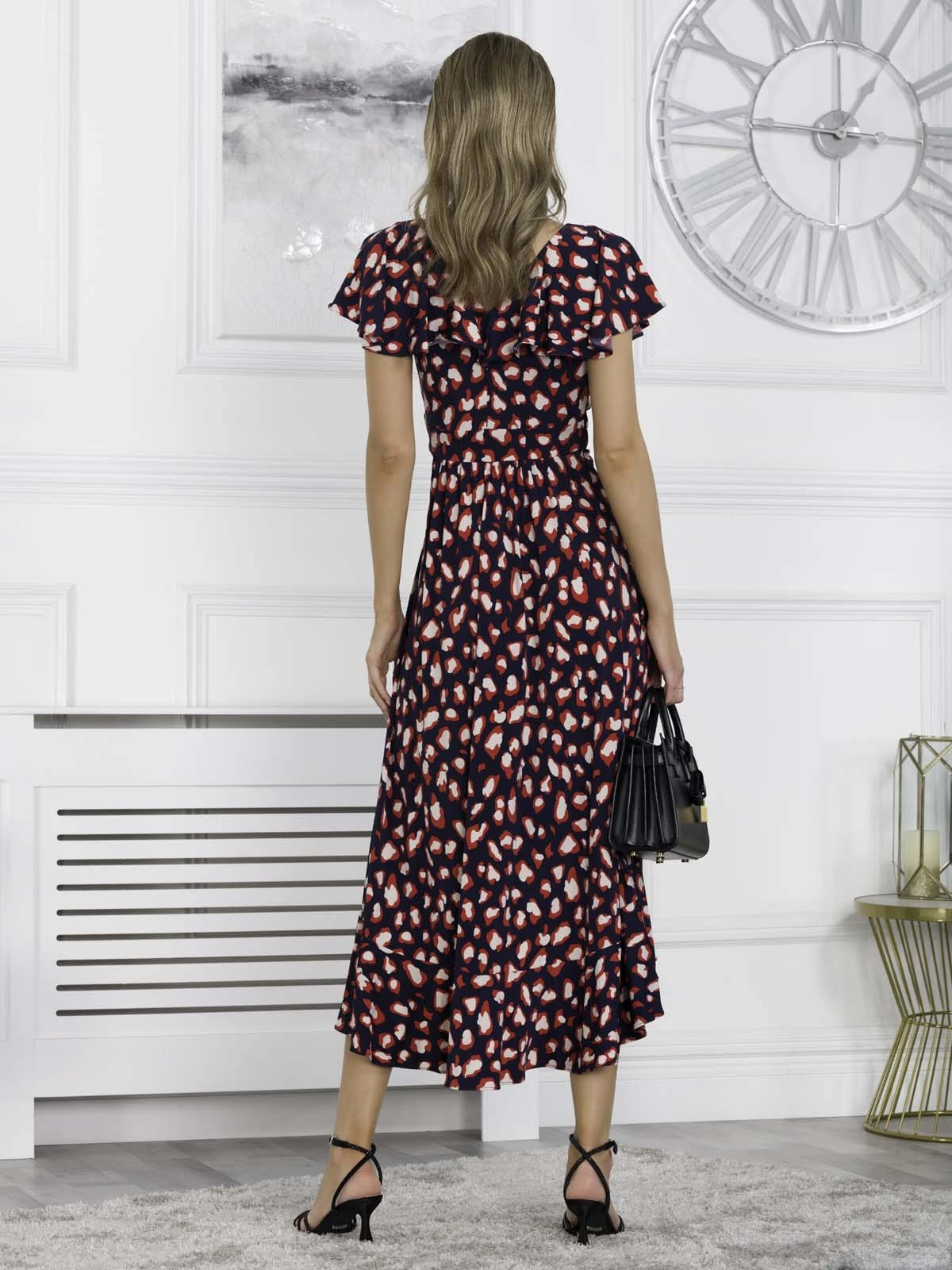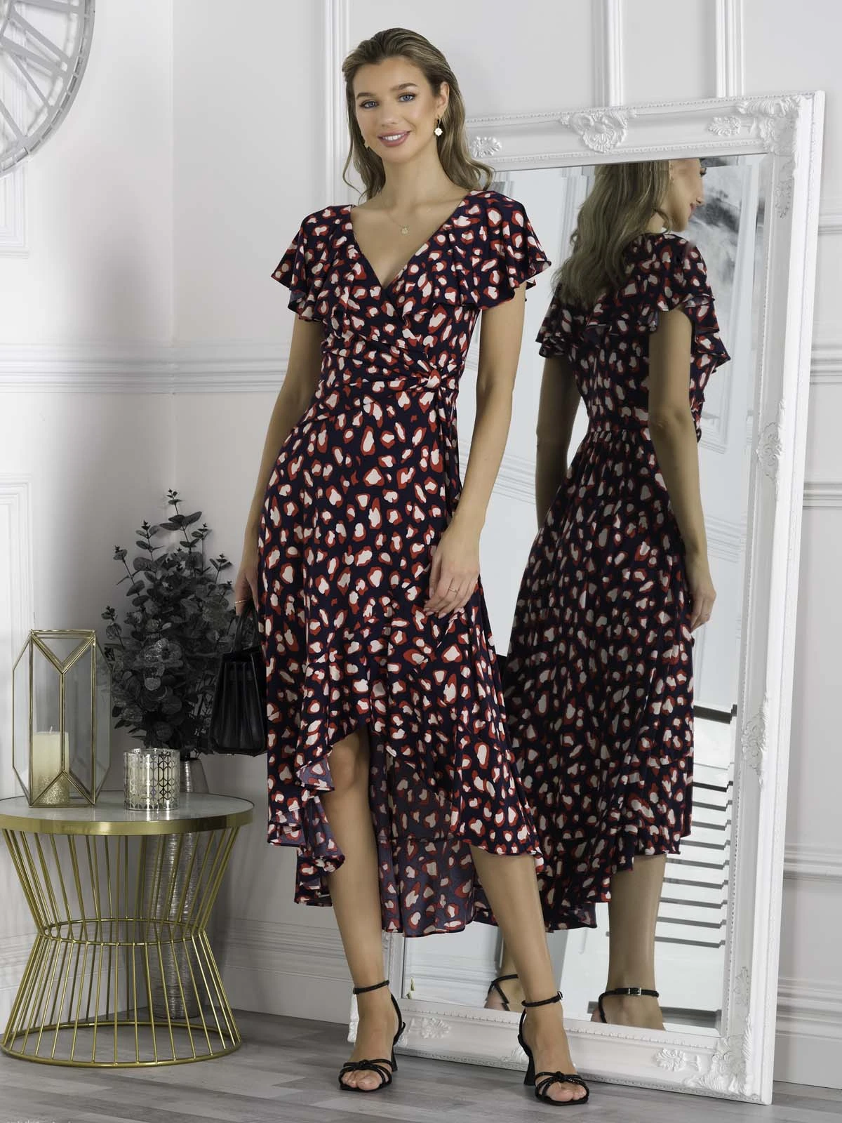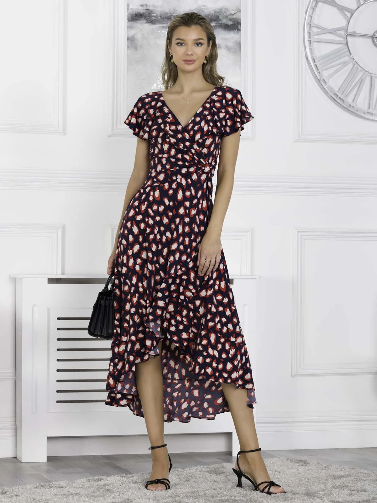 Floaty and fabulous – add this dip hem ruffle dress from Jolie Moi to your wardrobe for a look like no other. Crafted from a soft and fluid jersey fabric, this V-neck dress comes with oversize frilly collar which add interest and cover the shoulders, whilst the ruched waistband creates a form-flattering silhouette. Finished off with a handful of ruffles along the side and dipped hemline. In a refined style that softly drapes and flares out at the hem for added movement, this maxi dress by Jolie Moi is decorated in an on-trend animal print for wild appeal.Â