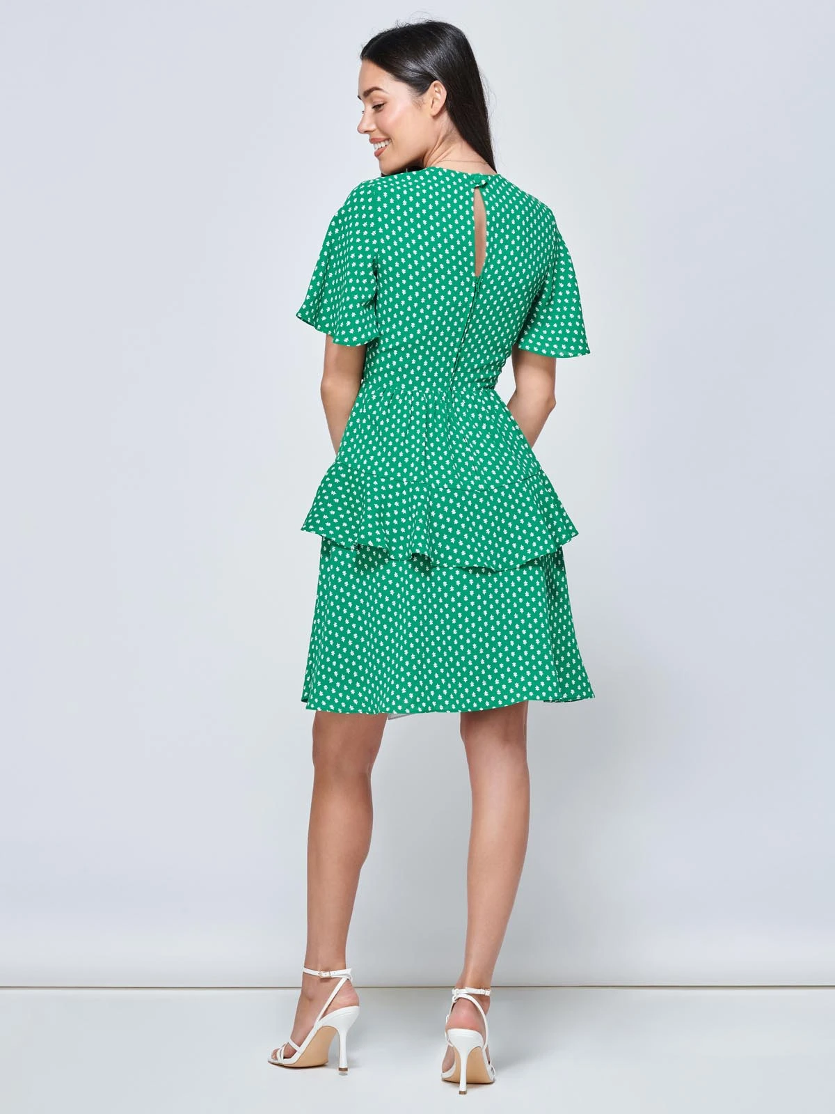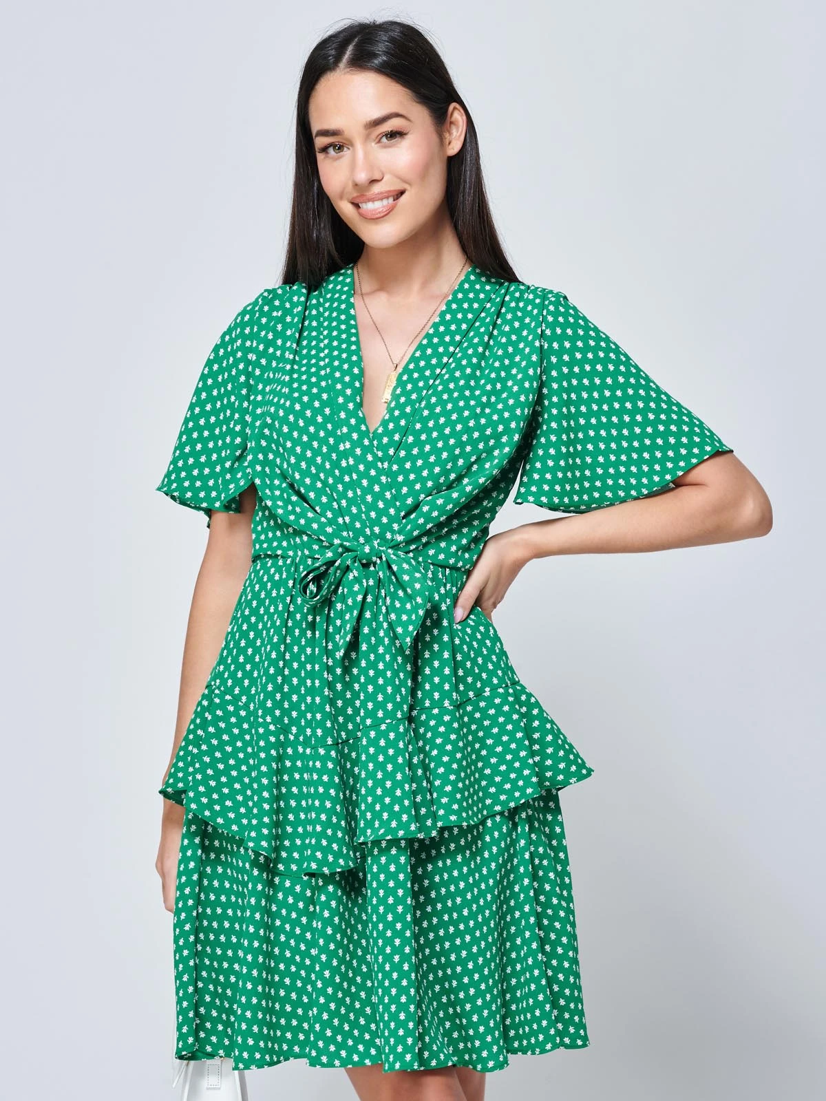 Jump into Spring with our new Priscila mini skater dress. Crafted from 100% woven polyester. Complimenting your shape with a self tie belt to get the perfect fit, short angel sleeves and a cute abstract spotted pattern. Throw on a pair of flats for a daytime look, or add heels and a small bag for the perfect day to night look with the girls