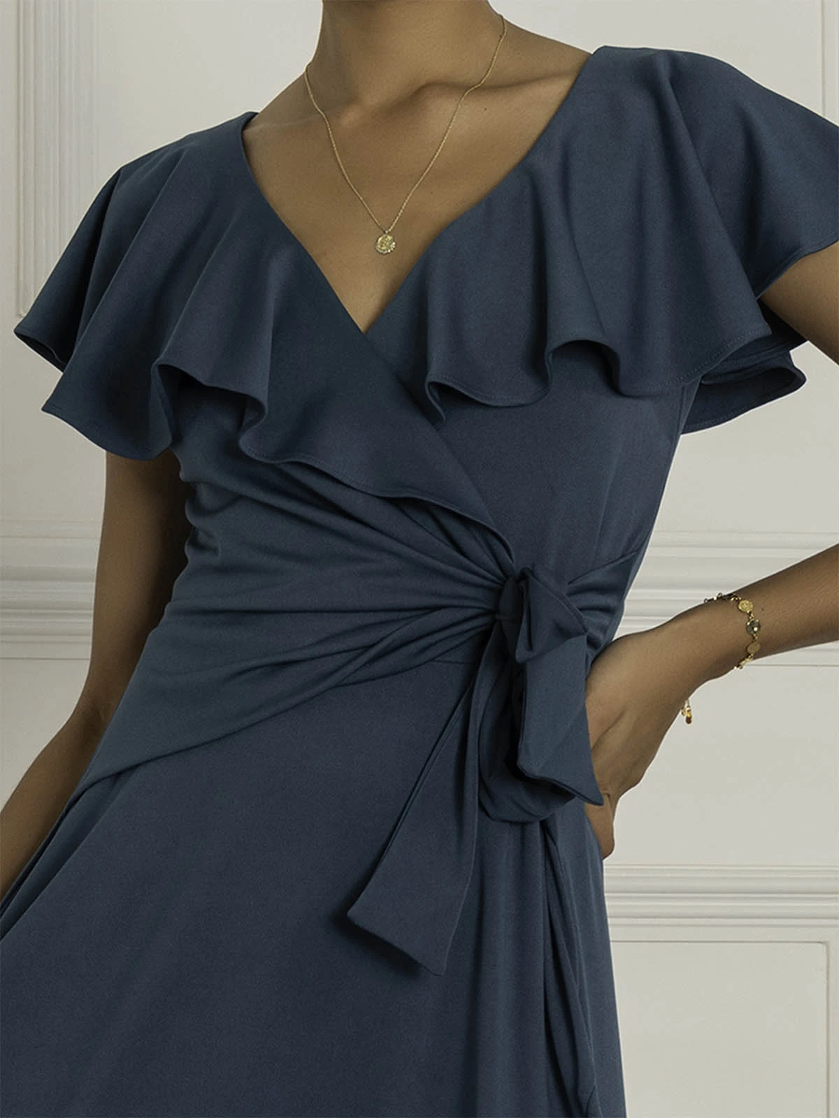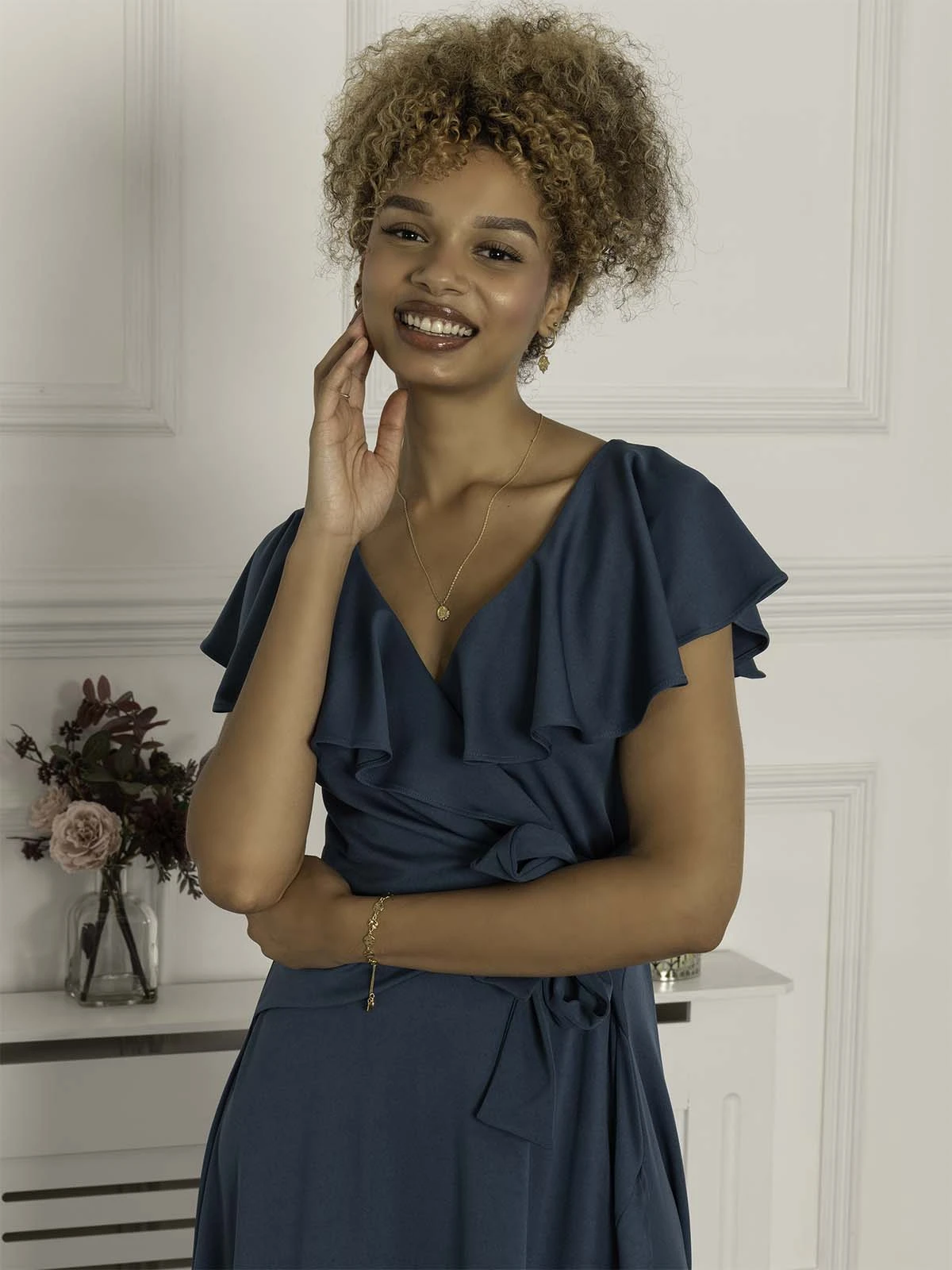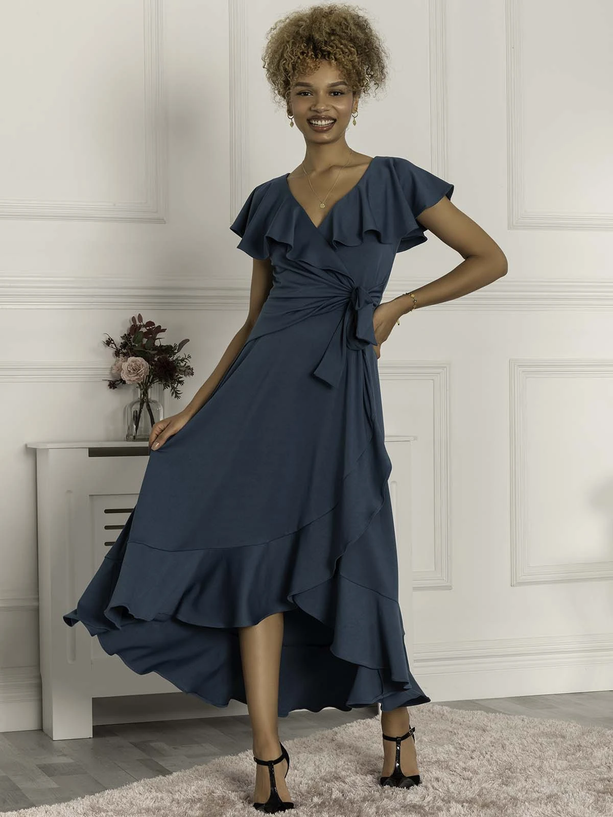 In a flattering fit and flare silhouette, the Priya maxi dress from Jolie Moi has a plain yet elegant design. The dress is made from a stretchy non-static material for all day comfort. Featuring a frilly cap sleeve design that drapes around the v-neckline. Embellished with a tied bow in the front and a high low flared hemline. Perfect for any special occasion whether it be a fancy dinner or a wedding.
