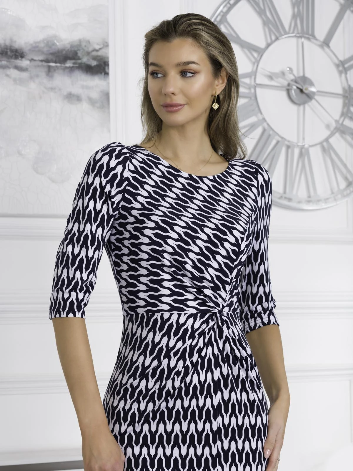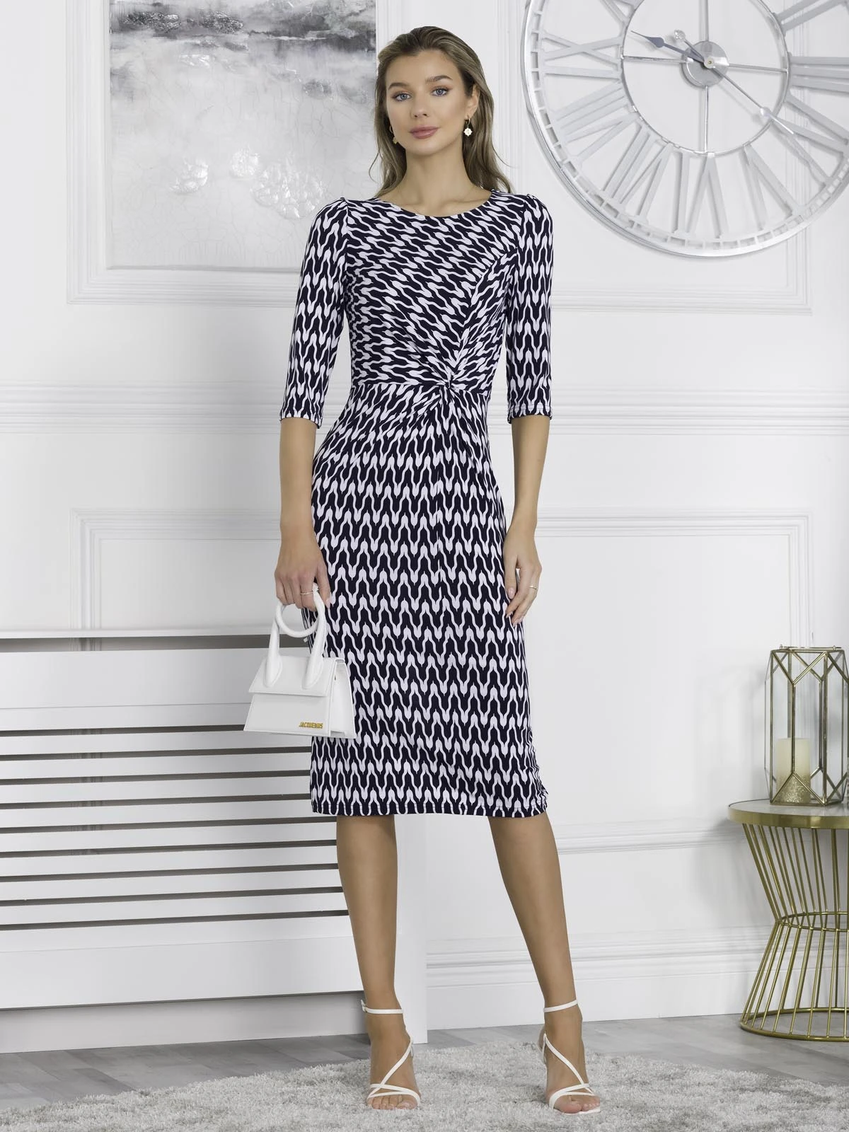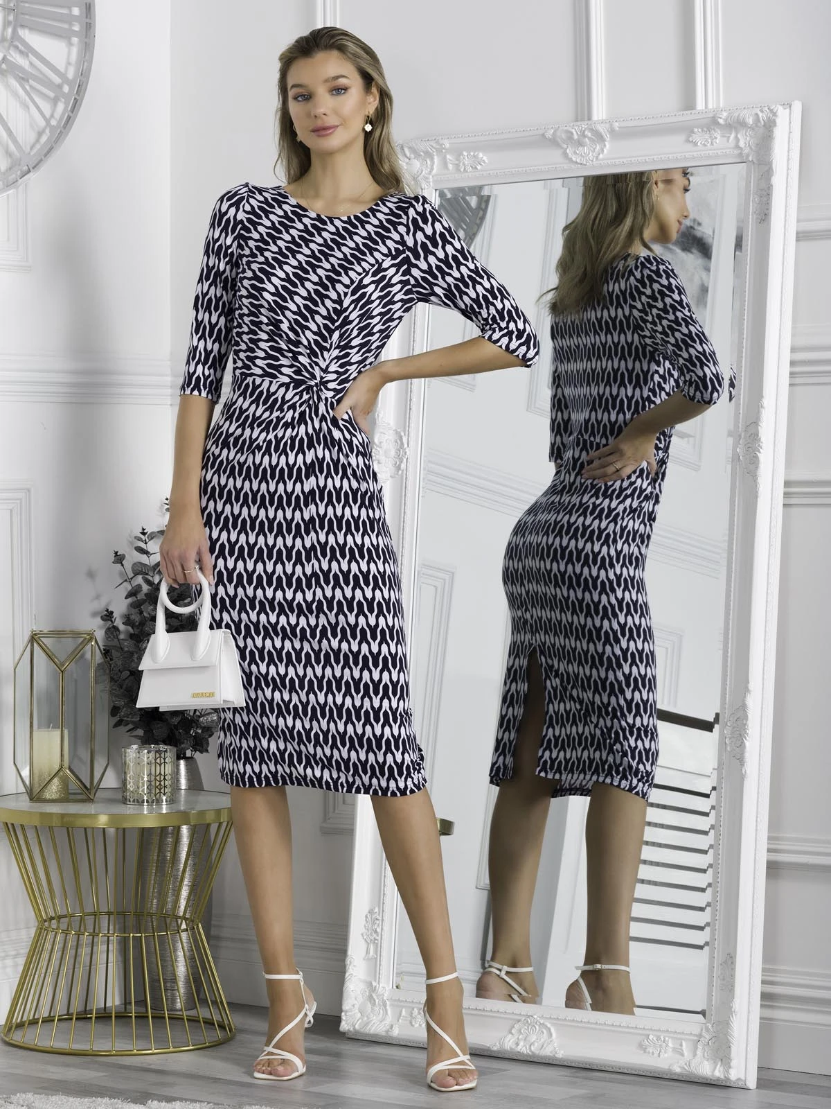 Add a splash of colour to your wardrobe this season with the Qyara midi dress from Jolie Moi. Covered in a striking geometric pattern print, and complimenting your curves with its bodycon shape, short puff sleeves, and a below the knee hem. Crafted from our premium non-static and crease-proof jersey fabric.