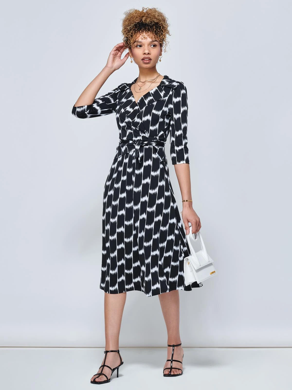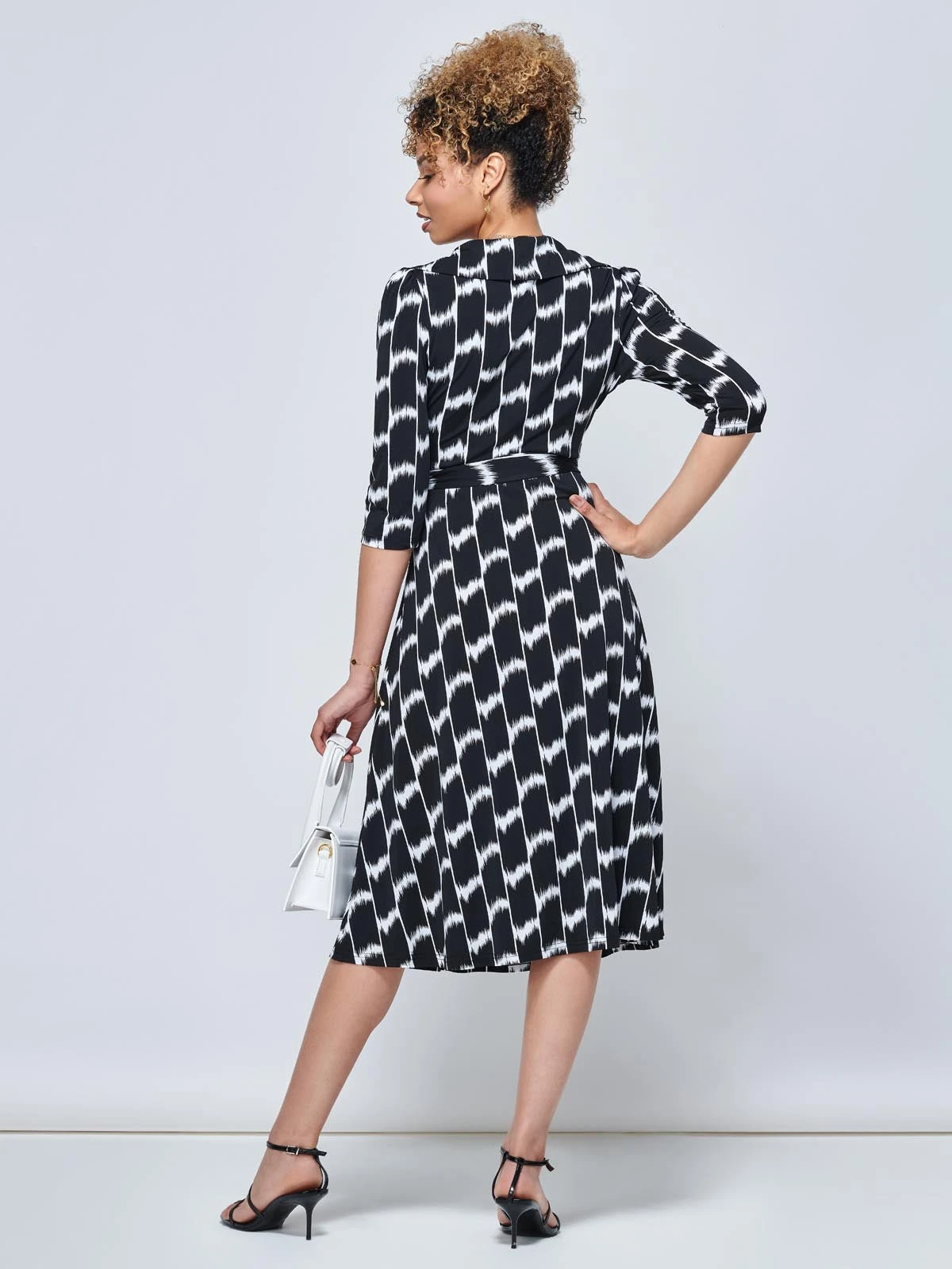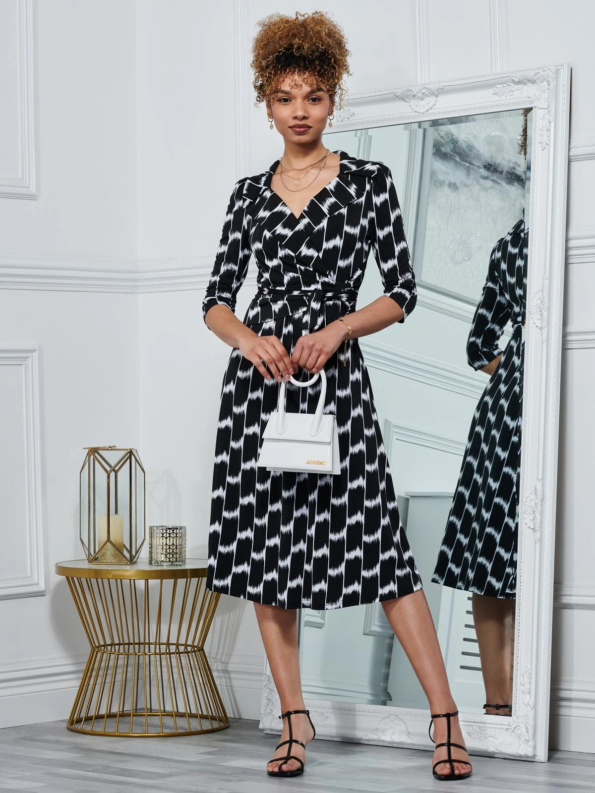 Bringing a new take on the midi dress. The Raegan wrap midi dress by Jolie Moi is made from our signature soft to the touch jersey fabric. The dress features an eye-catching geometric pattern print. The dress features 3/4 length sleeves, a flattering wide v-neckline, smart lapel collar, and a below the knee midi hem design. Guaranteed to stand out in your wardrobe and make you reach for time and time again.