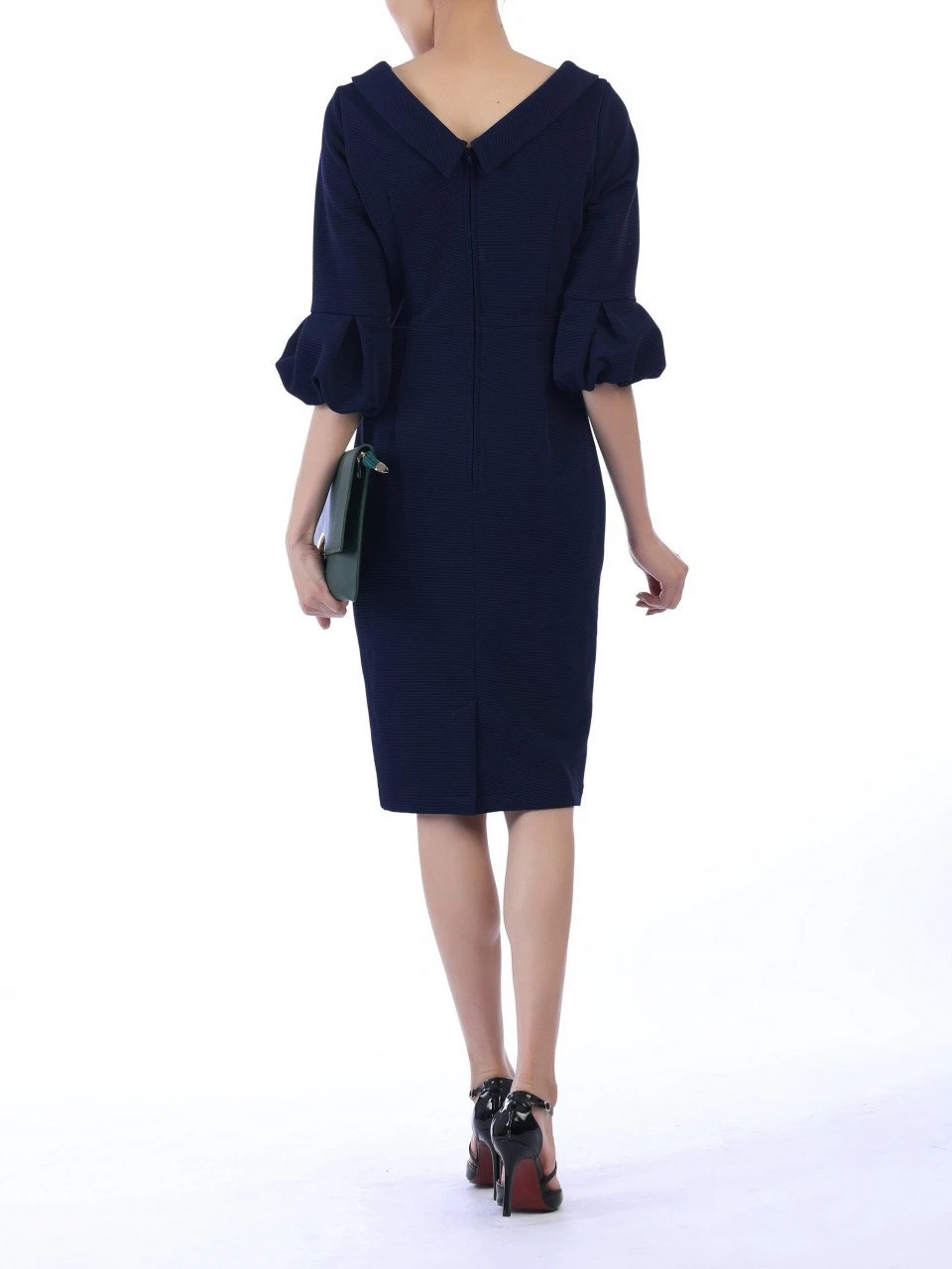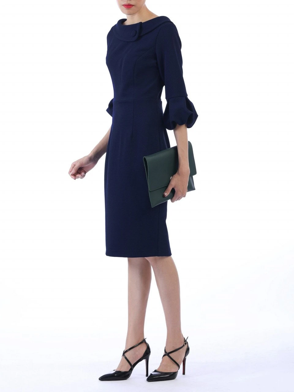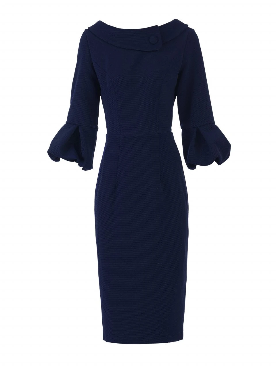 Designed in a contemporary structured silhouette, this dress features feminine three quarter length bell sleeves and an exaggerated roll over collar with a smart button. Completed with a concealed zip to the back and fully lined.Â